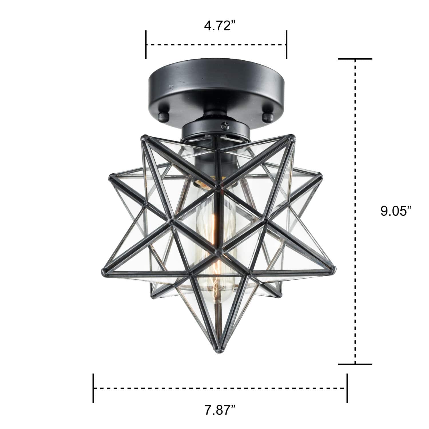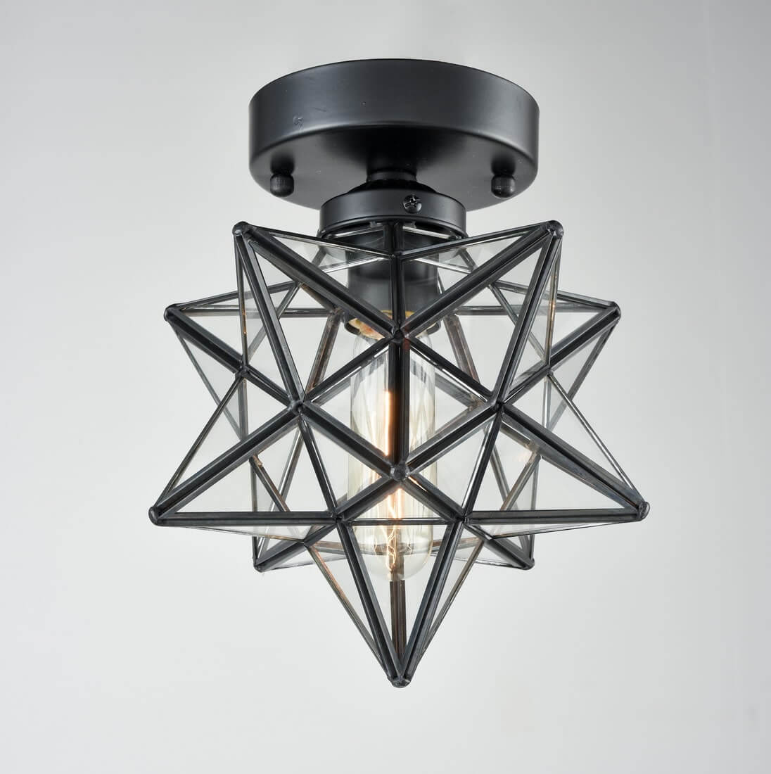 The Moravian star glass shade of the flush mount ceiling light is exquisitely hand-welded and pairs nicely with the black edges featuring copper alloy covering. Being dressed in a semigloss black finish, it imparts a touch of retro-inspired vibe to your living space. The clear glass shade is crafted from impurity-free hand-blown clear glass, making it a appealing addition to your home. It incorporates both exotic and mysterious element and injects a dash of an industrial vibe and boho chic to your home.