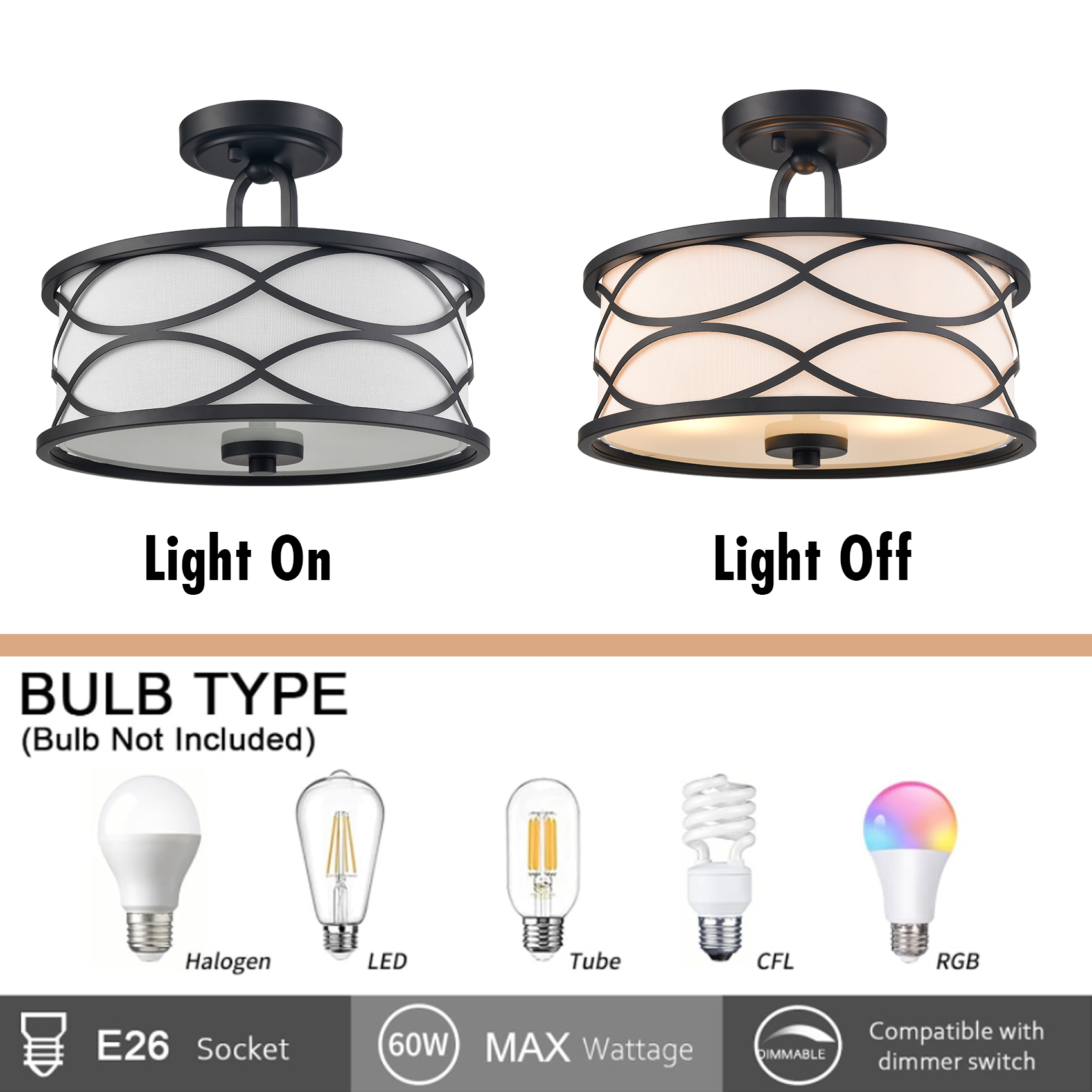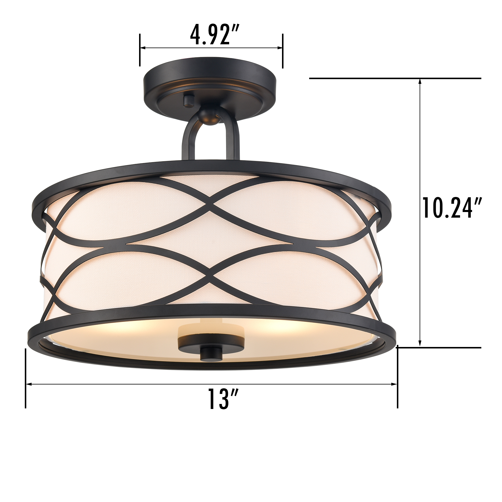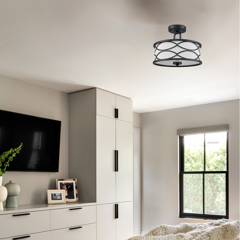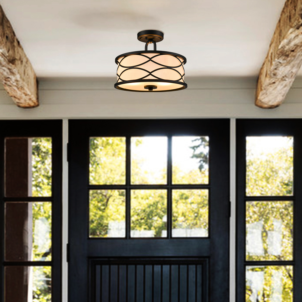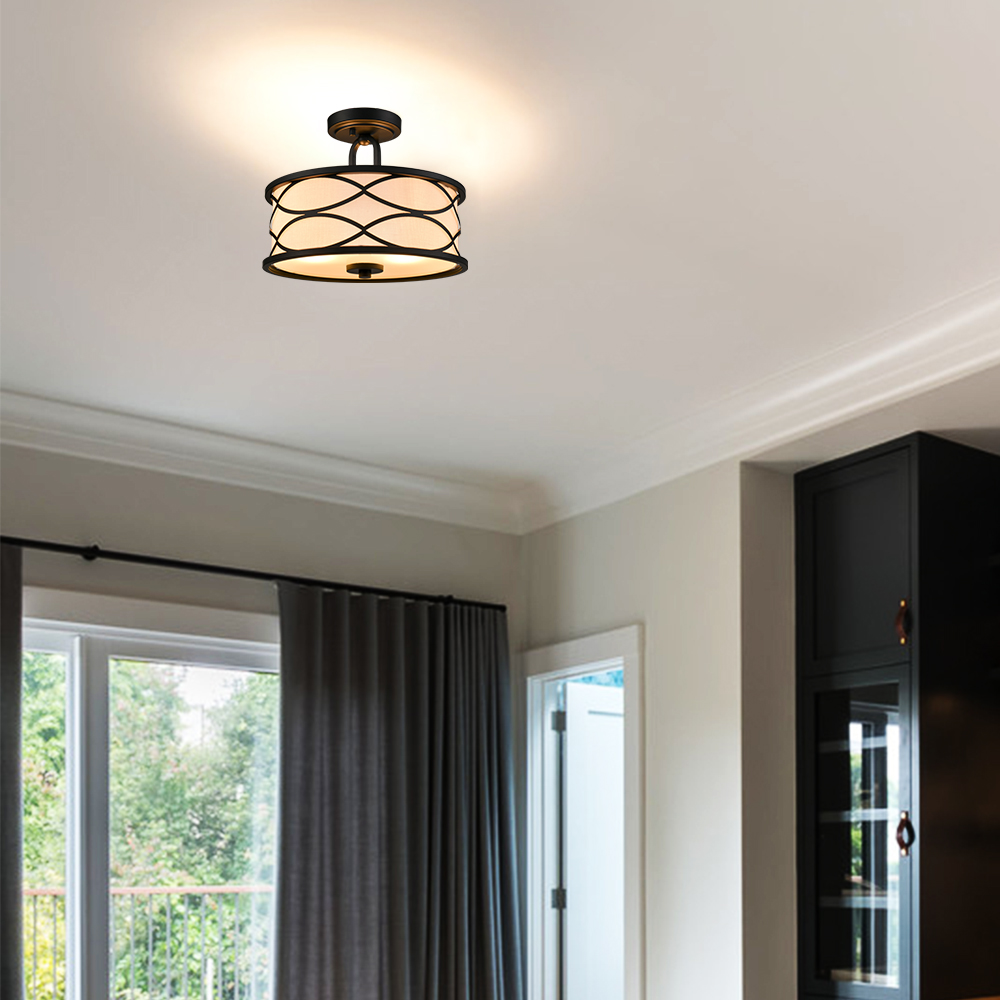 The industrial ceiling light boasts a semigloss black finish, giving your living space a touch of modern sophistication. It doubles up on the drum shades, creating layers of nuanced light. Its inner creamy white fabric drum shade is encircled and protected by a bigger metal drum shade featuring intersecting arches, flaunting elegant geometry and adding a ton of eye appeal to the scene. The light pouring through the fabric lampshade is gently muted and fills the room without any glare. Its black metal cage contrasts the creamy white fabric shade and adds alluring visual interest to the living area. The industrial ceiling light comes with a diffuser crafted of tempered frosted glass, casting an enchanting aura of elegance to the space.