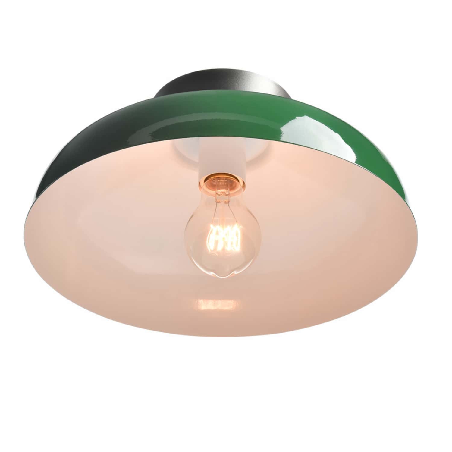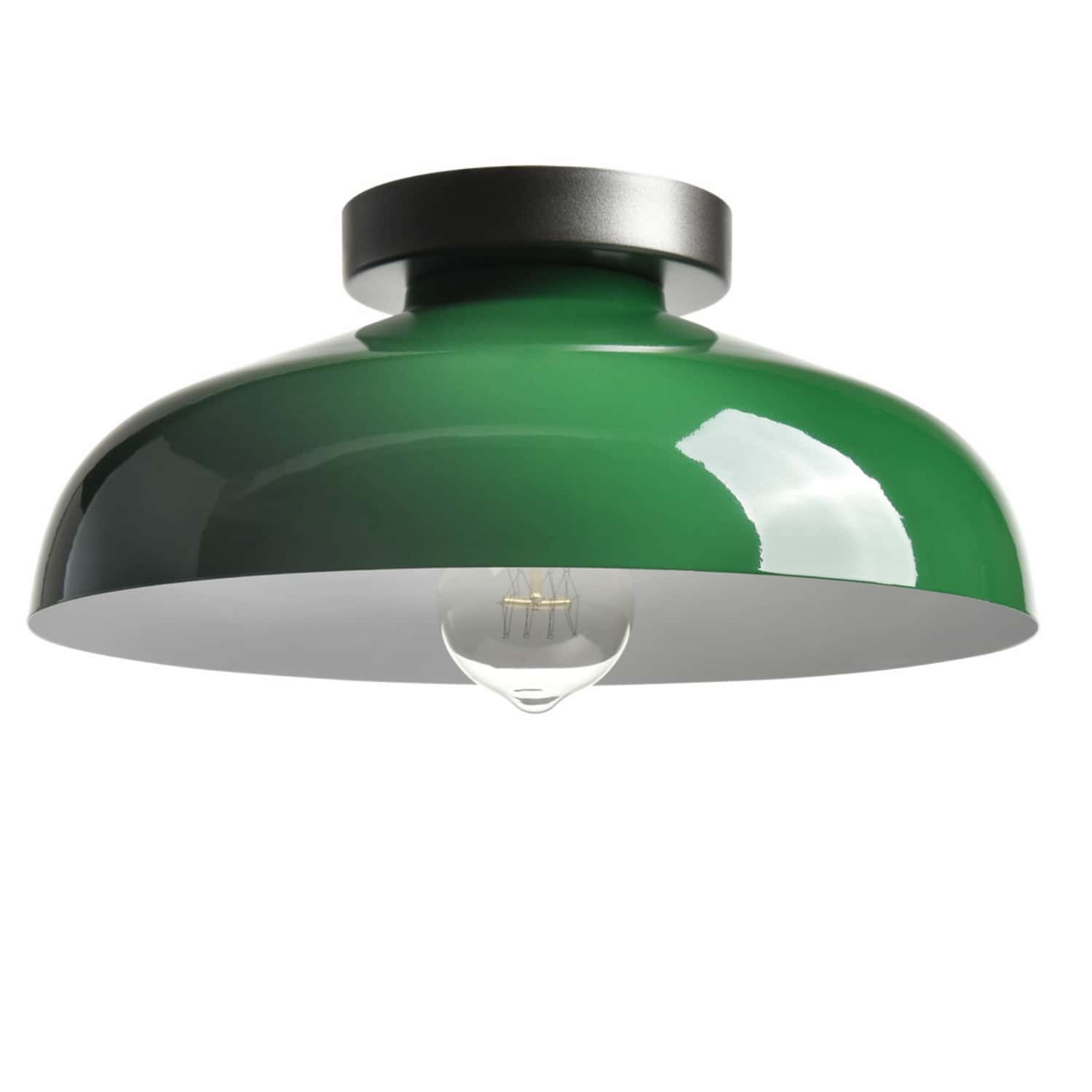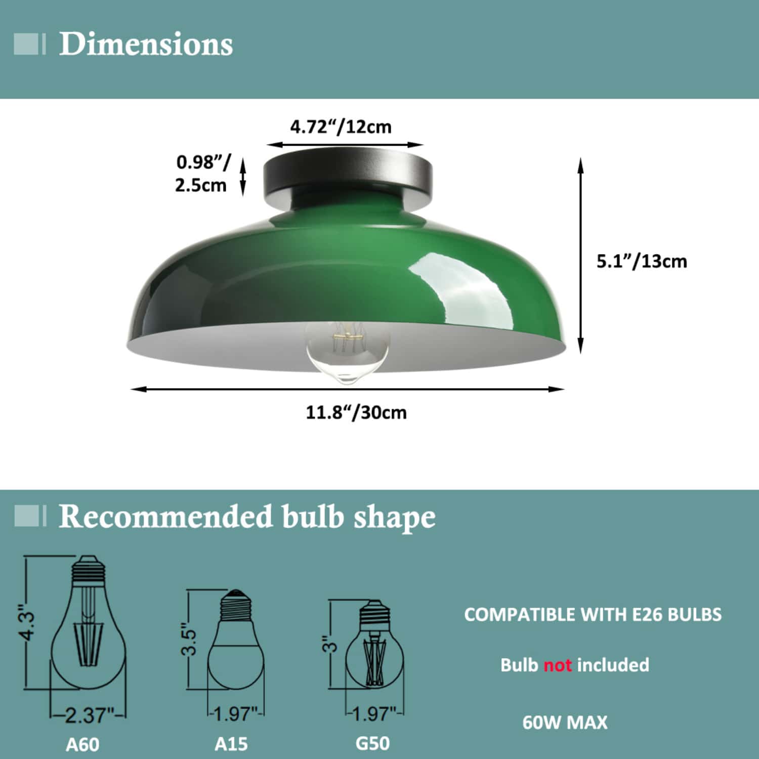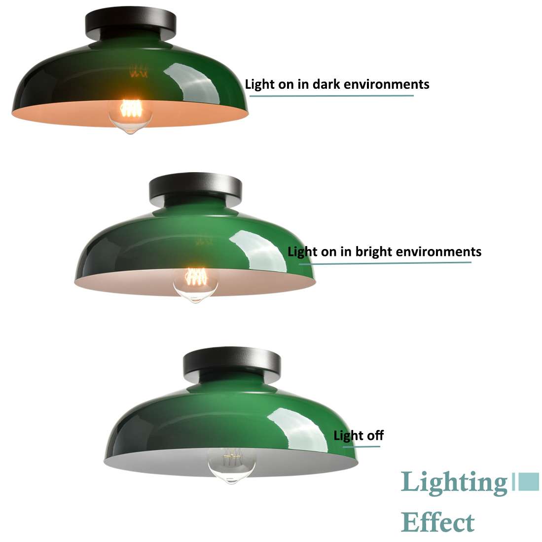The industrial ceiling light’s canopy sports a dark gray finish, lending an understated elegance. Its metal barn shade boasts a rustproof green finish. Its mix of finishes encompasses both a dash of drama and a touch of modernity, yet maintains an industrial edge. The barn shade flaunts a white finish on the inner surface, which allows more light to reflect. The barn shade rounds out the design and elevates your interior with a touch of geometry. Its dark gray finish offers a stark contrast to the green barn shade and adds alluring eye appeal to the space. Its green lampshade gives your home a snappy look and a glamorous, refreshing vibe.