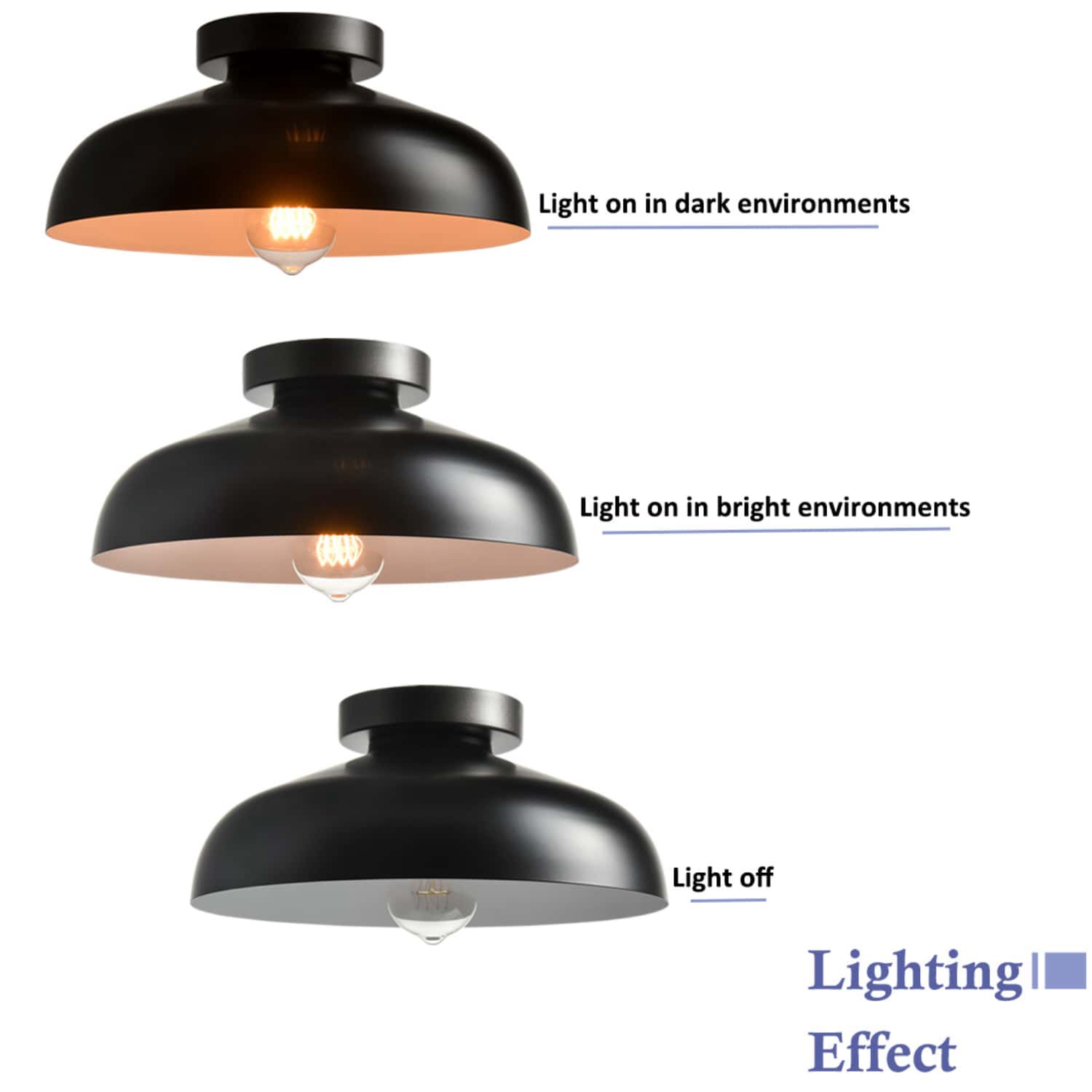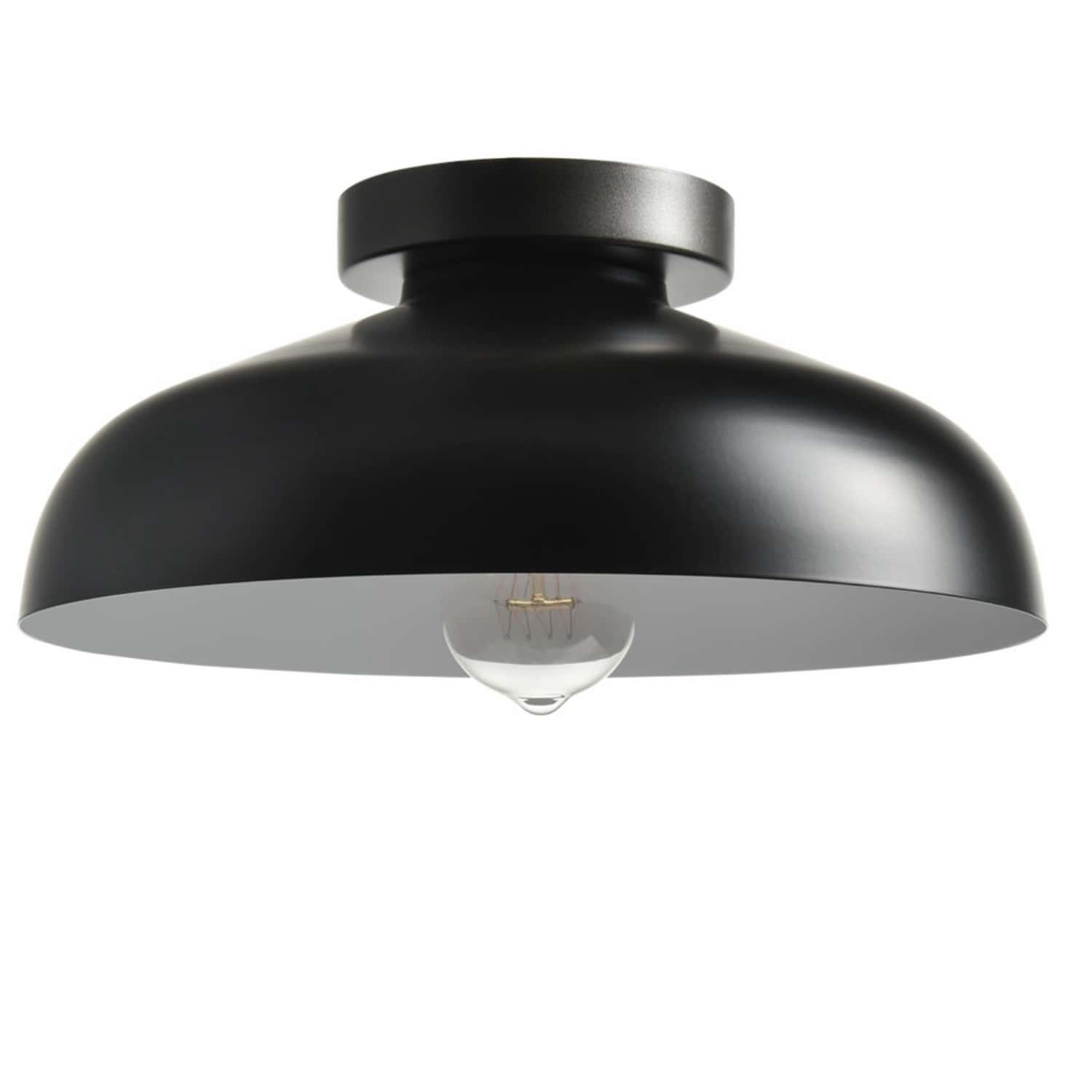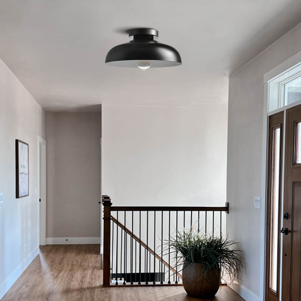 The industrial ceiling light’s canopy sports a dark gray finish, lending an understated elegance. Its metal barn shade boasts a rustproof black finish. Its mix of finishes encompasses both a dash of drama and a touch of modernity, yet maintains an industrial edge. The barn shade flaunts a white finish on the inner surface, which allows more light to reflect. The barn shade rounds out the design and elevates your interior with a touch of geometry. Its dark gray finish offers a stark contrast to the black barn shade and adds alluring eye appeal to the space.