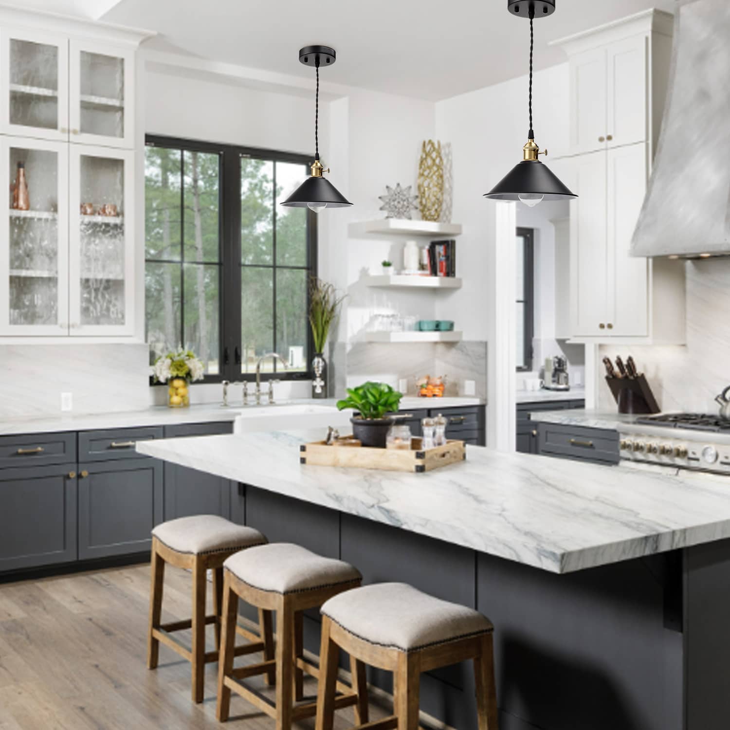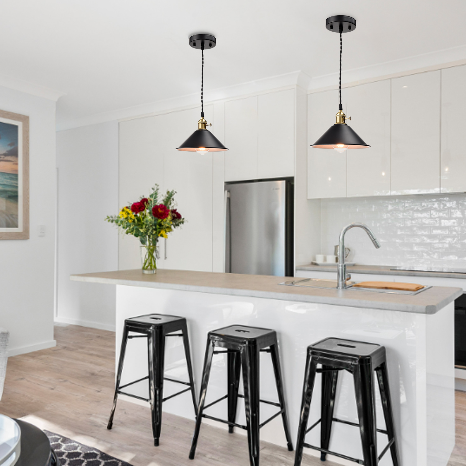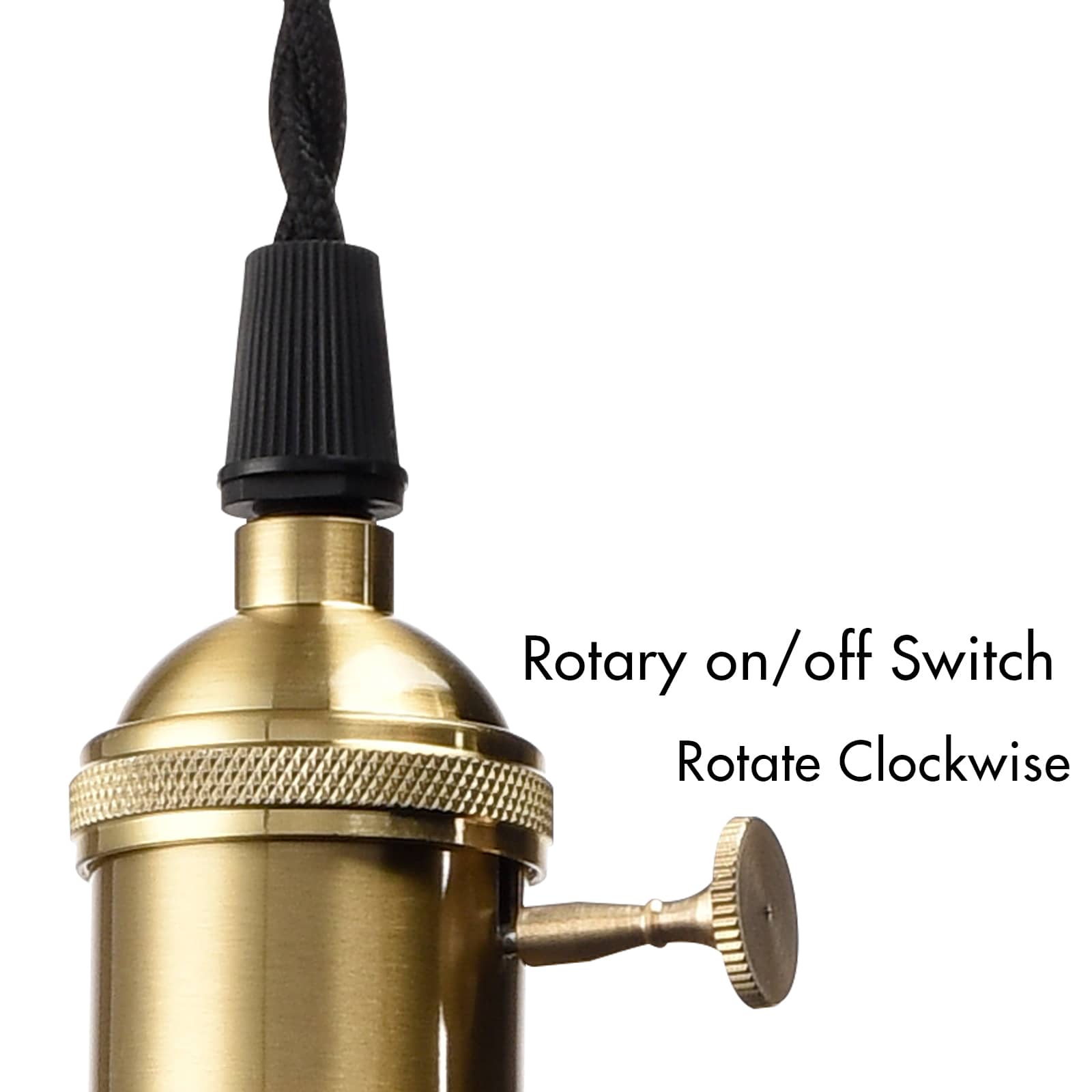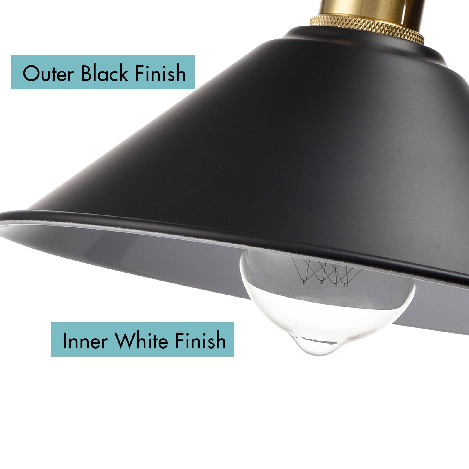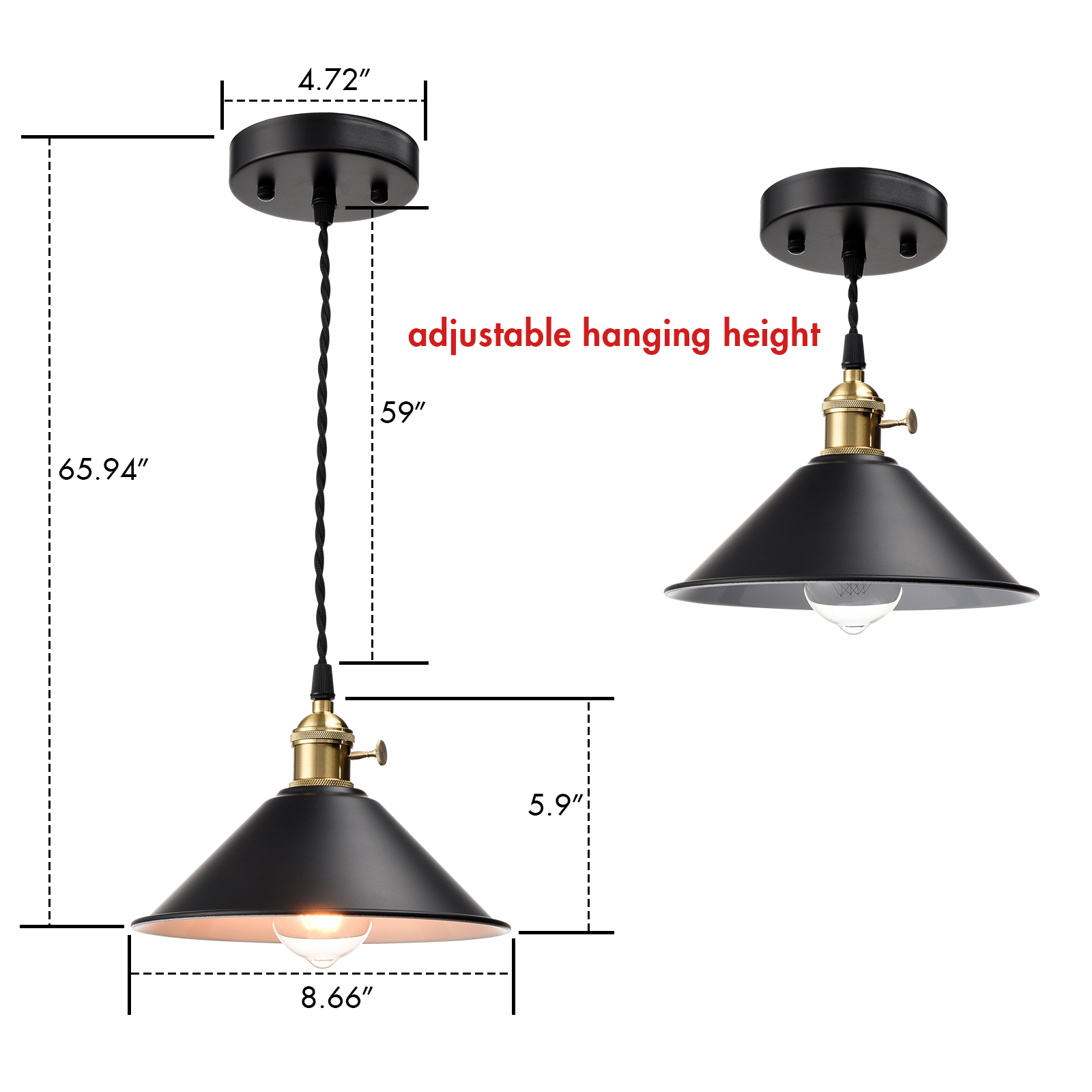 The industrial farmhouse pendant light’s cone shade, hanging cord, and canopy show off a black finish while its lamp holder and rotary switch flaunt a gold finish. The white interior of the cone shade helps reflect the light. A mix of finishes encompasses both a dash of drama and a touch of modenity, yet maintains an industrial edge. Its cone shade rounds out the design and elevates your interior with a touch of geometry. Its shiny gold finish offers a stark contrast to the black finish and adds alluring eye appeal to the space. Feel free to turn on/off the pendant light with the rotary switch on the lamp holder. It comes with a 59-inch adjustable cord to suit your different lighting needs.