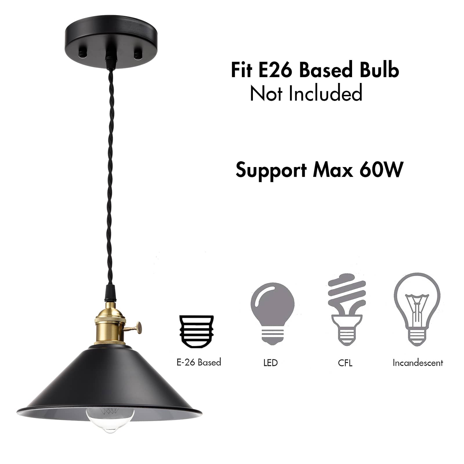 The pendant light fixture comes with one E26-base socket which is compatible with a variety of bulb types: LED, INCANDESCENT, CFL.