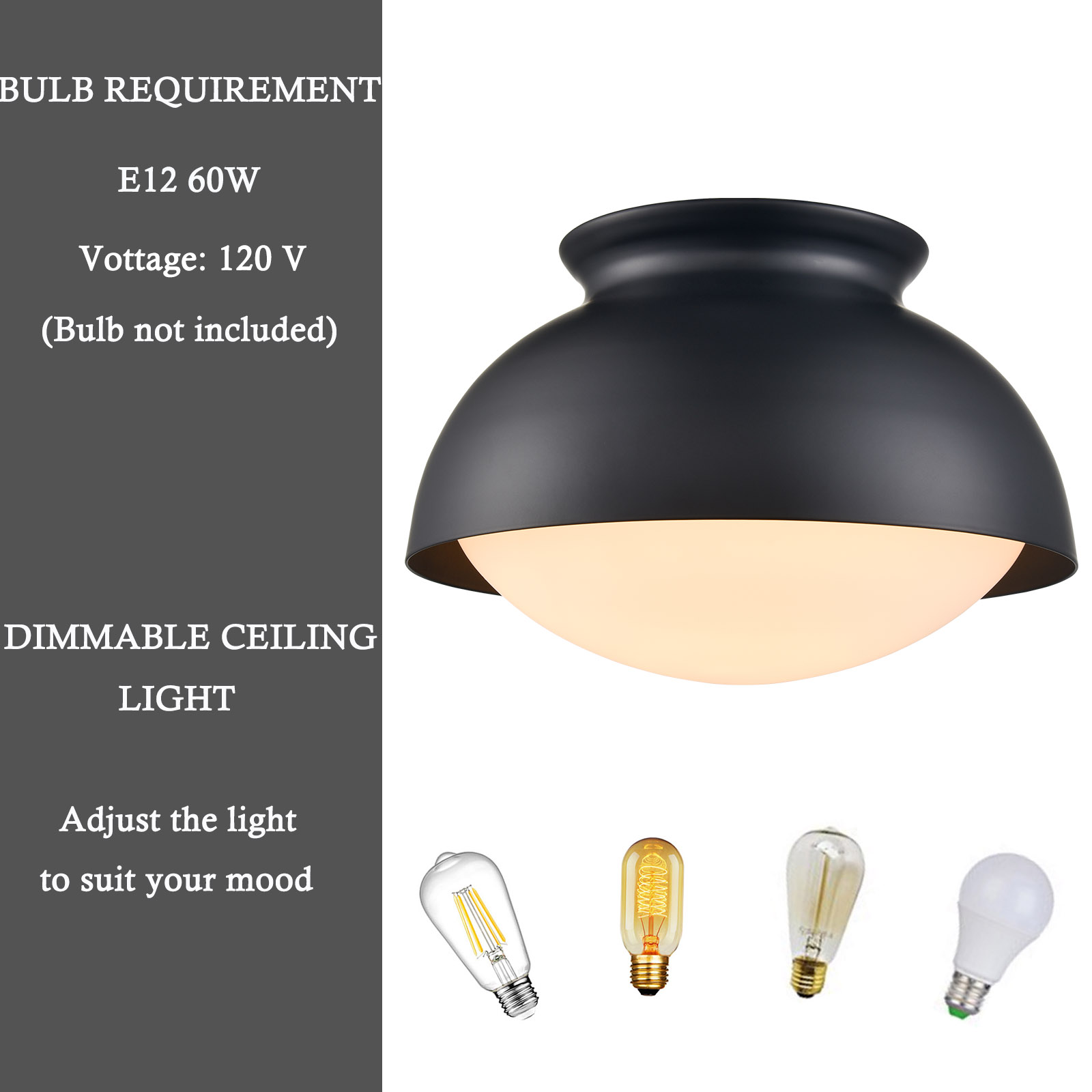 The flush mount ceiling light comes with one E12-base socket which is compatible with a variety of bulb types: LED, INCANDESCENT, CFL.