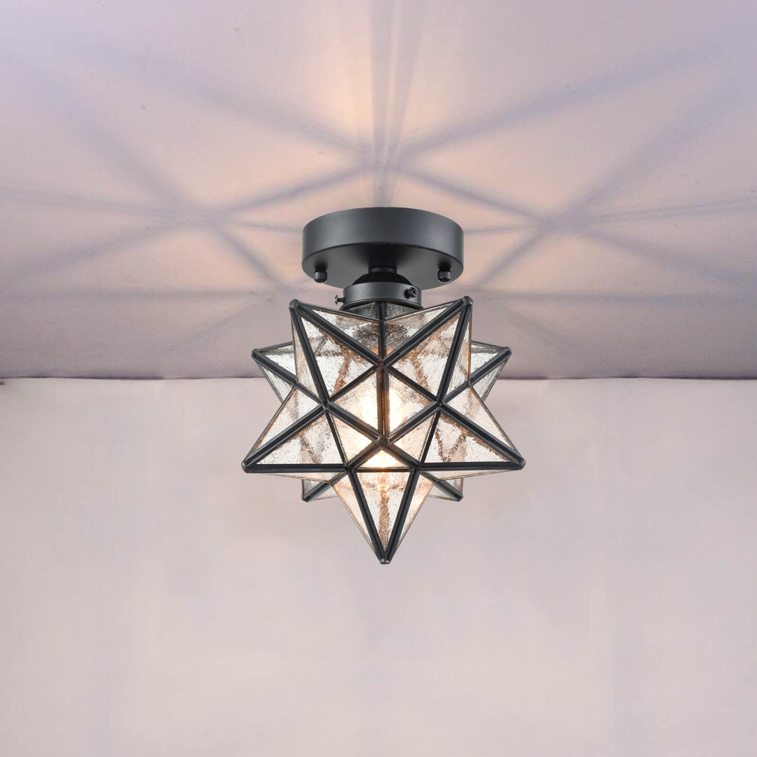 Crafted of impurity-free seeded glass, the Moravian star glass shade of the flush mount ceiling light is exquisitely hand-welded and pairs nicely with the black edges featuring copper alloy covering. It is dressed in a rustproof semigloss black finish, instilling a touch of vintage chic to your living space. It incorporates both exotic and mysterious element and injects a dash of modern and boho chic to your living space. A hinged access door can be opened for bulb replacement. With opaque and dreamy seeded glass, it emits a subtle and amazing glow to create a comfy ambiance.