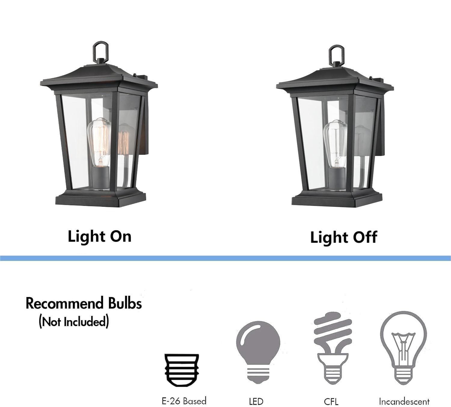 The outdoor wall-mounted light fixture comes with 1 E26-base socket which is compatible with a variety of bulb types: LED, INCANDESCENT, CFL.