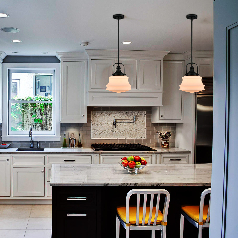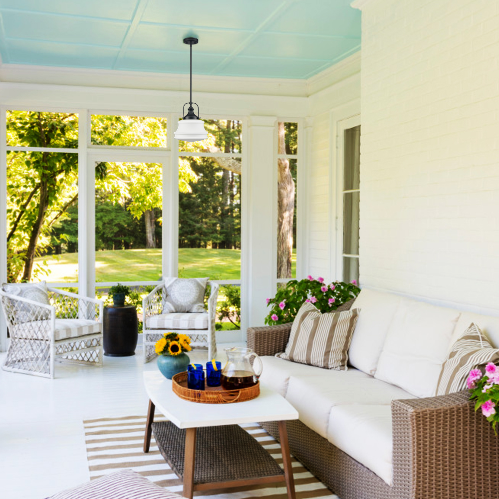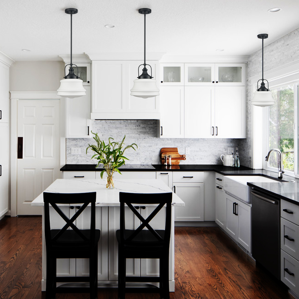 The black schoolhouse hanging light’s canopy, hanging rods, and lamp-holder boast a semi-gloss black finish, pepping up your space with a touch of urban sophistication. Crafted of impurity-free hand-blown milk glass, its schoolhouse-inspired lampshade looks like a special drum shade with soft curves. Being a beautifully detailed glasswork, it generates an understated look that will impress. Its canopy features an adapter to accommodate sloped ceilings. It comes with three 12-inch rods and one 6-inch rod to suit your different lighting needs.