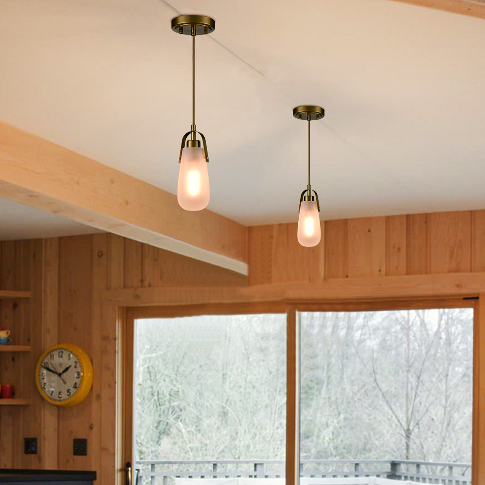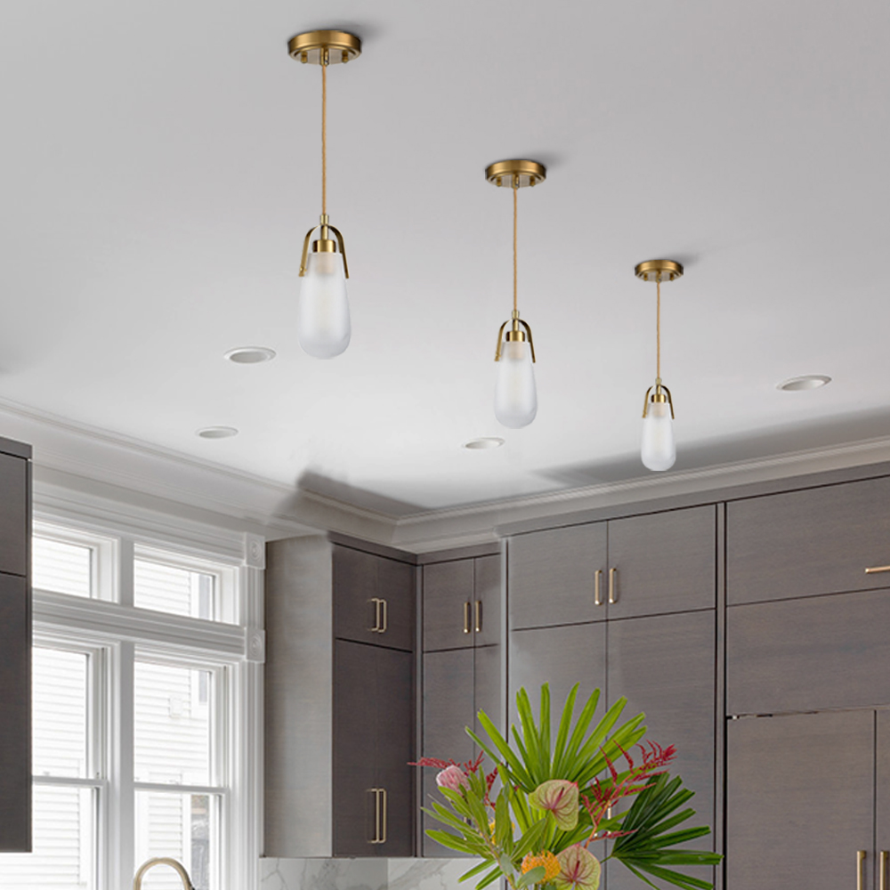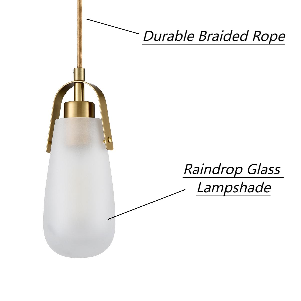 The industrial home pendant light flaunts a gleaming electrophoretic brass finish, pepping up your interior with a touch of glitz. Showing off a raindrop-inspired silhouette, the glass shade draws the eye upward to a beautiful display of glass and metal. Its glass shade is topped with an arched metal slat, bringing an unrivaled level of sophistication. Its celestial-inspired lampshade contrasts the brass finish and adds alluring visual interest. It catches the light to create intriguing light effects and shades and provides generous ambient illumination to your home. The glass shade shows off a thicker bottom, which makes the glow shining through the light more charming and softer after refraction. It comes with a 59.06-inch adjustable hanging cord.