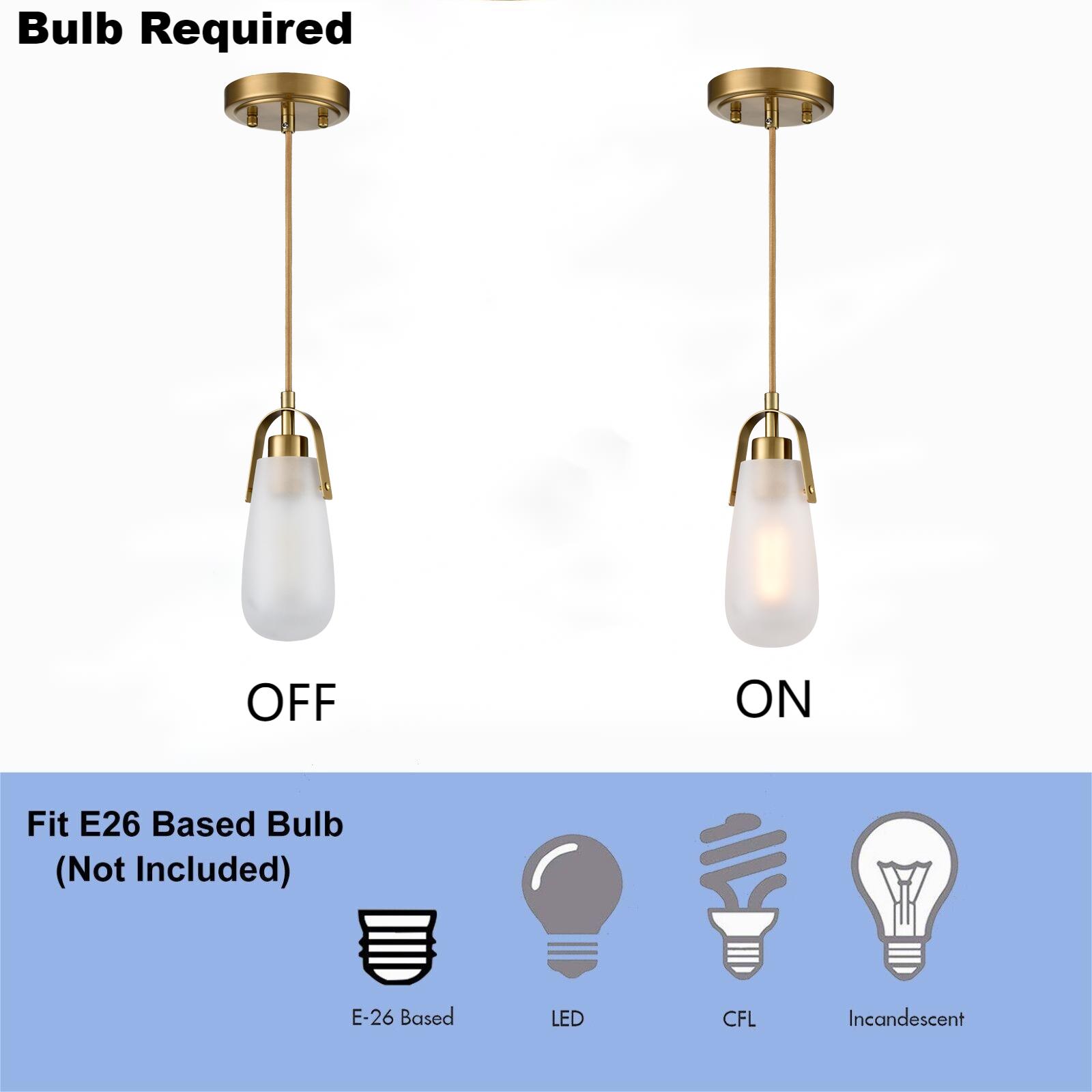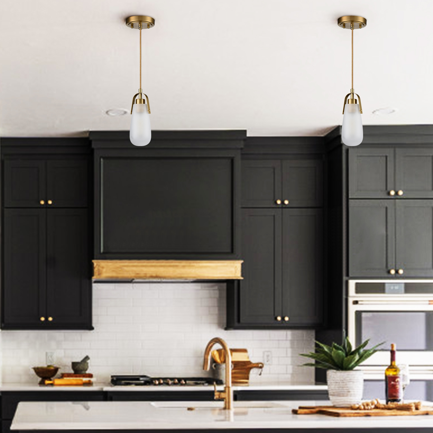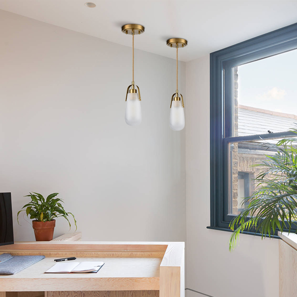 The industrial home pendant light flaunts a gleaming electrophoretic brass finish, pepping up your interior with a touch of glitz. Showing off a raindrop-inspired silhouette, the glass shade draws the eye upward to a beautiful display of glass and metal. Its glass shade is topped with an arched metal slat, bringing an unrivaled level of sophistication. Its celestial-inspired lampshade contrasts the brass finish and adds alluring visual interest. It catches the light to create intriguing light effects and shades and provides generous ambient illumination to your home. The glass shade shows off a thicker bottom, which makes the glow shining through the light more charming and softer after refraction. It comes with a 59.06-inch adjustable hanging cord.