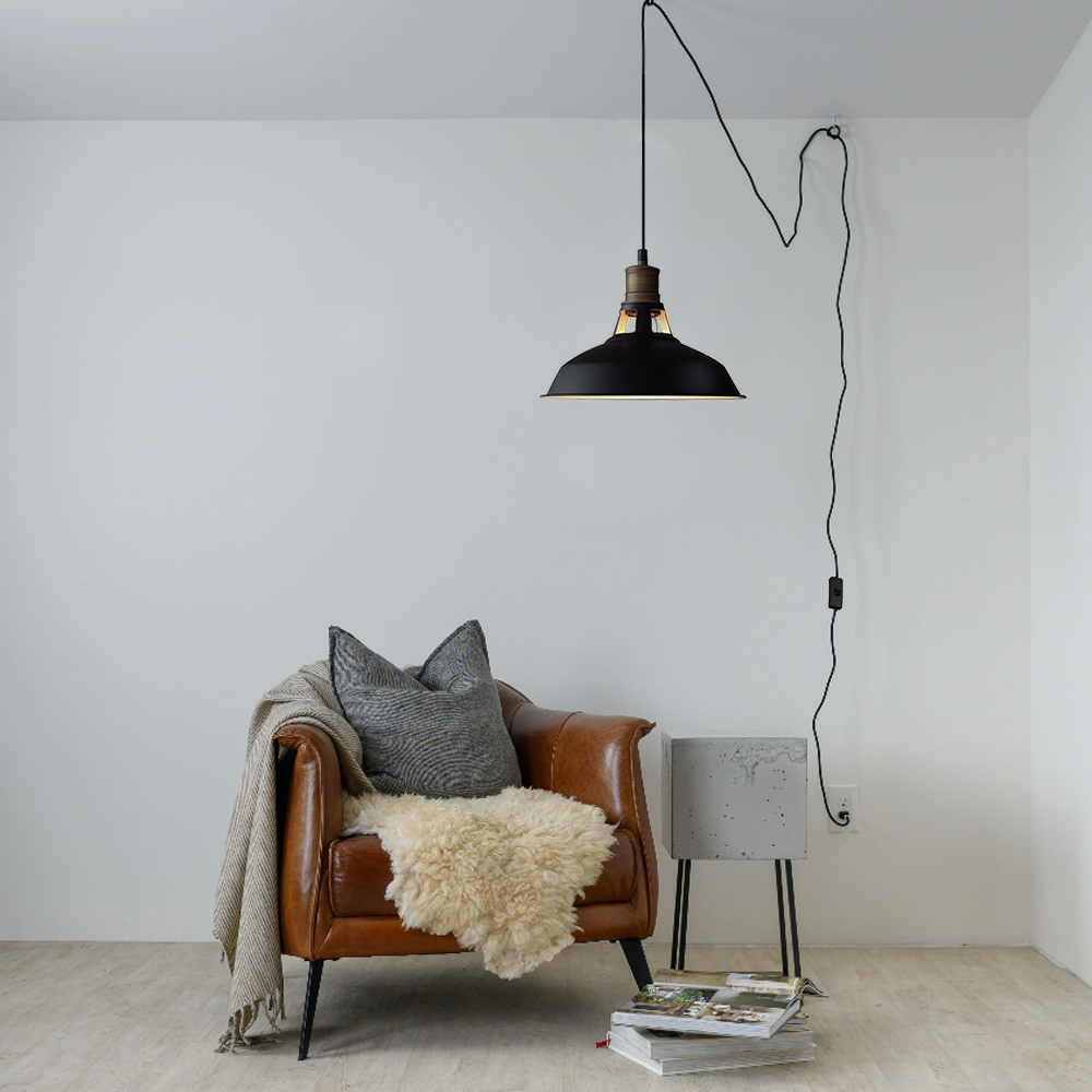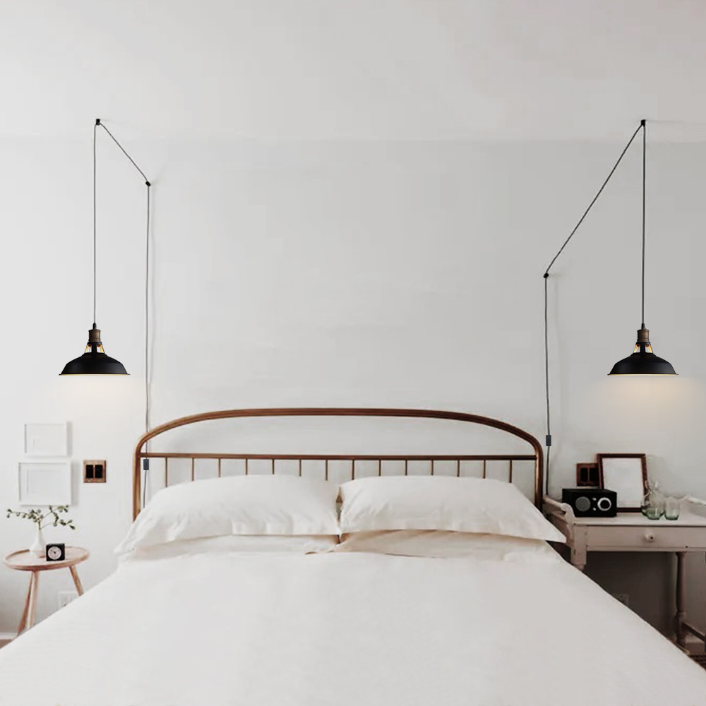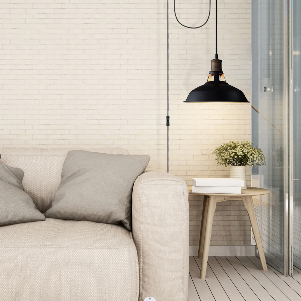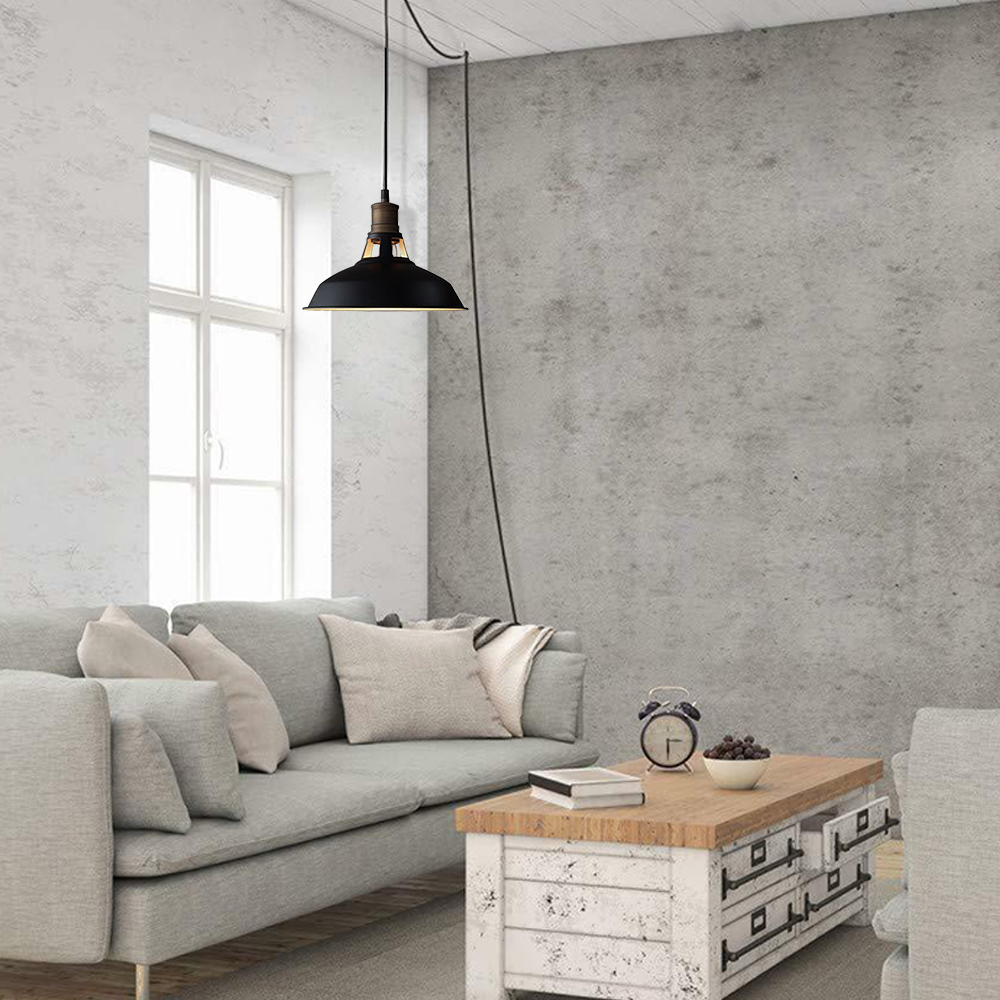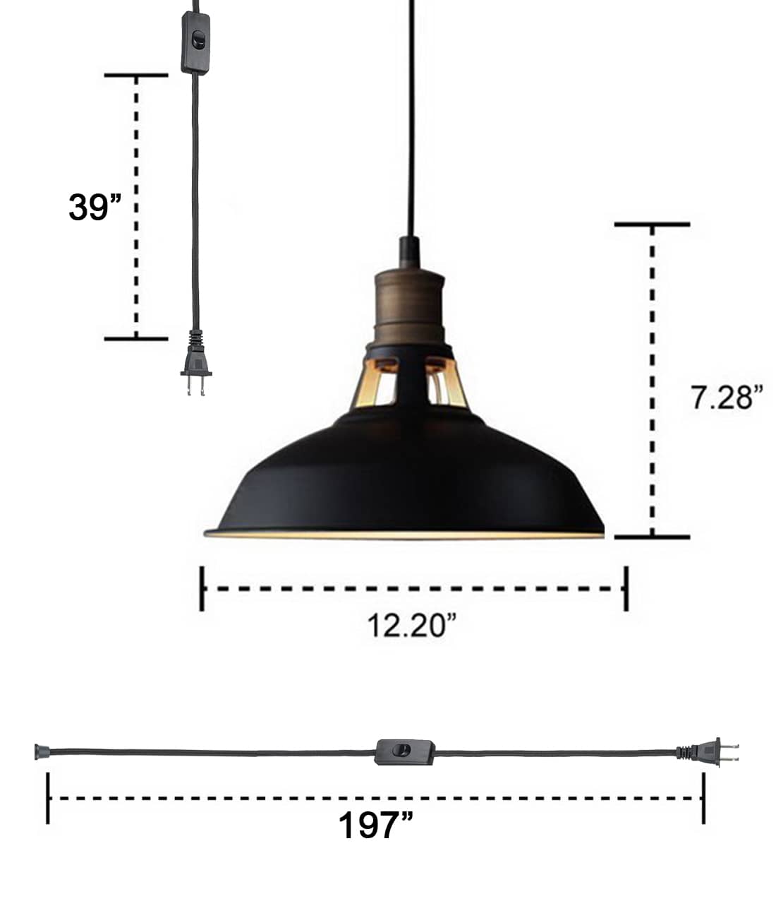 Crafted with solid metal, the plug-in pendant lights’ barn shades provide stunning decorative detail with their matte black finish. Their barn shades flaunt a white finish on the inner surface. The white interior of the lampshades helps reflect the light. What makes the pendant lights so unique is the hollow design on the upper part of their lampshade and the fact that you can directly see the bulb through the hollow part. Each pendant light boasts a lamp holder finished in antique brushed bronze. A mix of finishes encompasses both industrial qualities and farmhouse elements, yet maintains a classic touch. You can easily turn on/off the lights with the toggle switch which is 39 inches away from the plug. Each pendant light comes with a 197-inch plug-in cord.