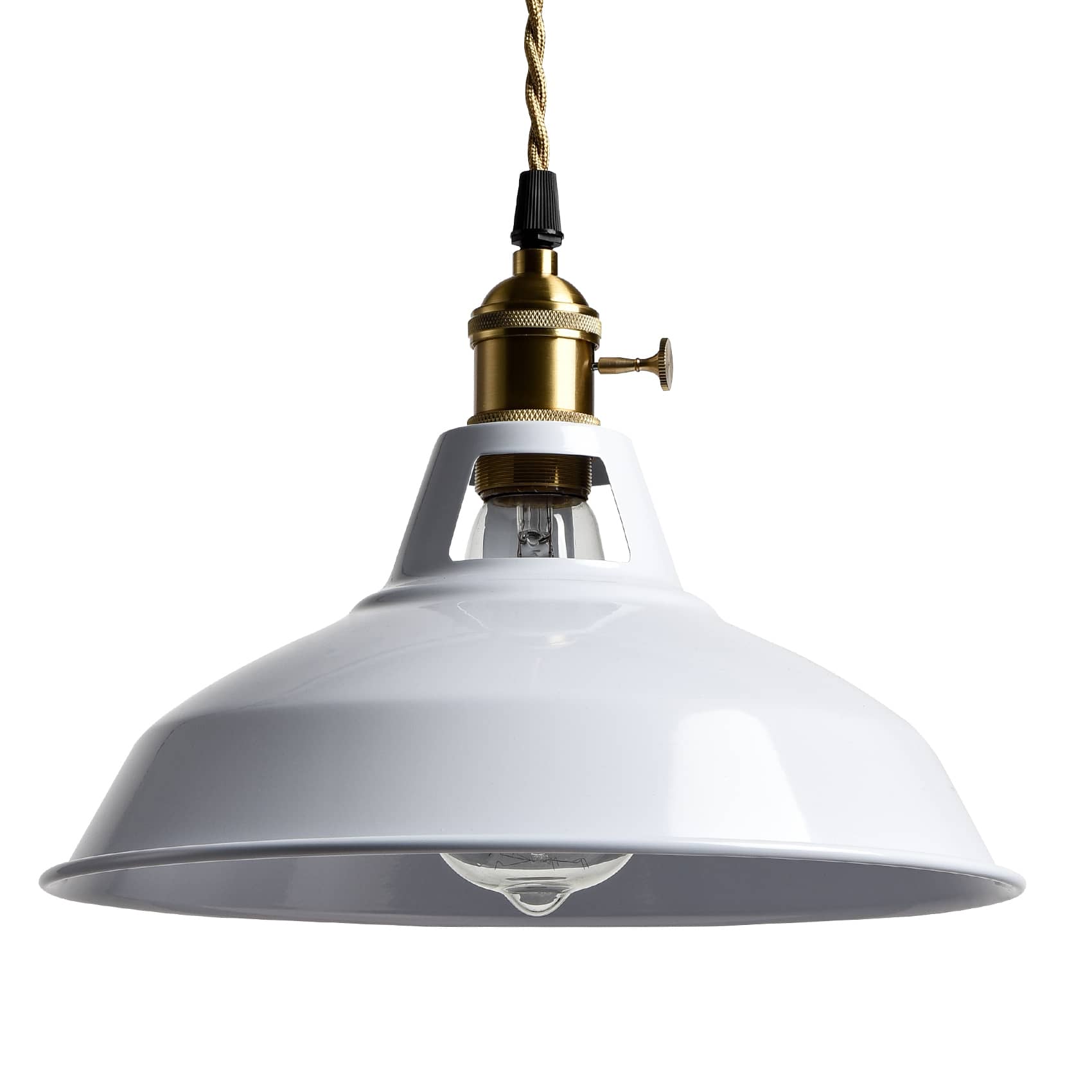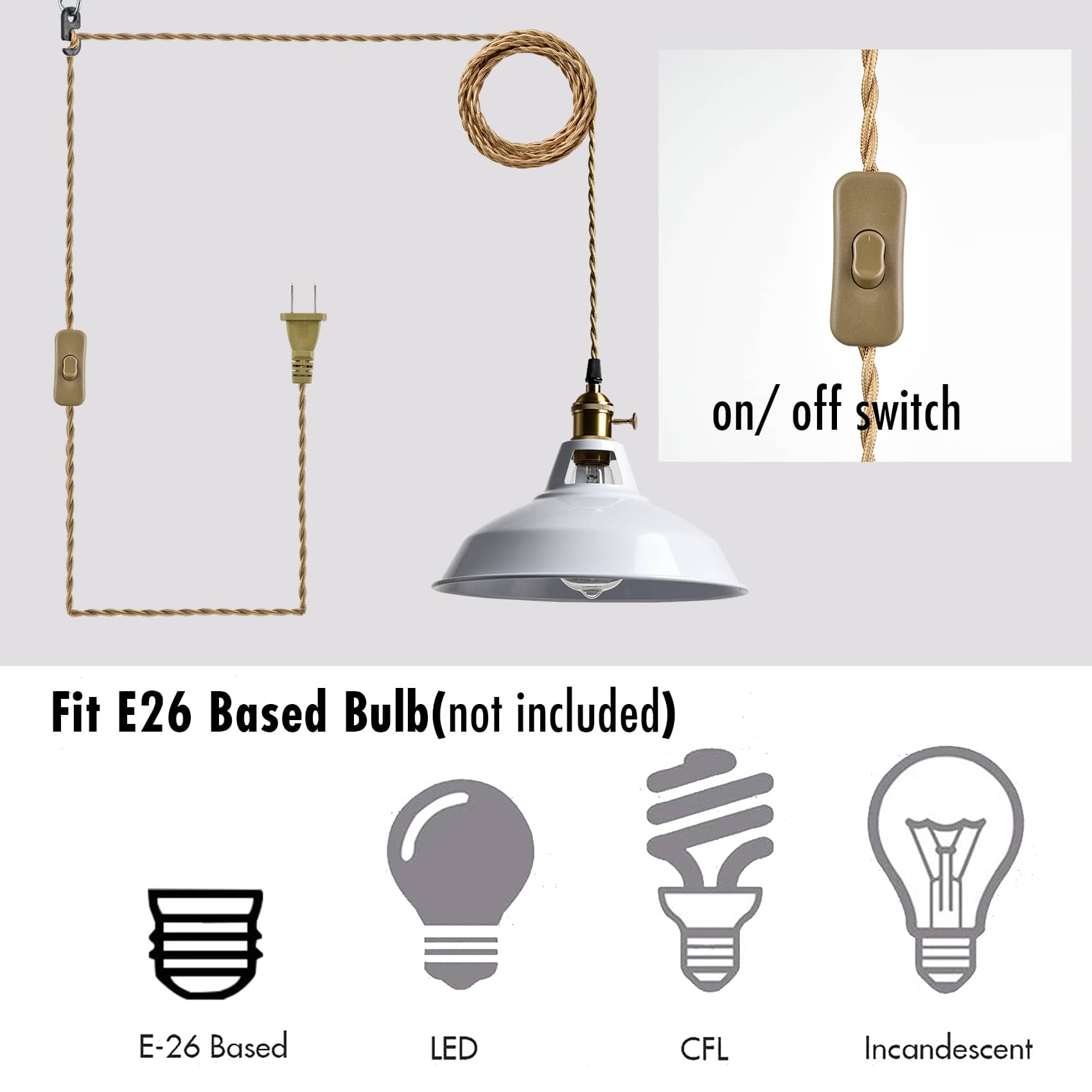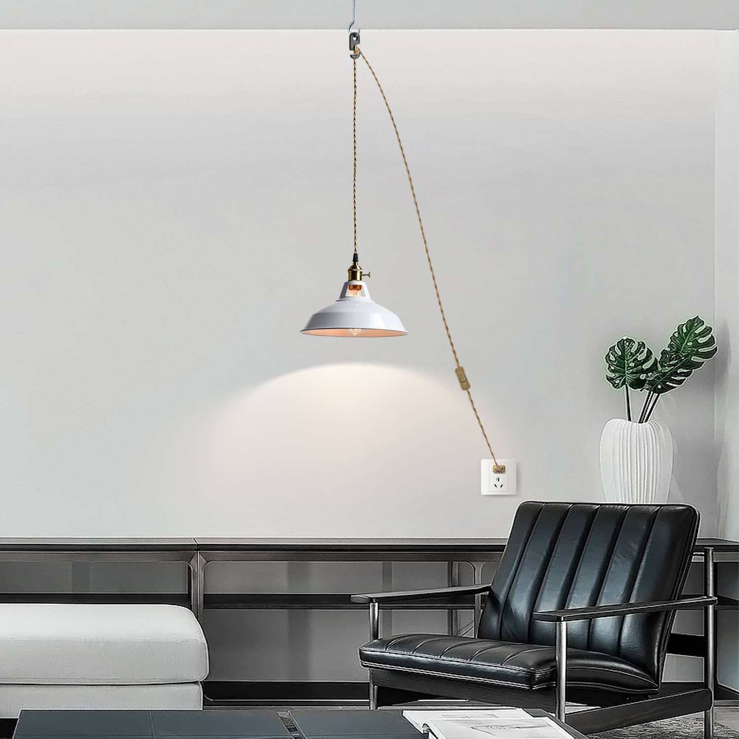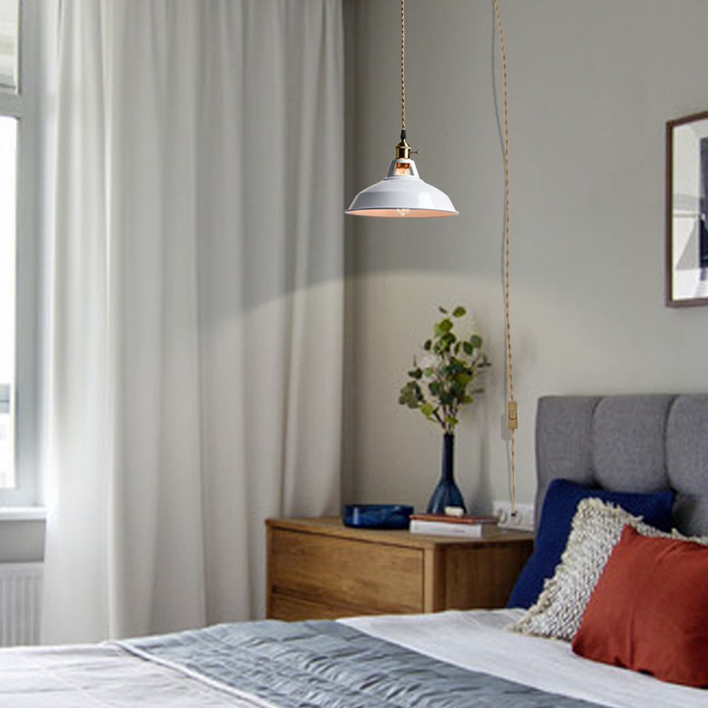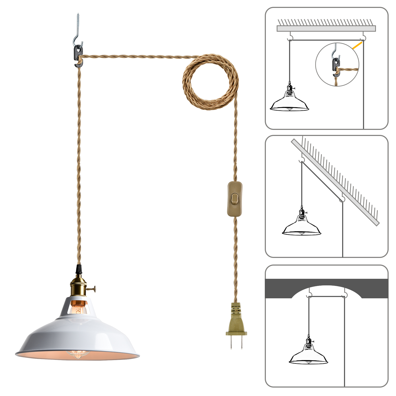 The plug-in pendant light’s barn shade shows off a white finish while its lamp holder, rotary switch, and plug-in cord flaunt a gold finish. The white interior of the barn shade helps reflect the light. A mix of finishes encompasses both a dash of drama and a touch of shimmer, yet maintains a modern edge. Its white finish gives your home a snappy look and a glamorous, refreshing vibe. Its shiny gold finish offers a stark contrast to the white finish and adds alluring eye appeal to the space. The switch on the plug-in cord and the rotary switch on the lamp holder are just on/off switches without a dimming function. It comes with a 216.5-inch fabric plug-in cord to suit your different lighting needs. It can accommodate sloped or vaulted ceilings.
