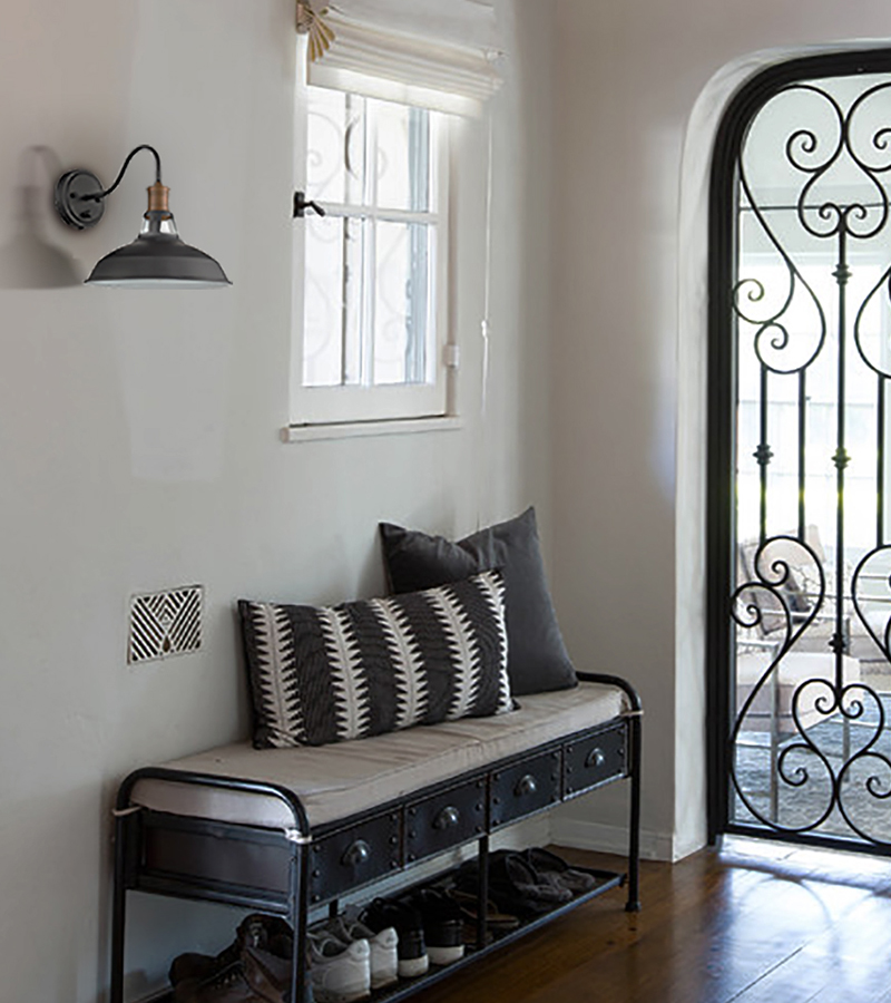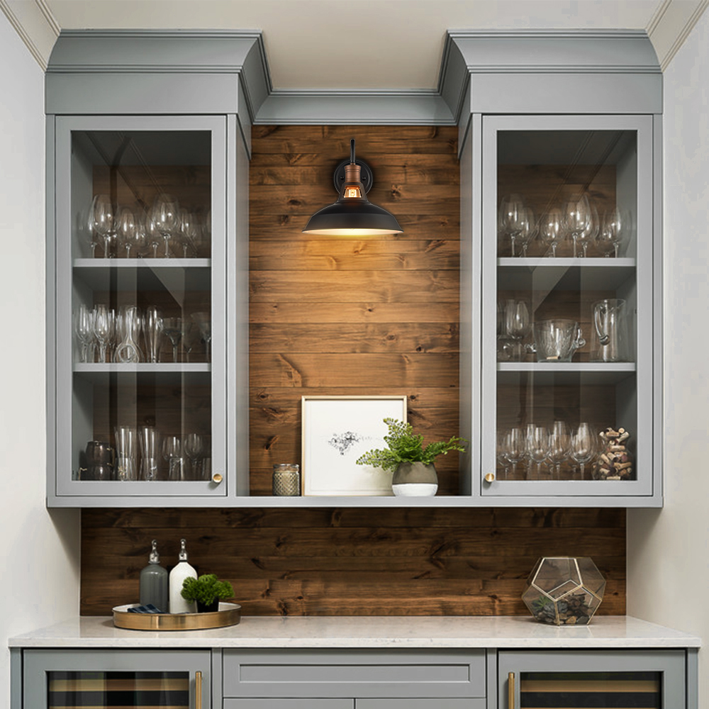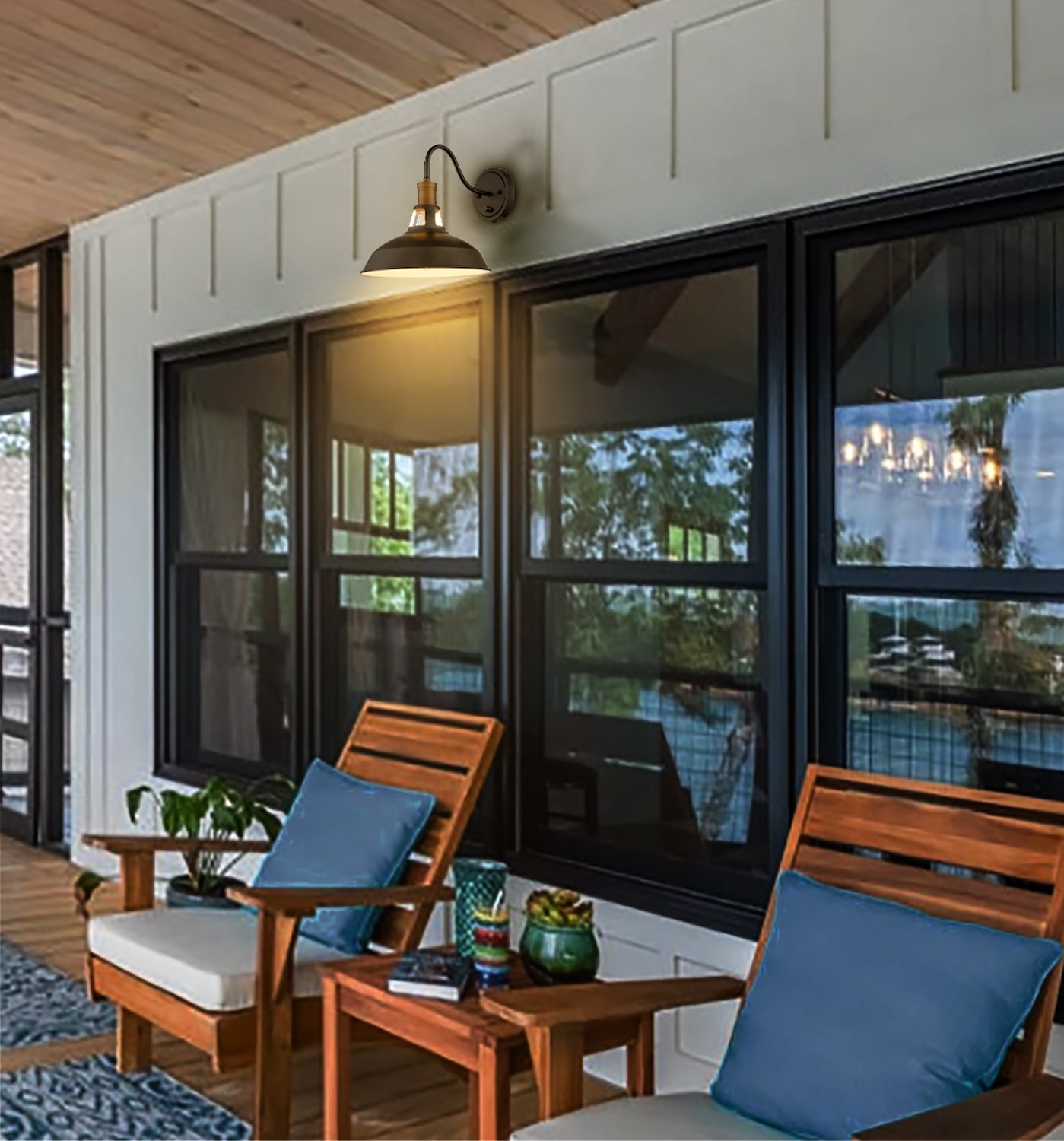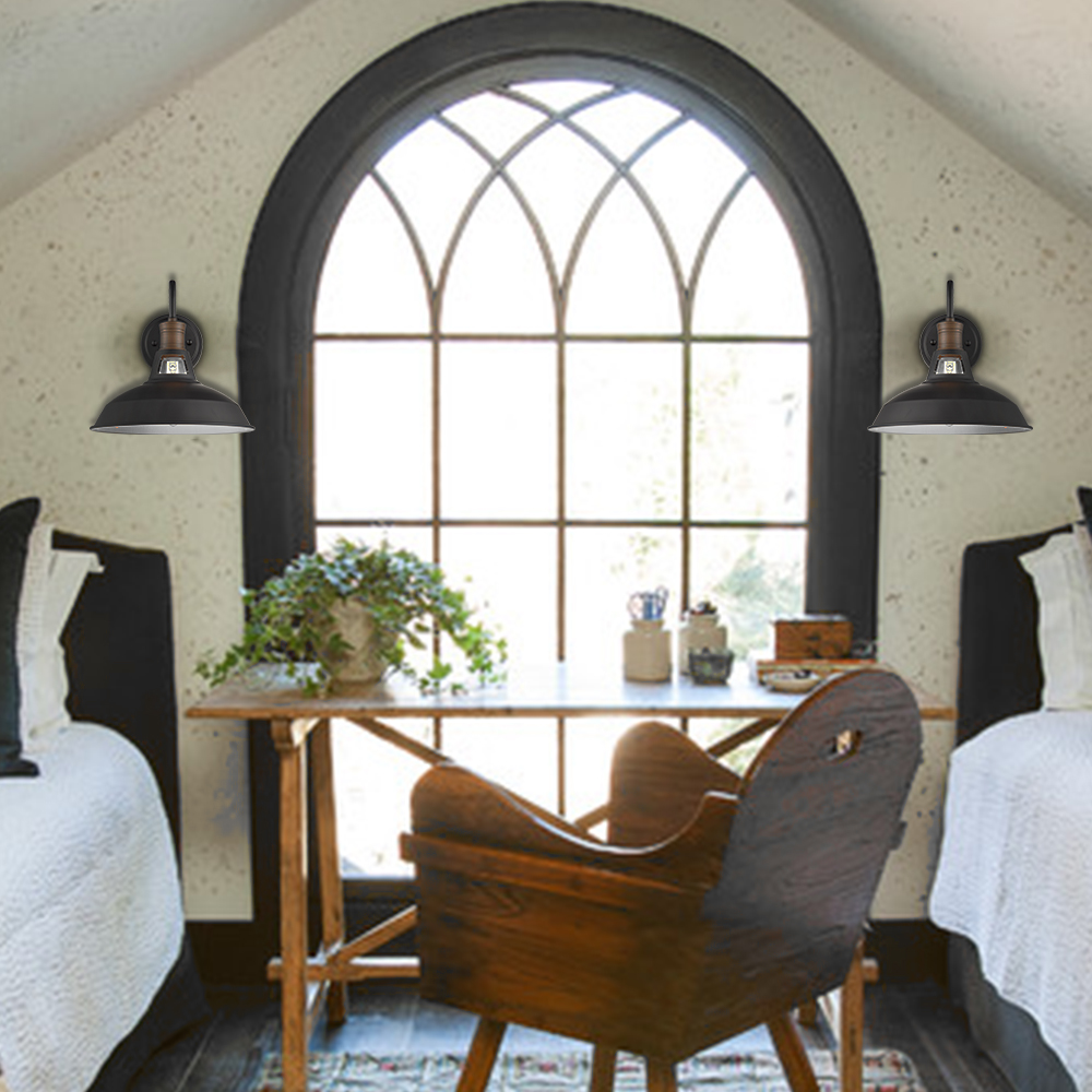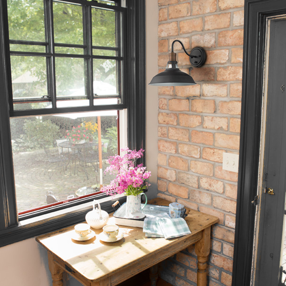 Crafted with solid metal, the plug-in wall sconces' barn shades boast a matte black finish on the outer surface while they flaunt a white finish on the inner surface, introducing an industrial-inspired style to your home decor. With a white interior to maximize reflectivity, the wall sconces liven up your interior with their brass lamp holders.
