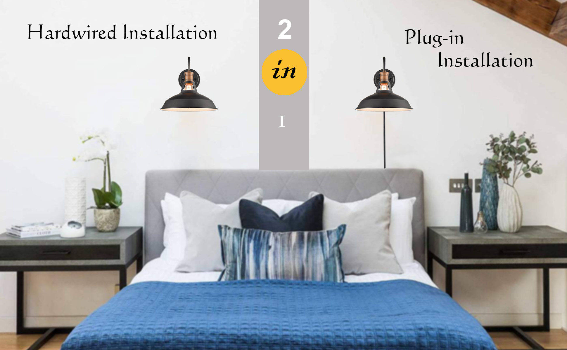 My mom wanted a light above her bed for reading, it has to be a plug in since the apartment she lives in doesn’t allow hardwiring. Everything needed came in the box to mount to the wall , the bracket, screws and drywall anchors. My husband had it up in 15minutes. If you choose to hardwire it comes with the kit to connect to the junction box. Be aware either way before mounting to the wall , you need to run the wires through the fixture and connect them to the switch and plug on the base. It’s not hard, but helps to have someone who’s good with assembly. There’s illustrations to walk you through.A Rotary switch on base turns it on and off.The pictures are of the second light that I have over my couch, I need to switch out the bulb and hide the wire. Overall, nice quality, good value for the pair. Very happy with this order!