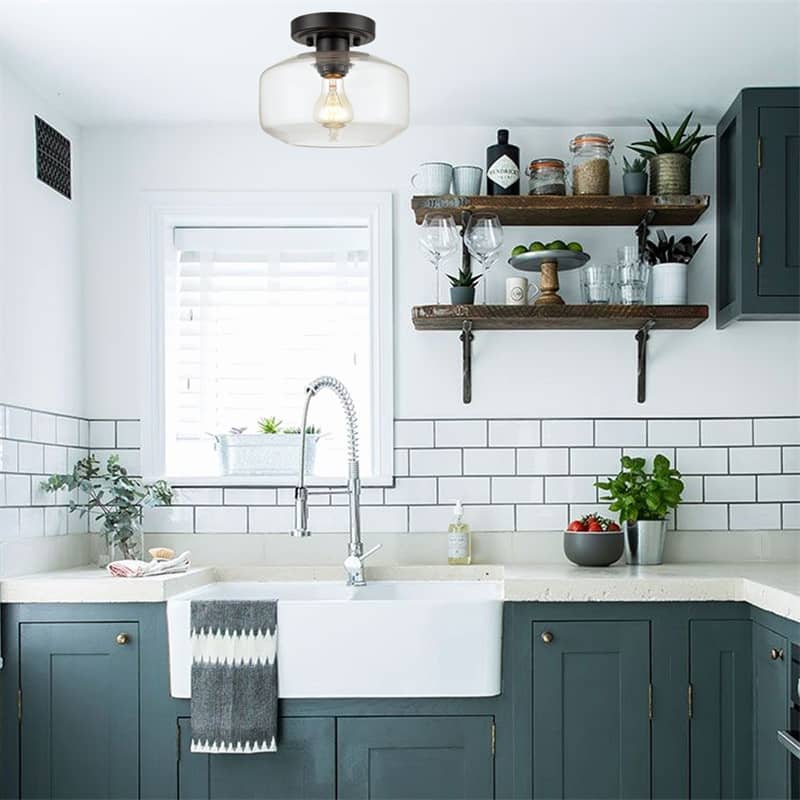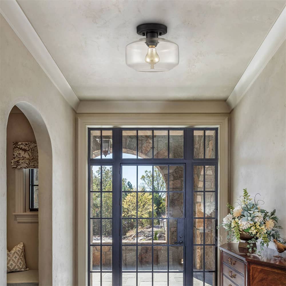 Crafted of impurity-free hand-blown clear glass, its globe shade with excellent light transmittance makes an industrial yet vintage statement.The semi flush mount ceiling light’s canopy and lamp-holder showcase a semi-gloss black finish, pepping up your space with a classic touch.