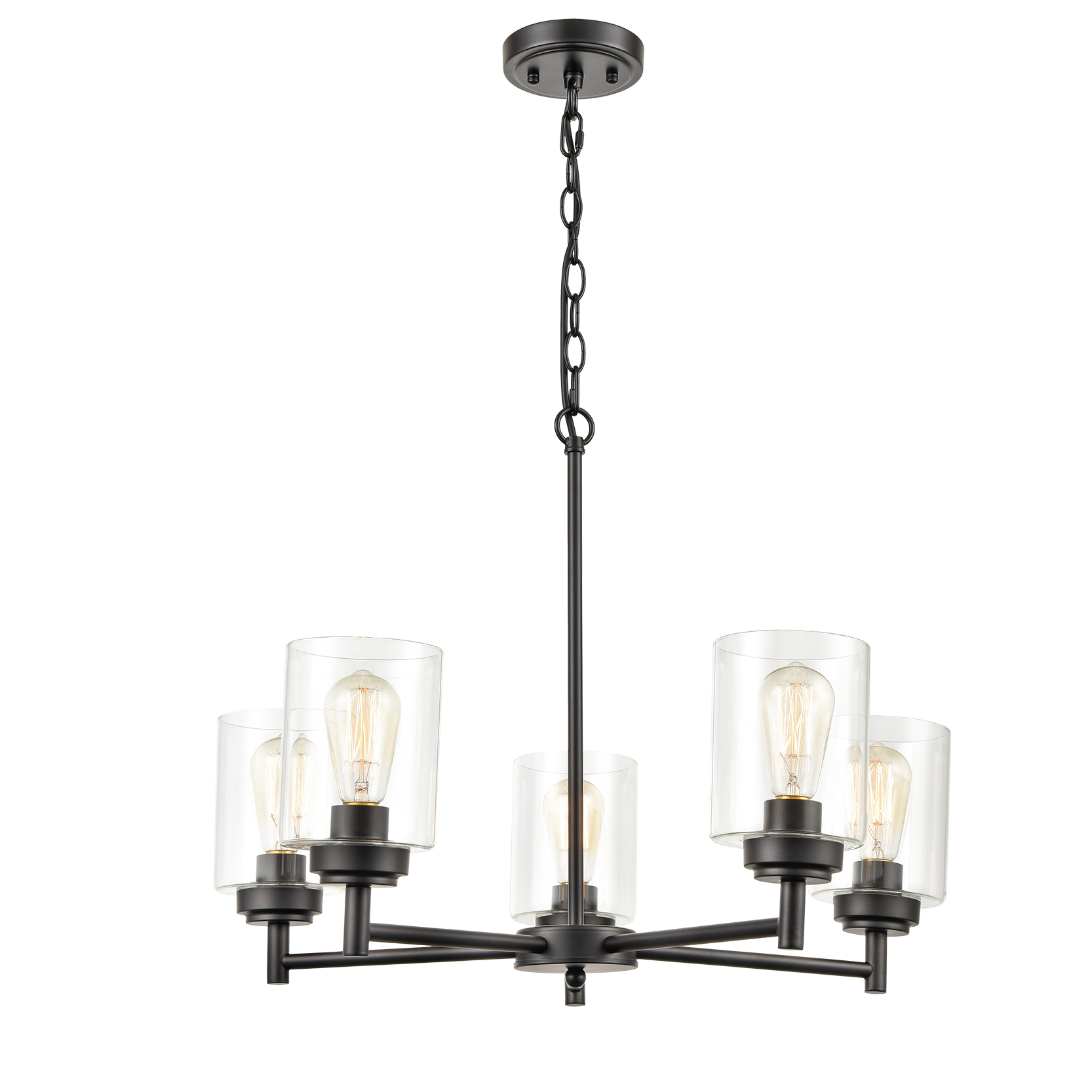 The large chandelier’s canopy, chain, hanging rod, arms, and lampholders are finished in black, sending out an industrial chic that will impress. Crafted of impurity-free hand-blown clear glass, its cylinder lampshades give your aesthetic a touch of geometry. Five glass shades are arranged around the hanging rod, showing off the beauty of symmetry. The glass cylinder shades contrast the black finish and add alluring visual interest to the space. It is a showstopping addition to your space with its modern vibe.