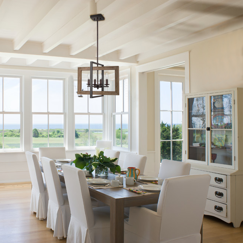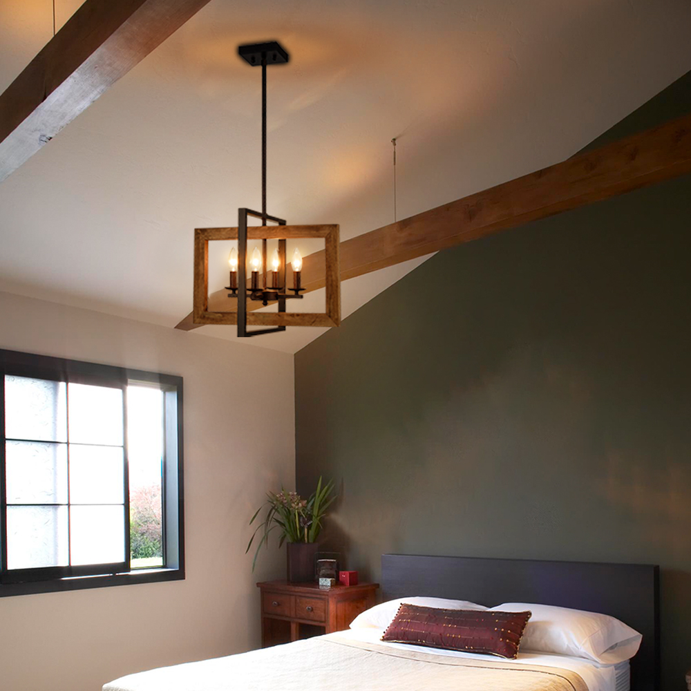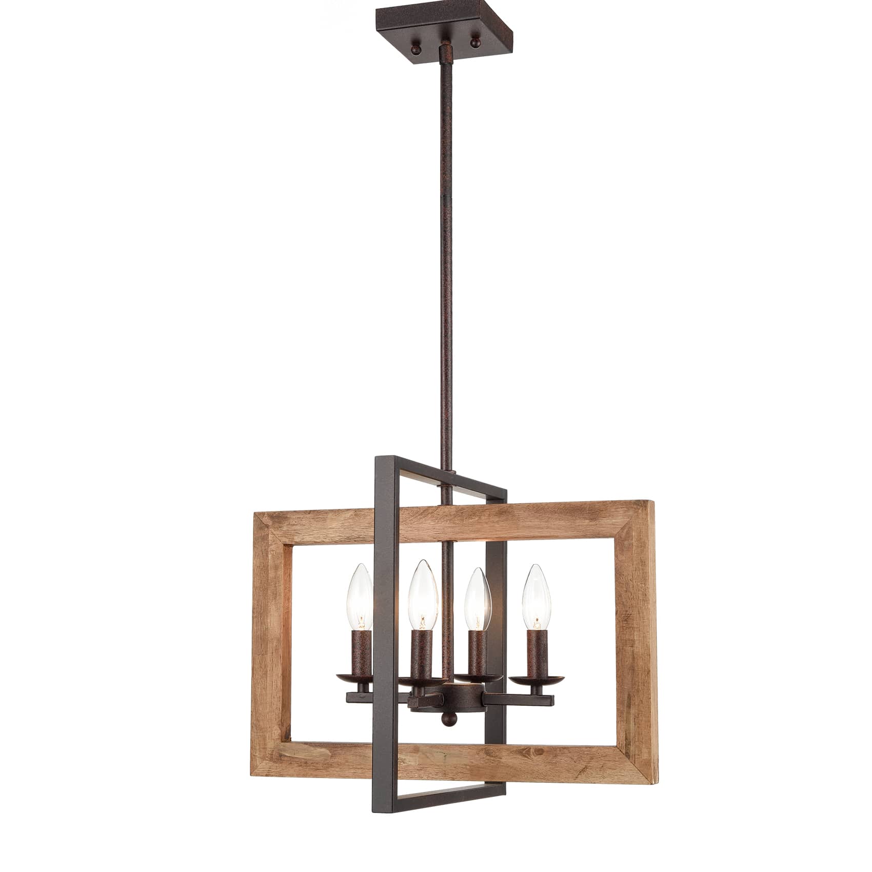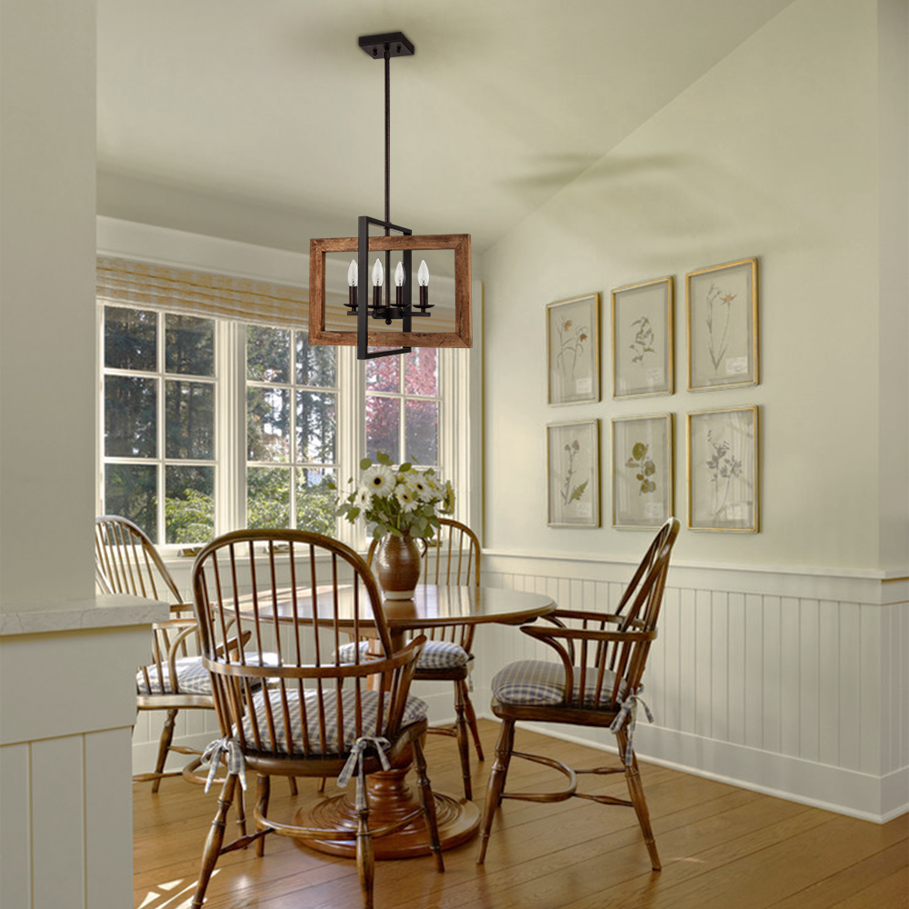 The pendant light fixture’s canopy, hanging rod, lamp holders, arms, and outer metal frame sport an antique rusty dark brown finish, delivering a farmhouse flair to your interior. Its outer wooden frame offers an unbeatable character to the living space with an antique burlywood brown finish.