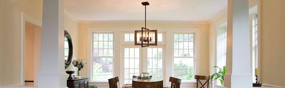 The pendant light fixture’s canopy, hanging rod, lamp holders, arms, and outer metal frame sport an antique rusty dark brown finish, delivering a farmhouse flair to your interior. Its outer wooden frame offers an unbeatable character to the living space with an antique burlywood brown finish.