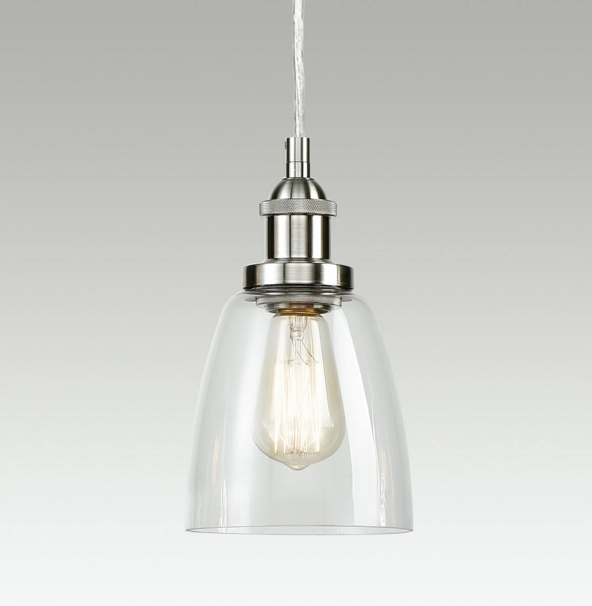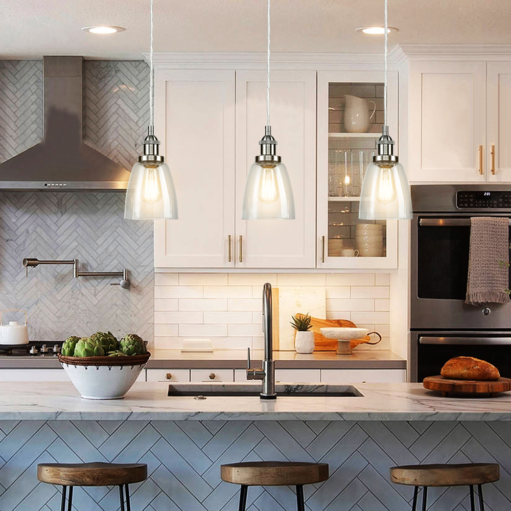 The pendant light’s canopy and lamp holders are dressed in a rustproof brushed nickel finish, revitalizing your home decor with a bit of metallic shimmer. Crafted from impurity-free hand-blown glass, its clear glass bell shades give your aesthetic a rustic charm with excellent light transmittance. It is an elegant addition to your space with its shiny finish.