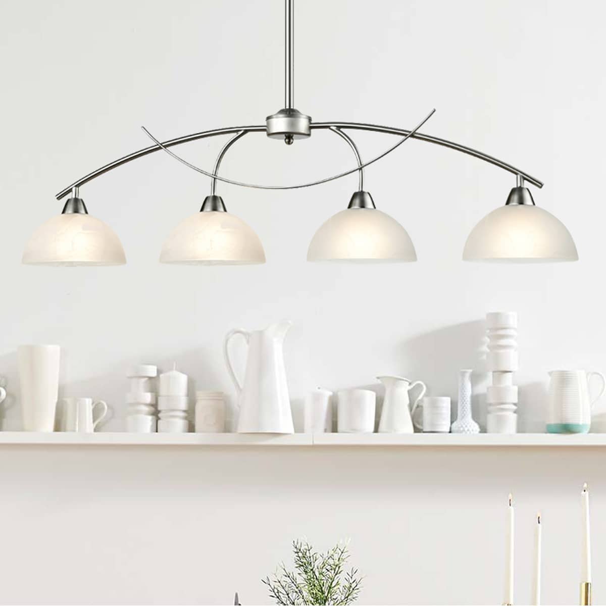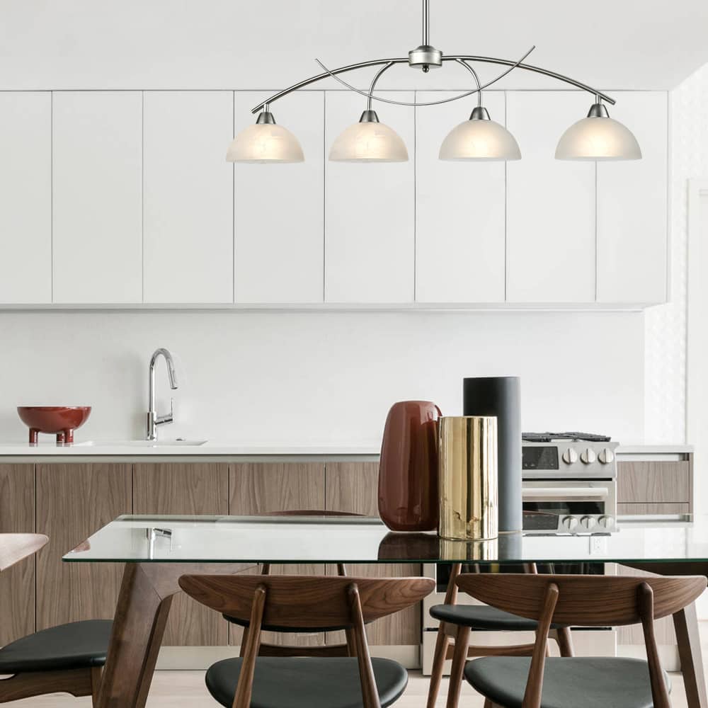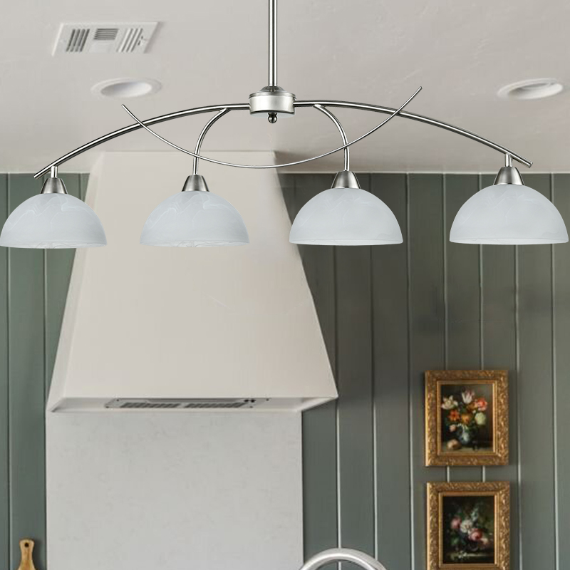 With a metallic and modern brushed nickel finish, the kitchen island lighting equipped with bowl frosted alabaster glass shades, gracefully arched design, it's a great addition to your home.