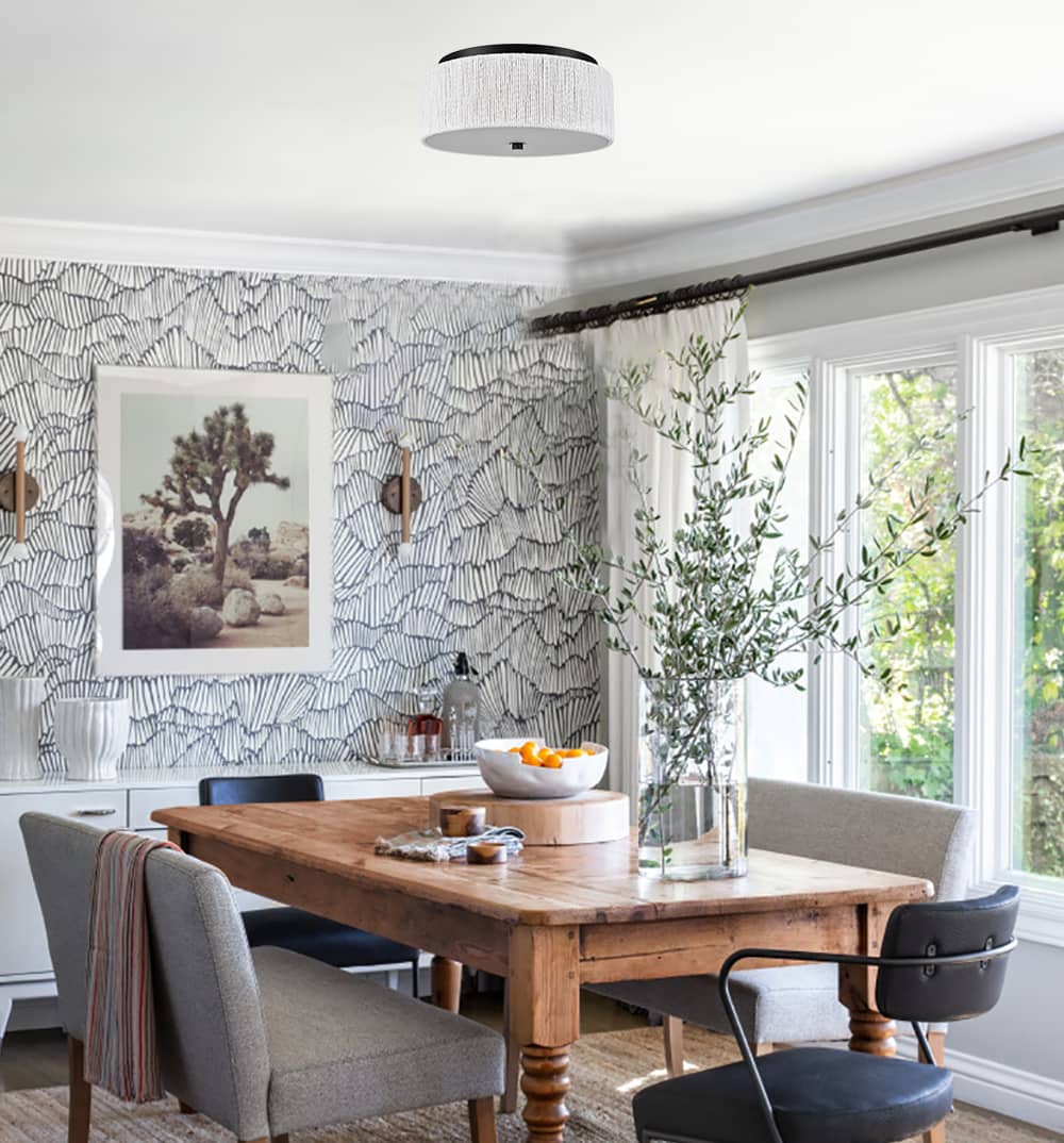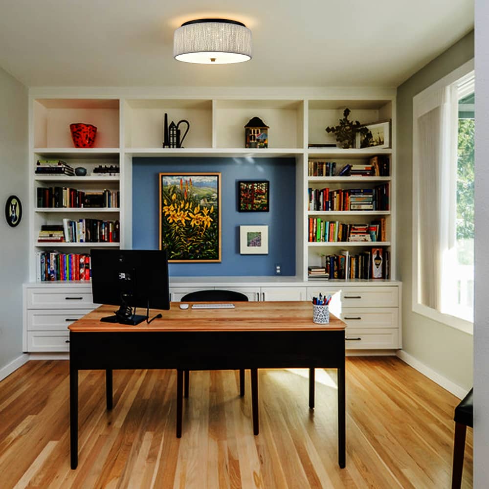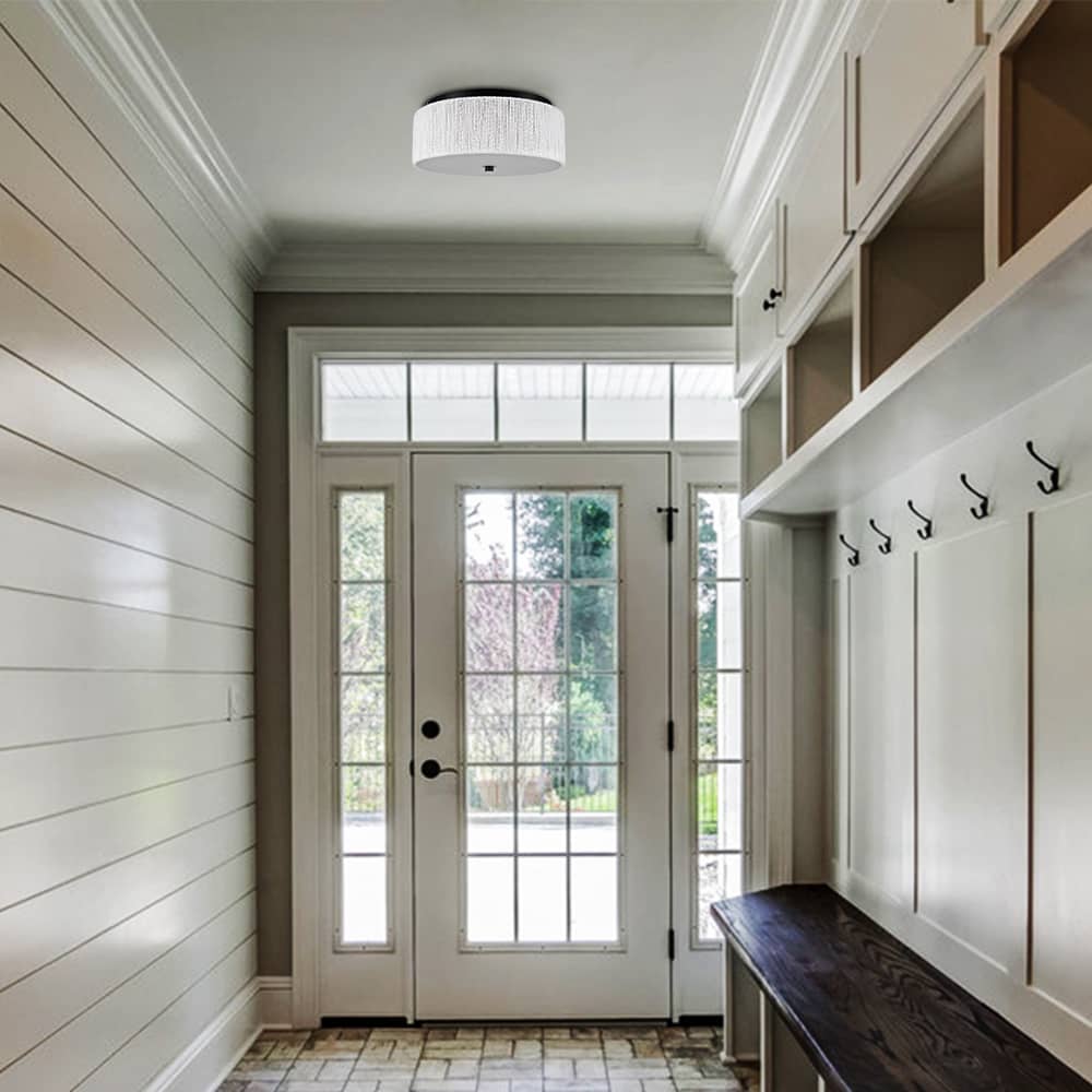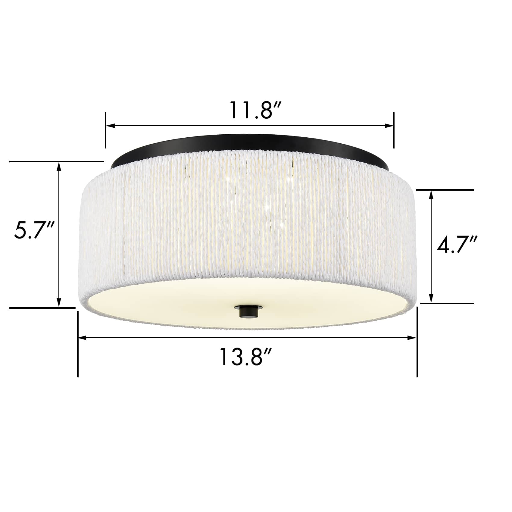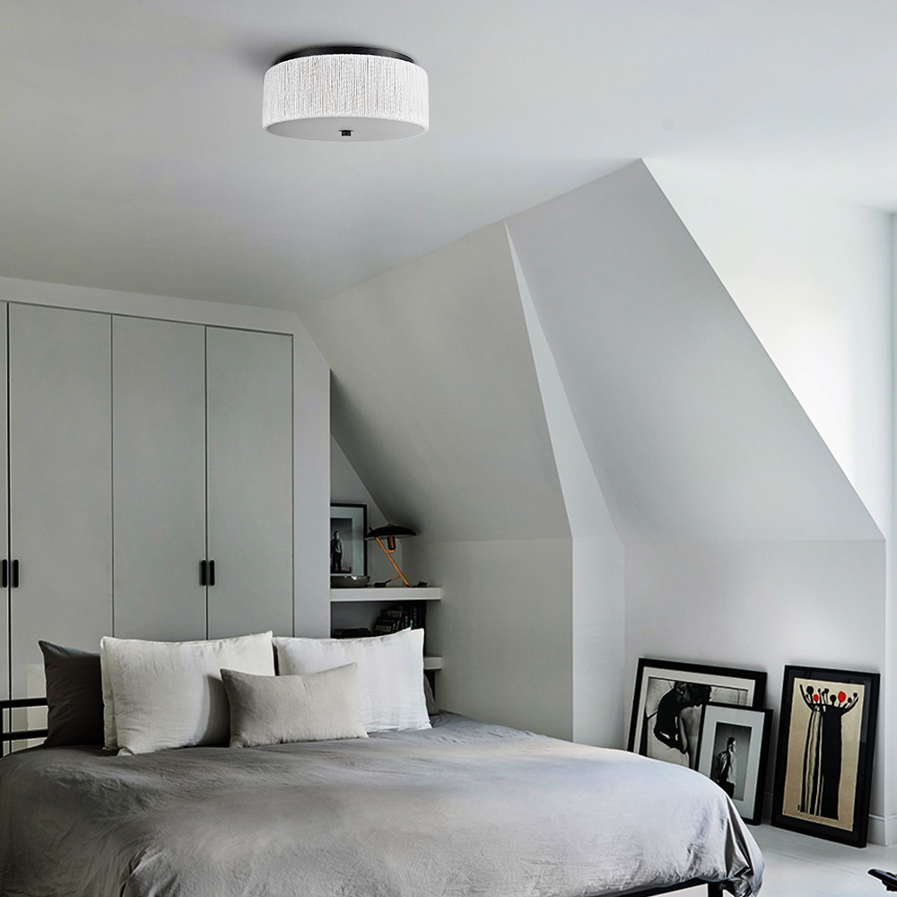 The LED flush mount ceiling light's canopy and bottom nut boast a rustproof black finish, lending a touch of modern elegance to your interior. The drum shade flaunts a number of white paper twines finely twisted and wrapped around the drum shade, bringing a feeling of relaxed coastal charm and delivering a large dose of texture to the space. It offers a surprising twist and supplies a dash of drama without overpowering the rest of the space. Its black finish contrasts the white paper twines and adds alluring visual interest to the interior. A charming glow shines through the frosted glass diffuser, filling the space without any glare.