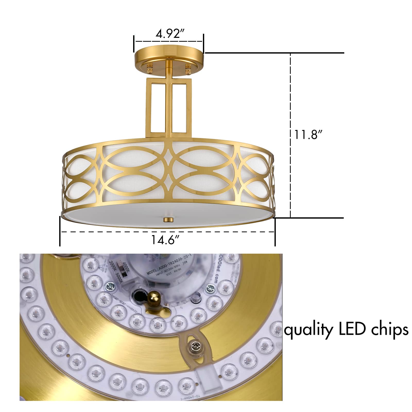 LED Semi-flush Mount Ceiling Light's canopy, lamp-holder, bottom accent, and airy cage are coated in an electrophoretic brass finish. Its creamy white linen drum shade is protected by an airy metal cage featuring conjoining ovals. The light pouring through the fabric lampshade is gently muted and fills the room without any glare. ED Semi-flush Mount Ceiling Light is a perfect fixture for your bedroom, dining room, entryway, hallway, living room, patio, and porch. ETL listed for dry locations.