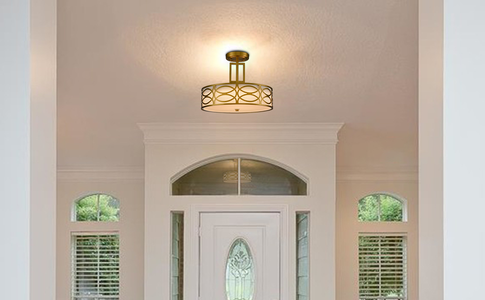 LED Semi-flush Mount Ceiling Light's canopy, lamp-holder, bottom accent, and airy cage are coated in an electrophoretic brass finish. Its creamy white linen drum shade is protected by an airy metal cage featuring conjoining ovals. The light pouring through the fabric lampshade is gently muted and fills the room without any glare. ED Semi-flush Mount Ceiling Light is a perfect fixture for your bedroom, dining room, entryway, hallway, living room, patio, and porch. ETL listed for dry locations.