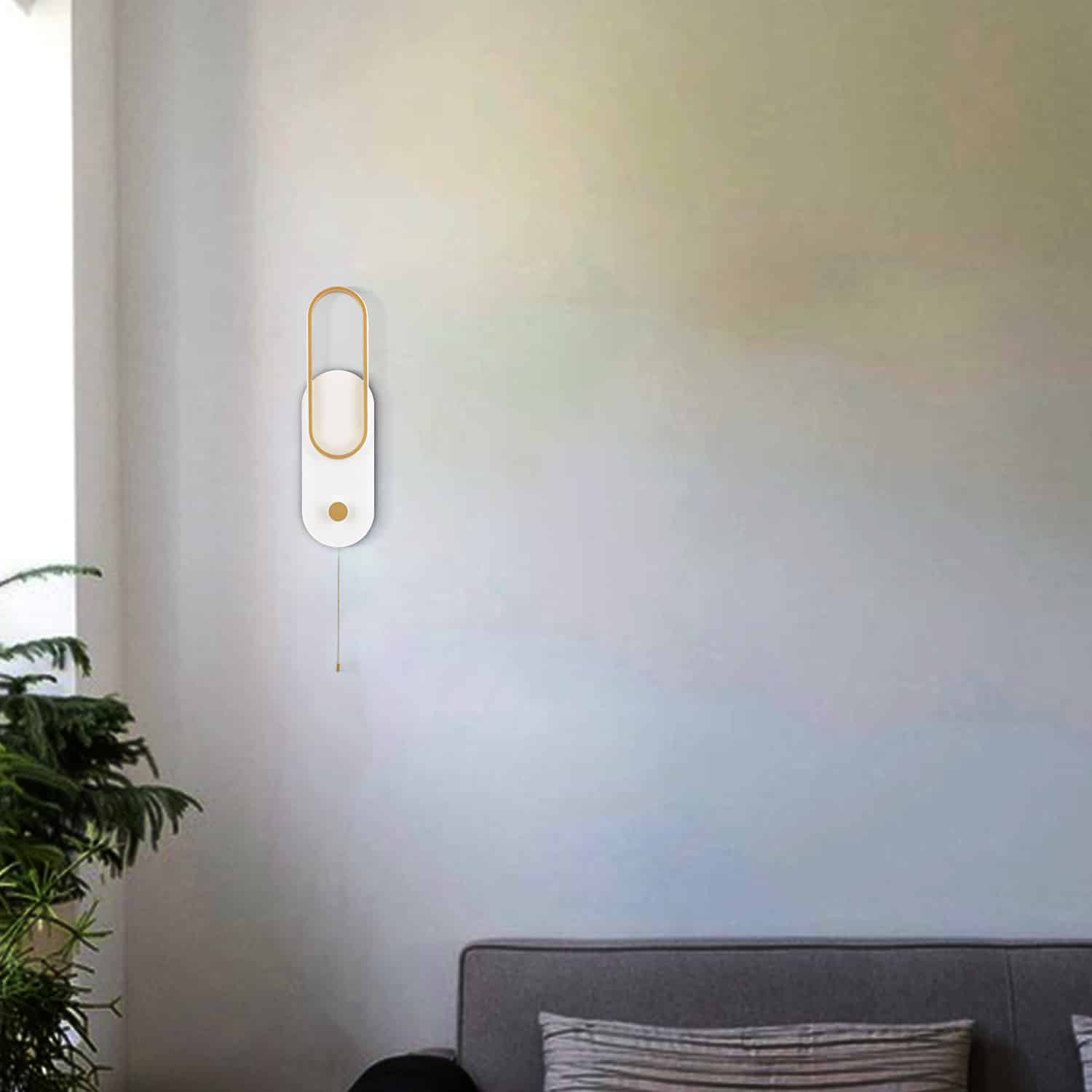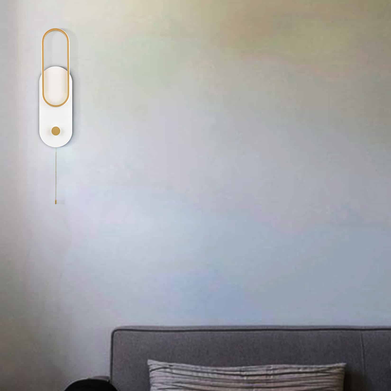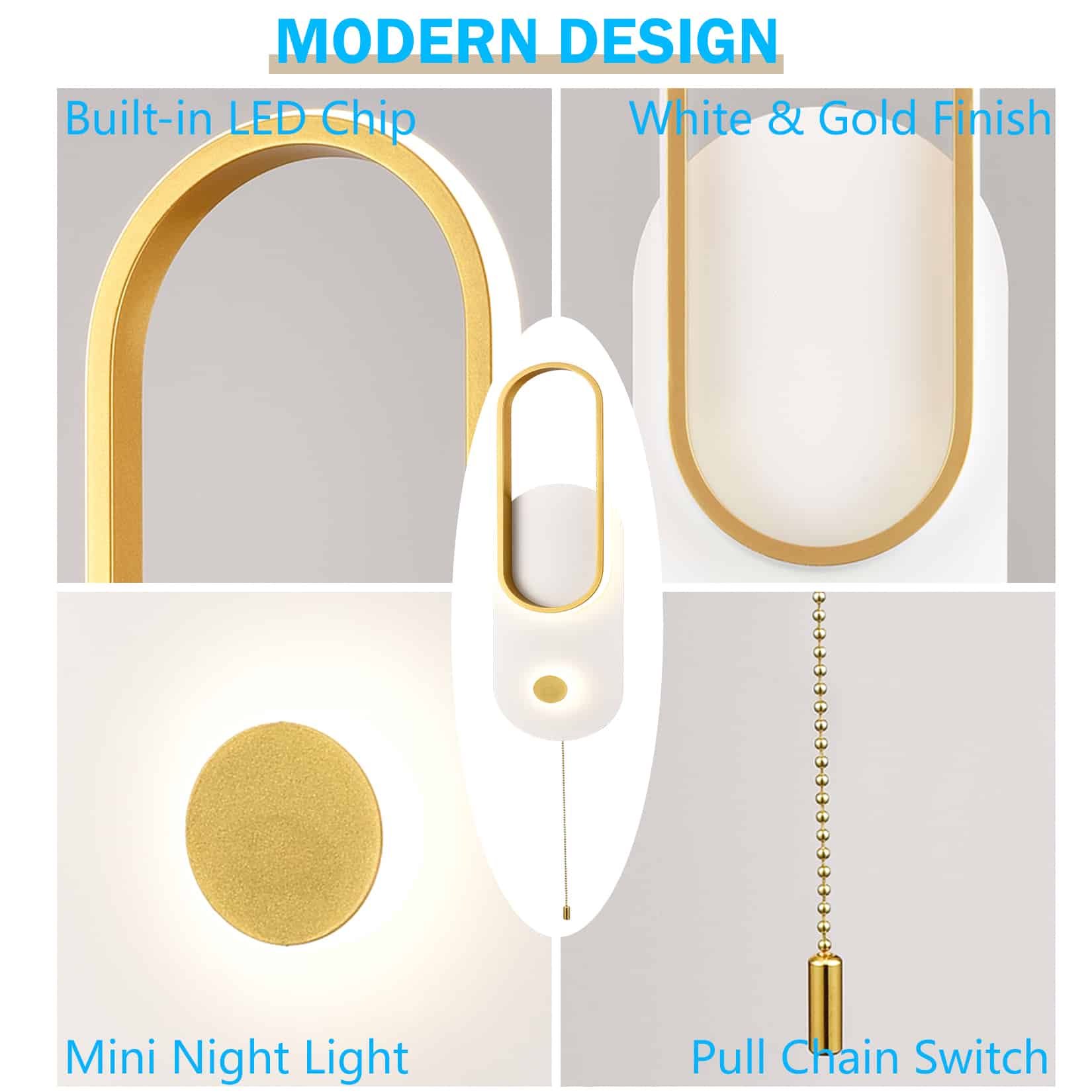 Boasting mixed finishes of white and gold, the LED wall sconce conveys a cool air of sophistication and a glint of glamour to your living space. Crafted from metal and silicon, the lamp body shows off two overlapping ovals and the beauty of geometry. It supplies a dash of drama and gives the space a touch of whimsy. It comes with a constant current isolated driver power supply. It emits a soft glow of flicker-free light, creating intriguing light effects and shades. The pull chain switch (without a dimming function) allows you to turn on/off the wall sconce and the night light easily.
