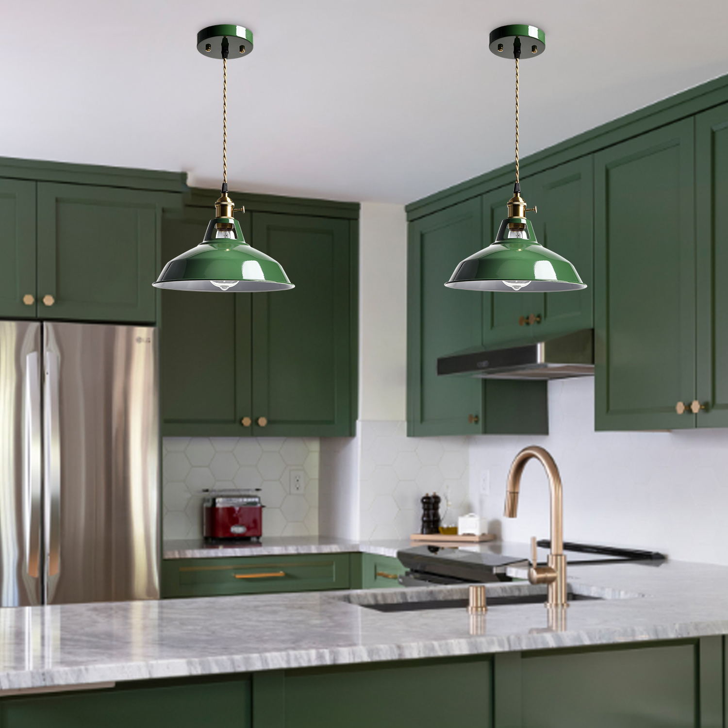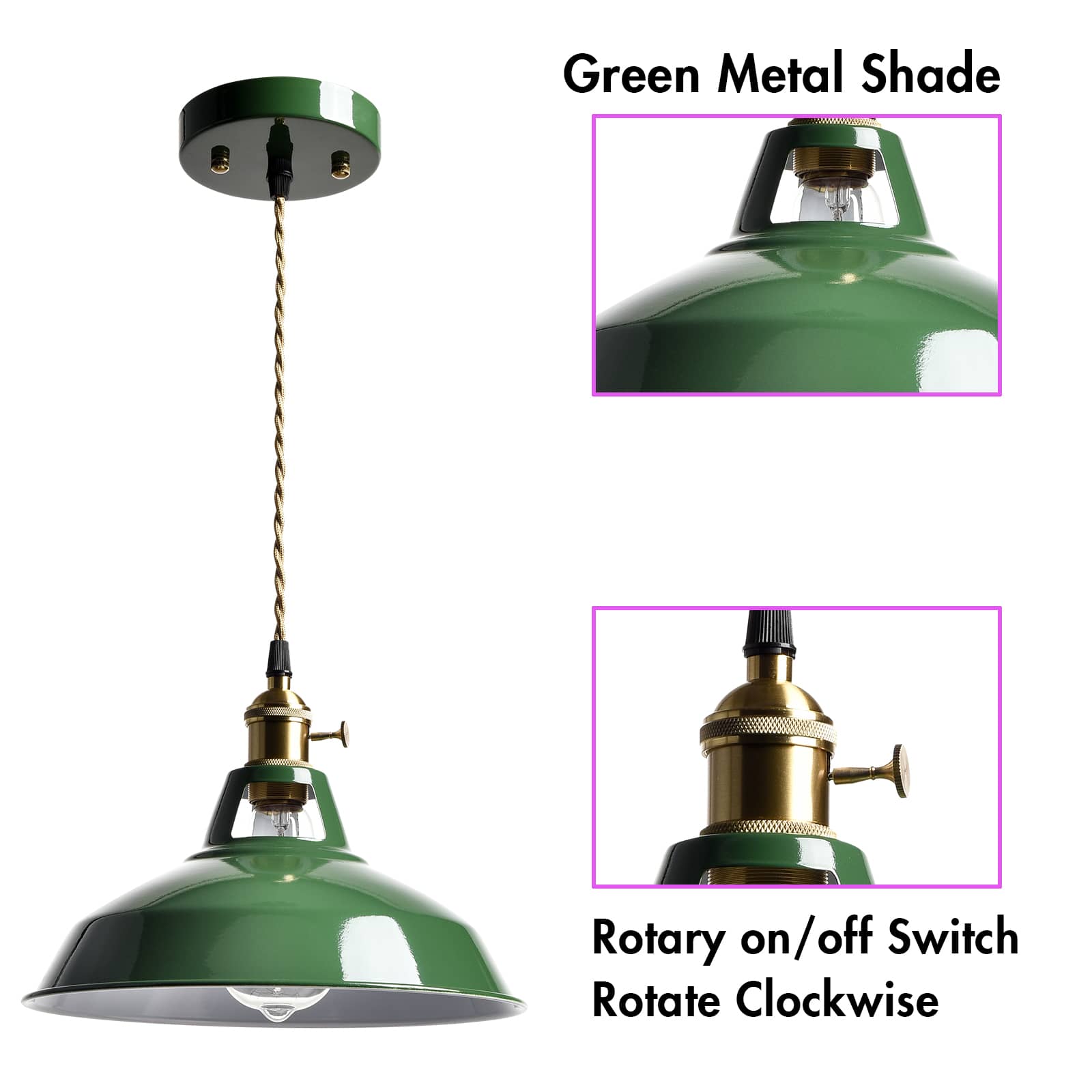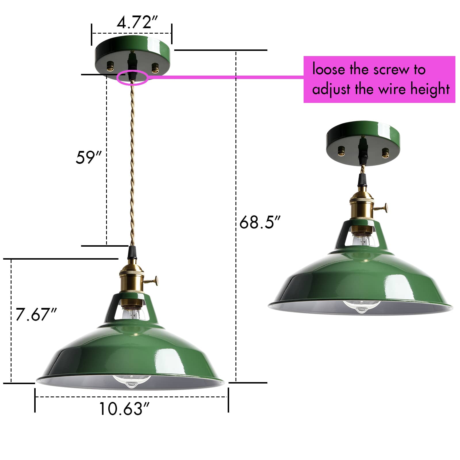 The macaron green pendant light’s barn shade and canopy show off a green finish while its lamp holder, rotary switch, and hanging cord flaunt a gold finish. The white interior of the barn shade helps reflect the light. A mix of finishes encompasses both a dash of drama and a touch of shimmer, yet maintains a modern edge. Its green finish gives your home a snappy look and a glamorous, refreshing vibe. Its shiny gold finish offers a stark contrast to the green finish and adds alluring eye appeal to the space. Feel free to turn on/off the pendant light with the rotary switch on the lamp holder. It comes with a 59-inch adjustable cord to suit your different lighting needs.