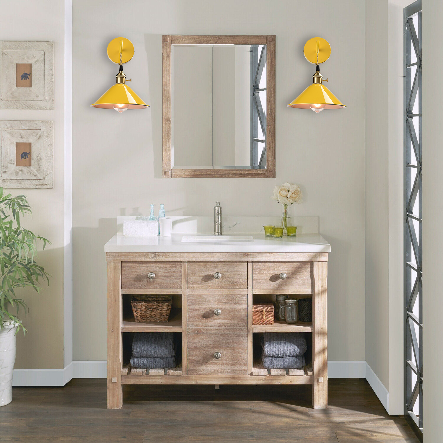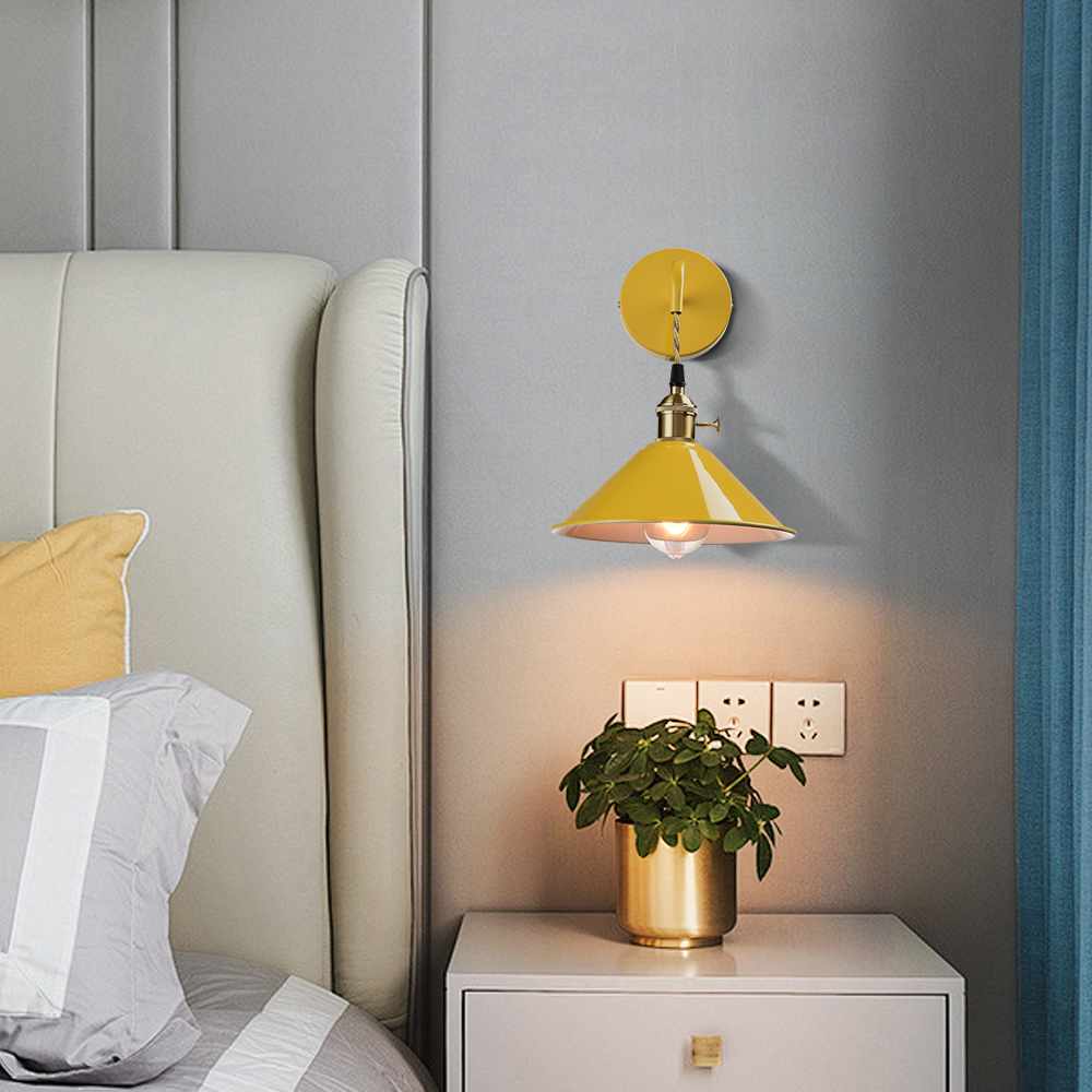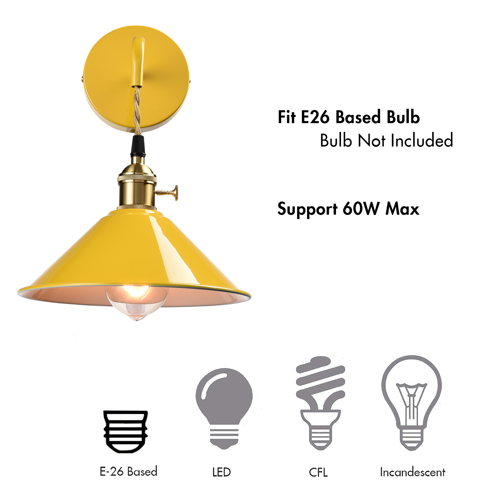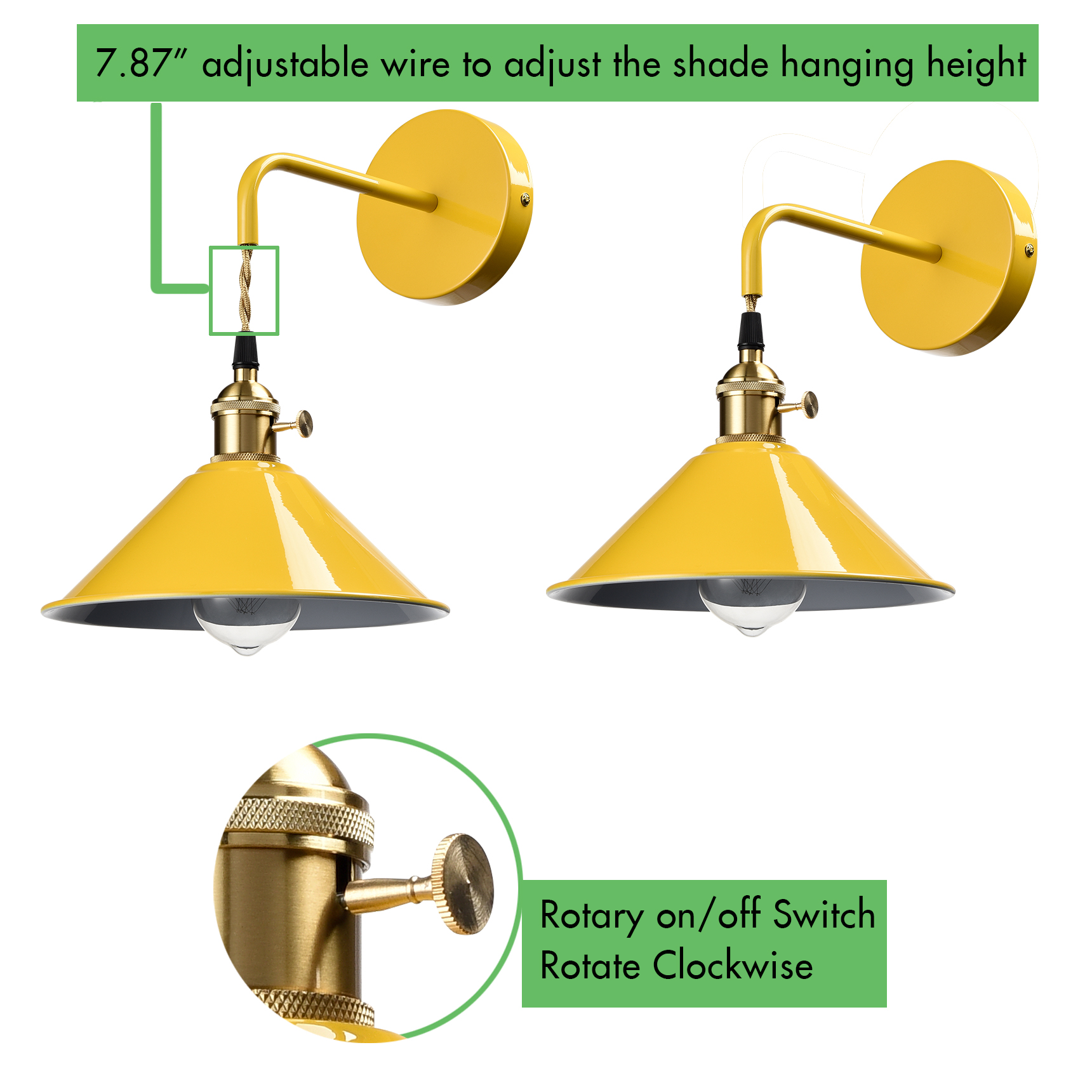 The macaron yellow wall sconce’s cone shade, canopy, and arm show off a yellow finish while its lamp holder, rotary switch, and hanging cord flaunt a gold finish. The white interior of the cone shade helps reflect the light. A mix of finishes encompasses both a dash of drama and a touch of shimmer, yet maintains an industrial edge. Its yellow finish gives your home a snappy look and a glamorous, refreshing vibe. Its shiny gold finish offers a stark contrast to the yellow finish and adds alluring eye appeal to the space. Feel free to turn on/off the light with the rotary switch on the lamp holder. It comes with a 7.87-inch adjustable cord to suit your different lighting needs.