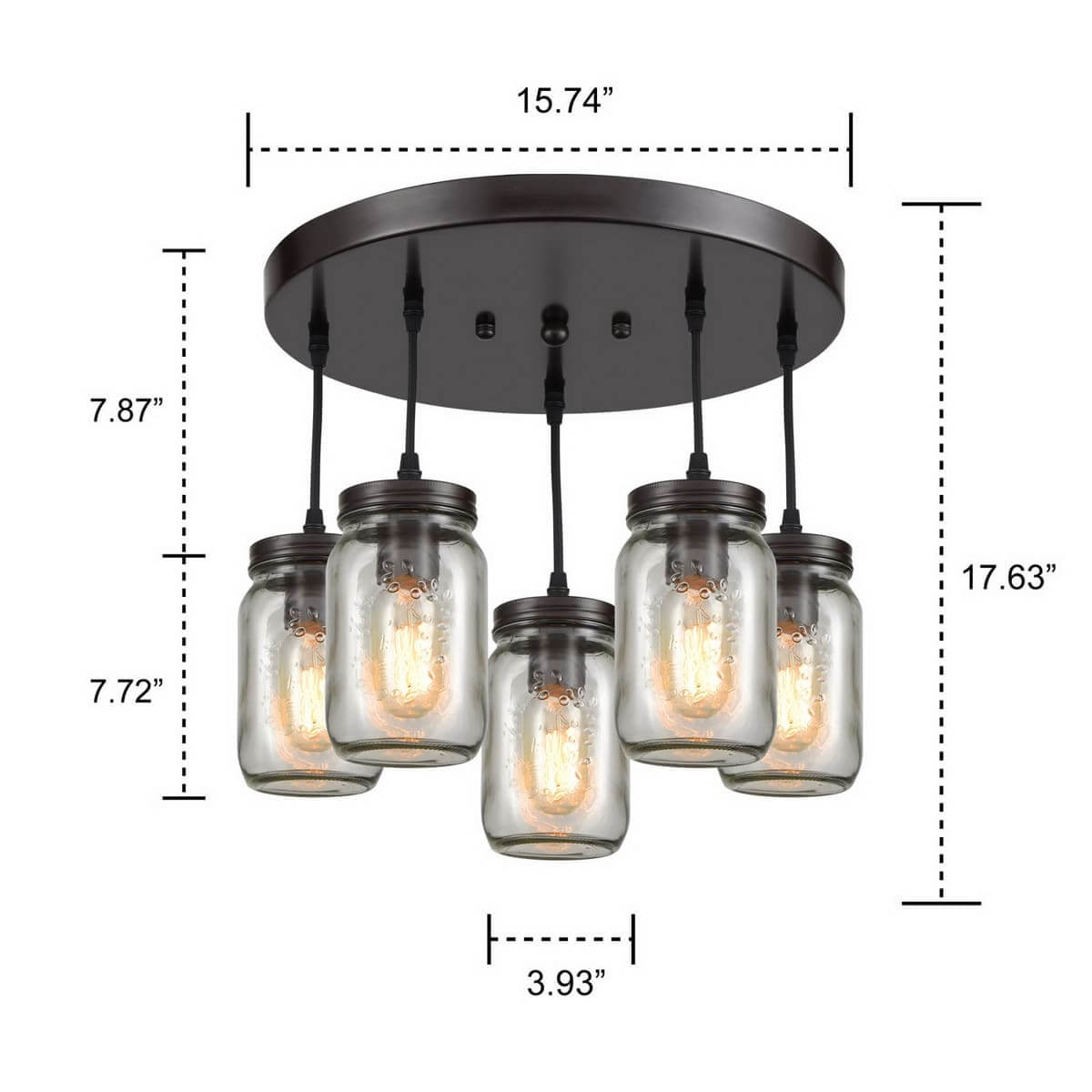 The jar semi flush ceiling light’s oil rubbed bronze finish infuses your interior with a retro charm. It consists of five dangling mason jars of the same size and at the same hanging heights, which resembles the look of aeolian bells. It makes a rustic statement in your aesthetic and serves as a playful addition to your home decor with its lovely appearance. Add this stunning piece to your bar, bedroom, dining room, entryway, foyer, hallway and kitchen.