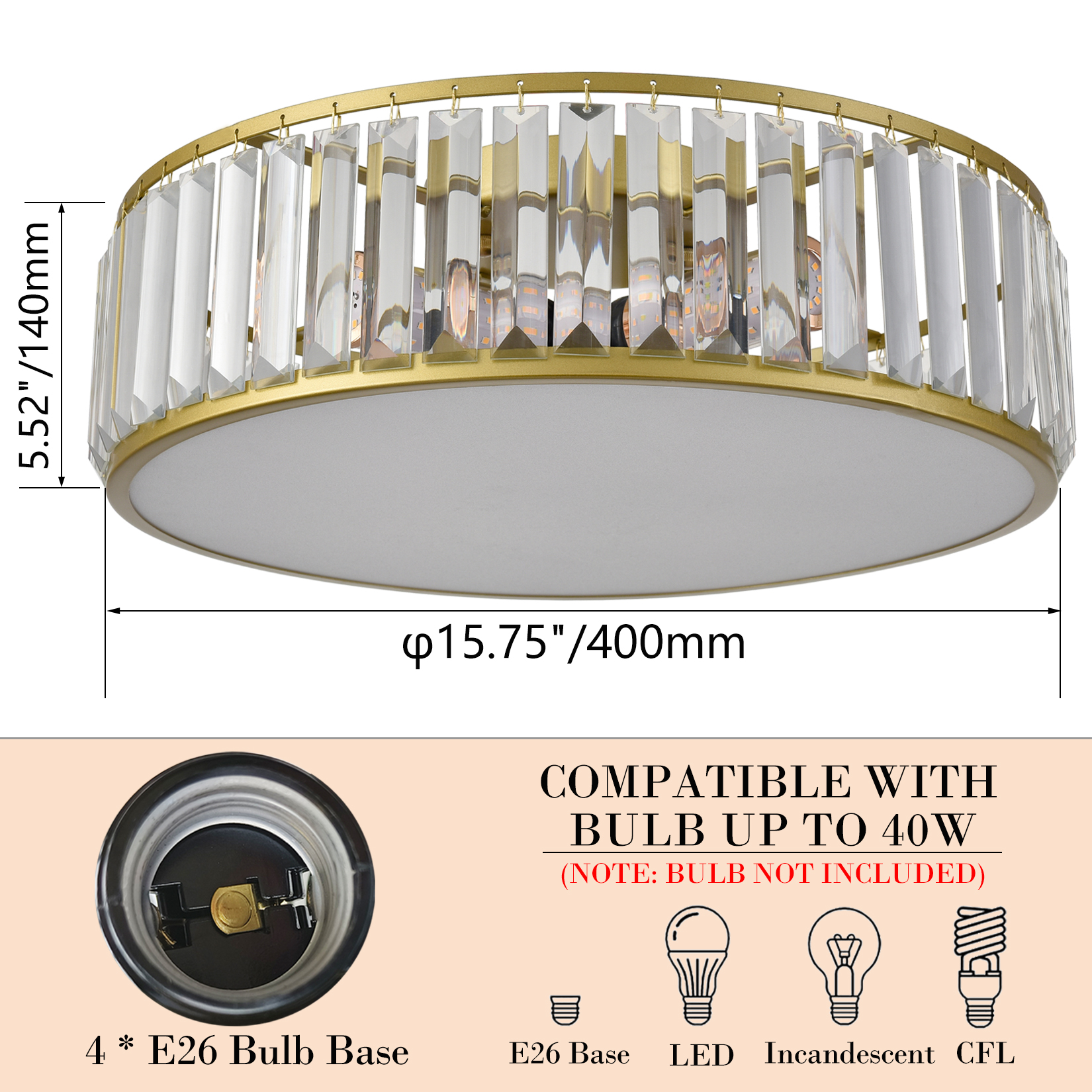The modern 4-light crystal ceiling light is sure to draw the eye upward and adds glitzy sparkle to the space with its breath-taking gold finish. It sports a rounded drum shade decorated with angular K9 crystal prisms. Offering a surprising twist, it delivers a huge dose of contemporary sparkle and a luxurious touch to your interior. It casts gorgeous light rays throughout your space while the light bounces and reflects off the crystal prisms to create bright, intriguing light effects and shades. Its gleaming finish contrasts the airy crystal drum shade and serves as eye candy. It is a show-stopping addition to your home with its crystal accent.