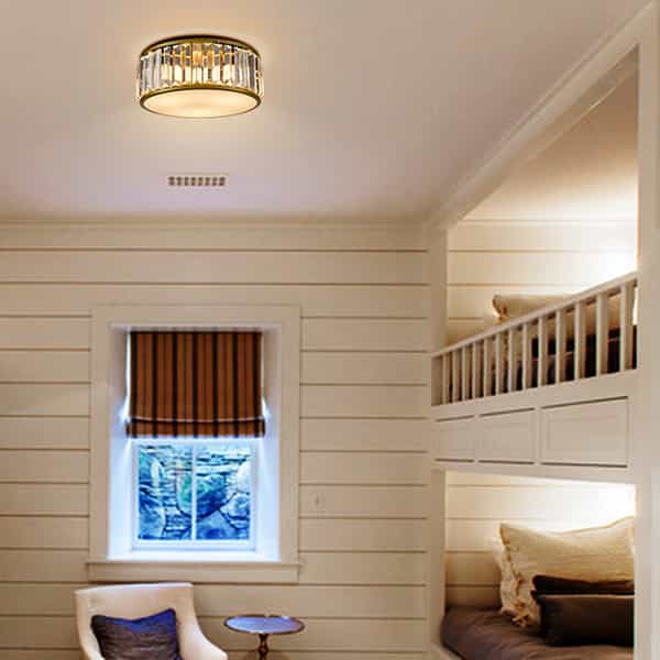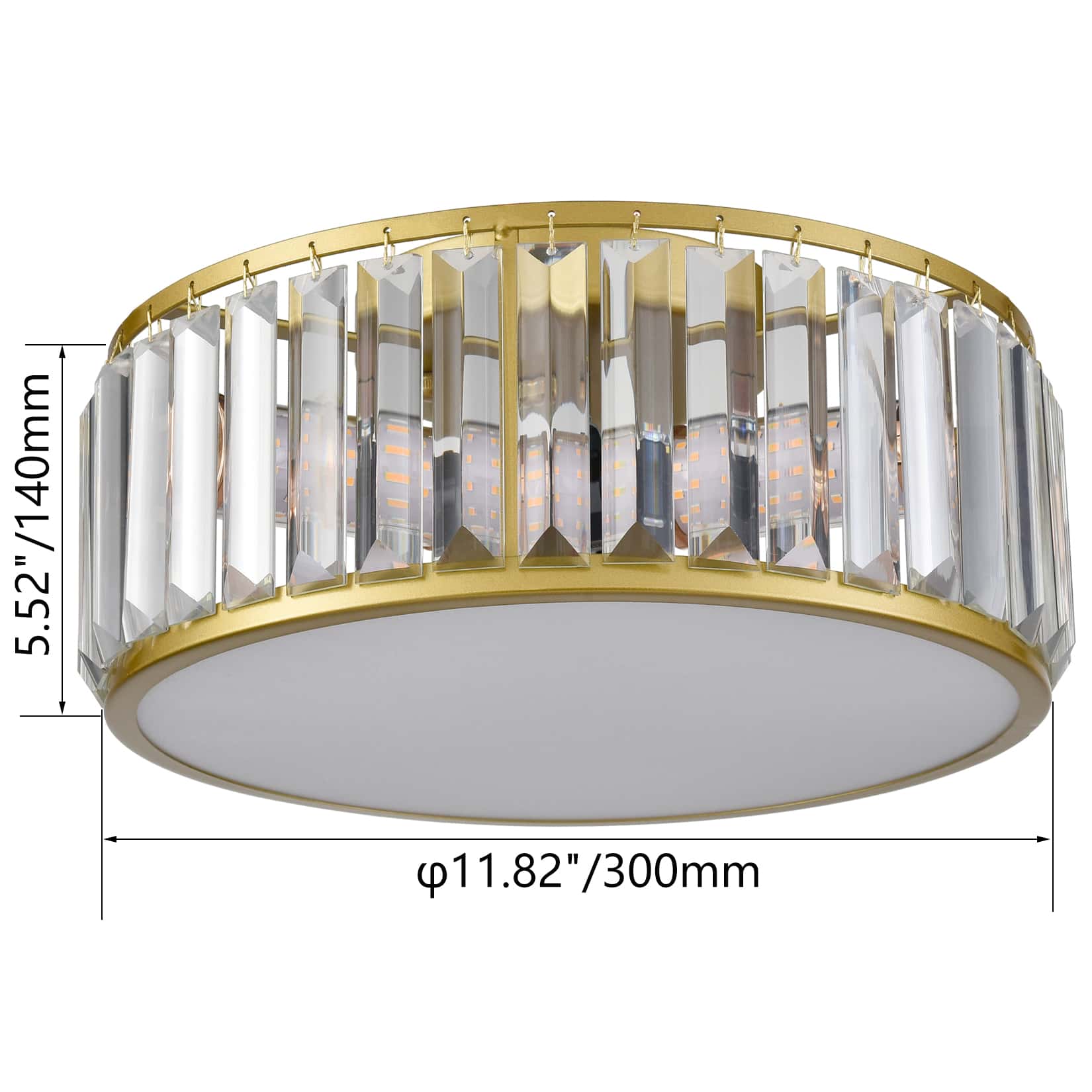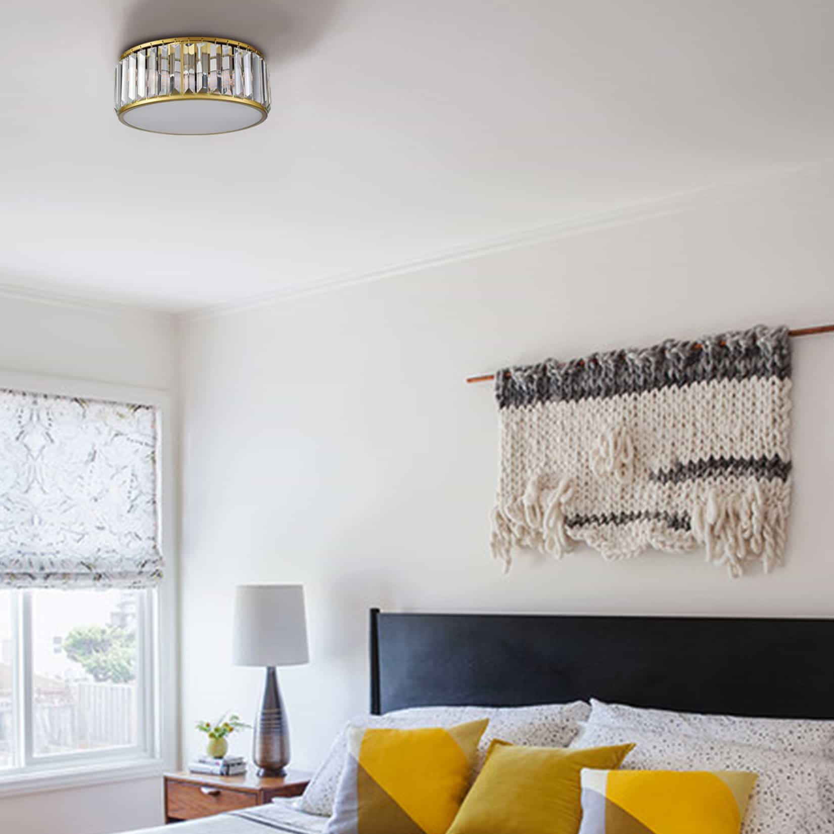 The flush mount gold 3-light ceiling light fixture is sure to draw the eye upward and adds glitzy sparkle to the space with its breath-taking gold finish. It sports a rounded drum shade decorated with angular K9 crystal prisms. Offering a surprising twist, it delivers a huge dose of contemporary sparkle and a luxurious touch to your interior. It casts gorgeous light rays throughout your space while the light bounces and reflects off the crystal prisms to create bright, intriguing light effects and shades. Its gleaming finish contrasts the airy crystal drum shade and serves as eye candy. It is a show-stopping addition to your home with its crystal accent.