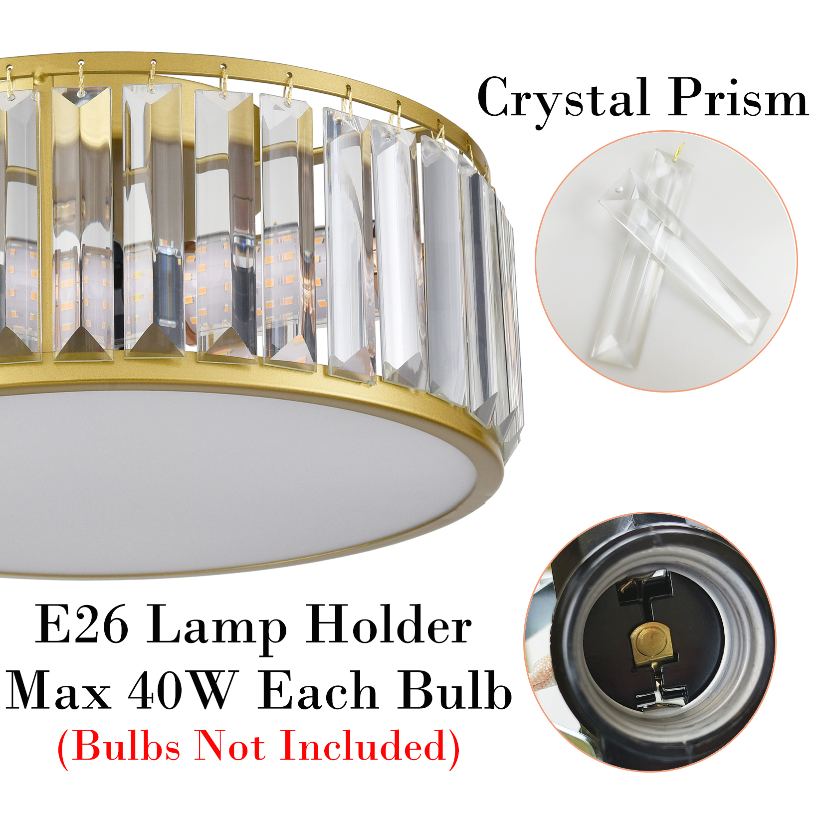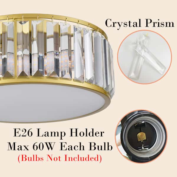 The flush mount gold 3-light ceiling light fixture is sure to draw the eye upward and adds glitzy sparkle to the space with its breath-taking gold finish. It sports a rounded drum shade decorated with angular K9 crystal prisms. Offering a surprising twist, it delivers a huge dose of contemporary sparkle and a luxurious touch to your interior. It casts gorgeous light rays throughout your space while the light bounces and reflects off the crystal prisms to create bright, intriguing light effects and shades. Its gleaming finish contrasts the airy crystal drum shade and serves as eye candy. It is a show-stopping addition to your home with its crystal accent.