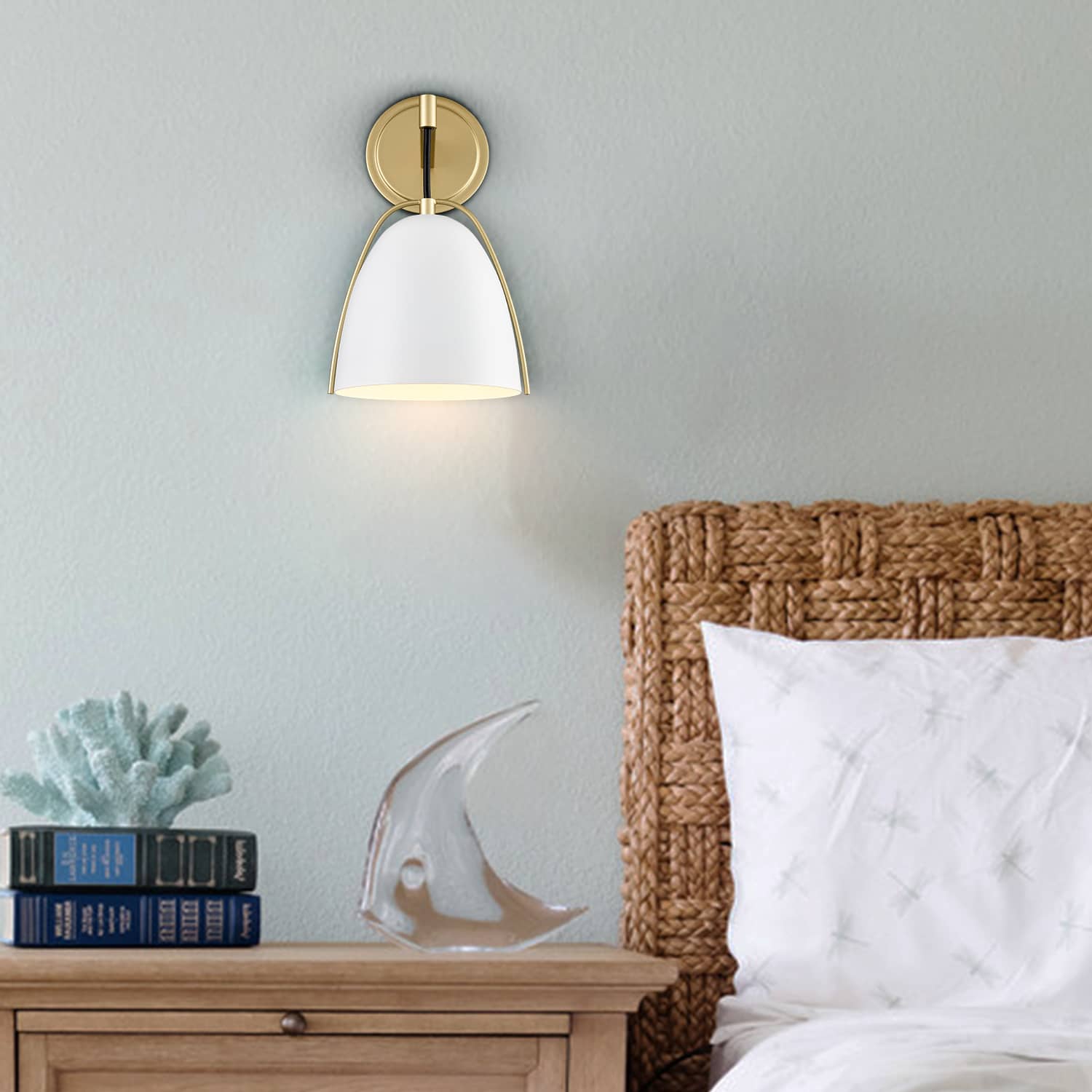 This is a beautiful modern looking sconce; we got two for each of the side tables in our bedroom. The gold finish with the white shade gives a warm, inviting ambiance and has a sleek, modern aesthetic. The metal construction feels quality and durable. Each light provides a nice amount of glow. This fixture blends beautifully with our contemporary modern decor with the gold brass accent. Installation is straightforward with positive and ground, and mounting.