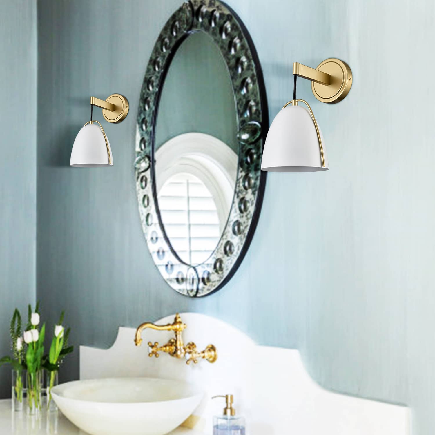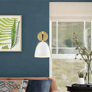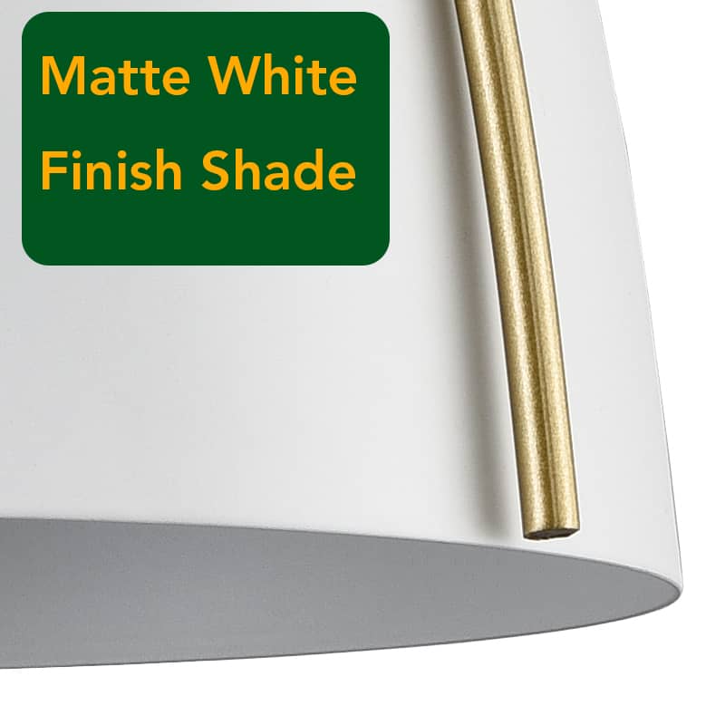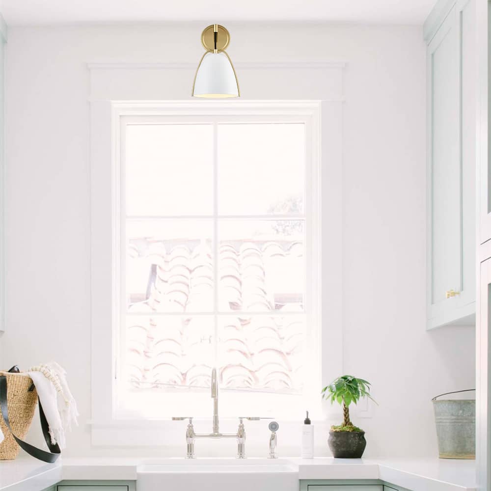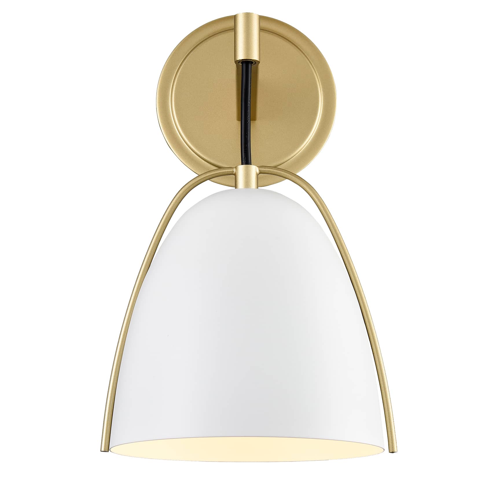 The white & gold wall sconce’s canopy, arm, 2-pronged frame, and lamp holder provide stunning decorative detail and a boost of sparkle to your living space with a glossy gold finish. Its dome shade conveys a touch of elegance with a matte white finish. It is held aloft by a black cord and is protected by a streamlined 2-pronged metal frame. A mix of finish encompasses both modern qualities and farmhouse elements, yet maintains a transitional edge. Its white dome shade contrasts the shiny finish and gives the space a large dose of texture.
