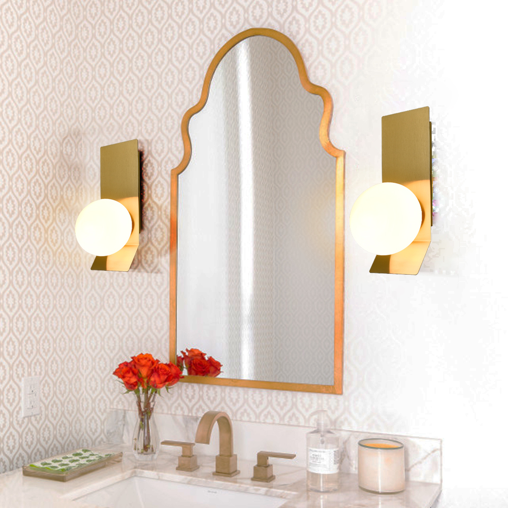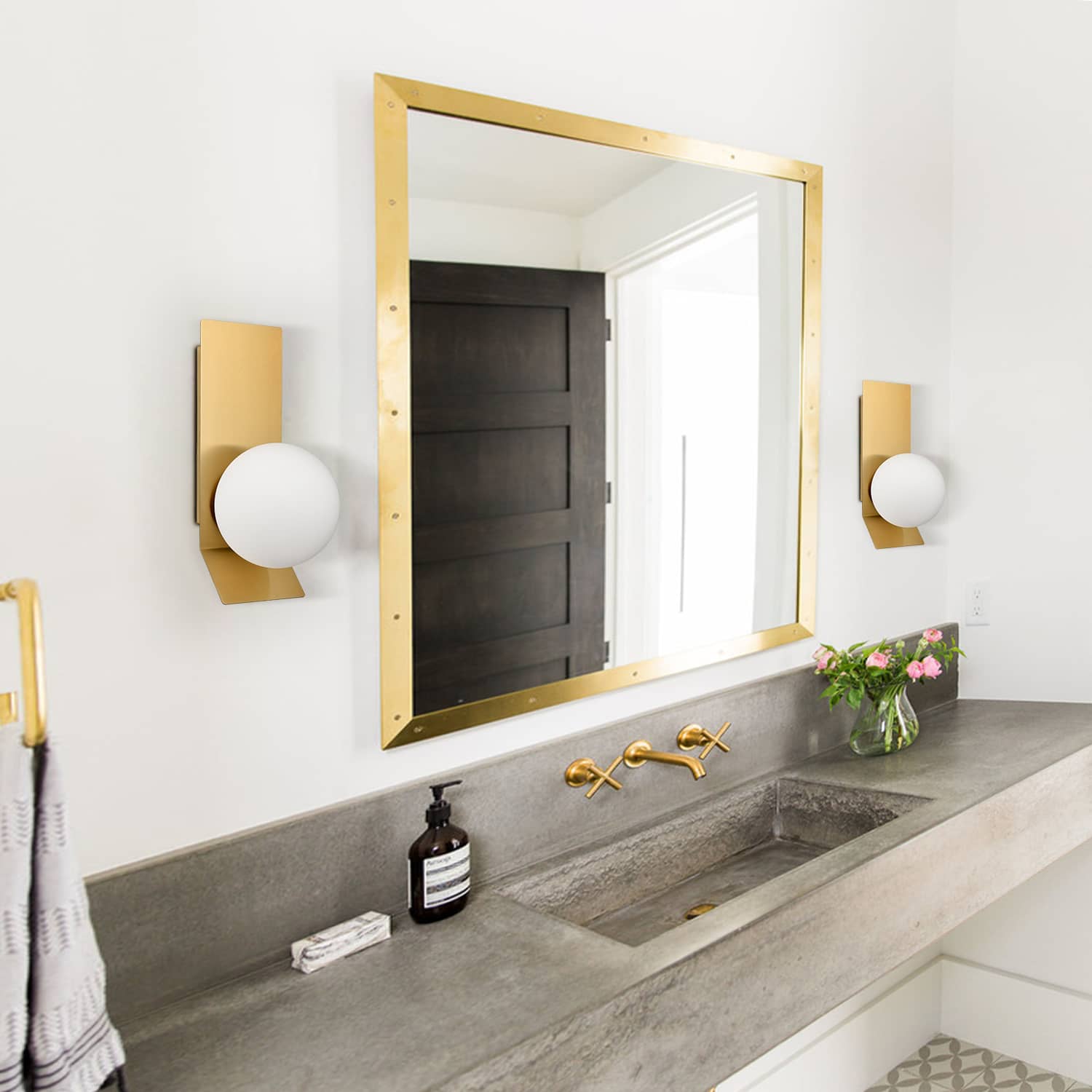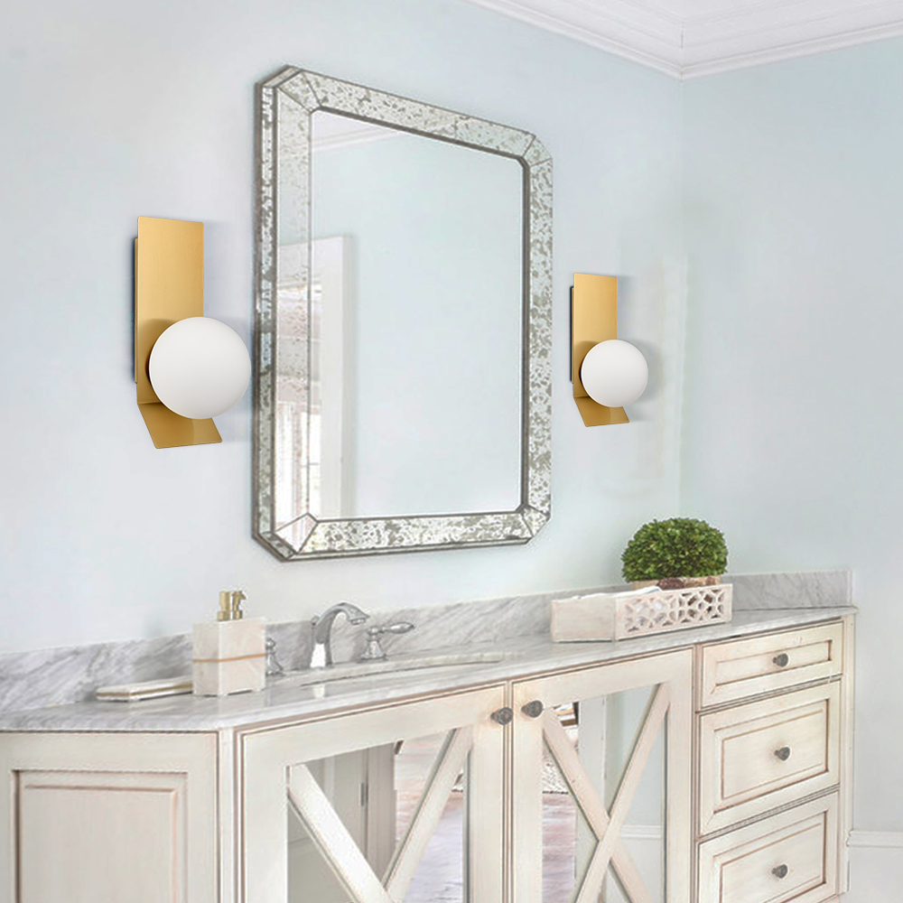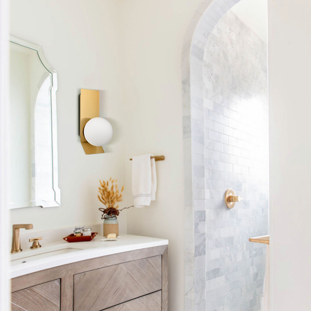 The modern brass wall sconce provides the perfect blend of mid-century classic and contemporary elements and completes the aesthetic with an elegant touch. The glass shade contrasts and competes with the brass finish, adding a ton of eye appeal and enhancing the piece's visual depth and beauty even further.
