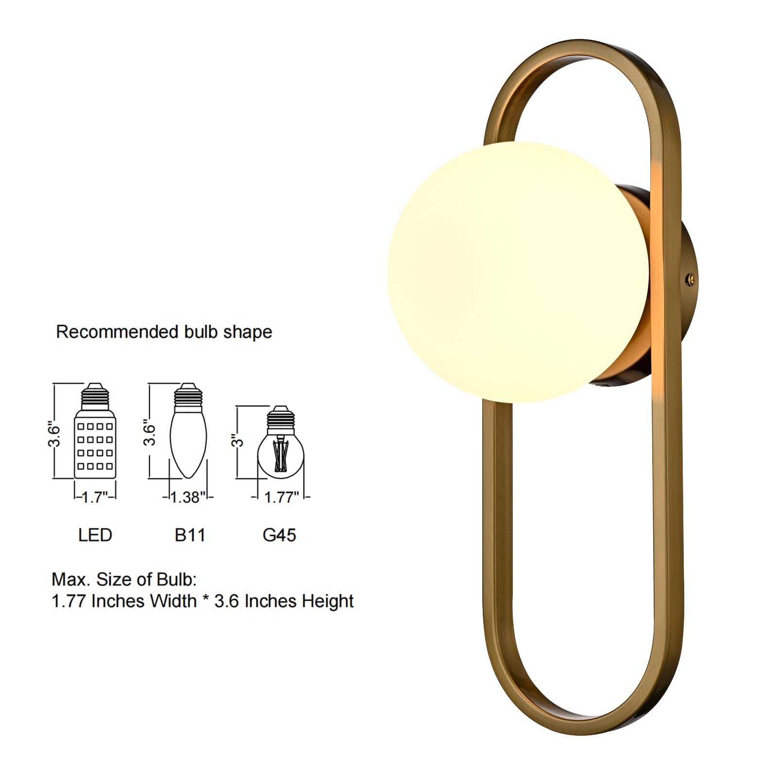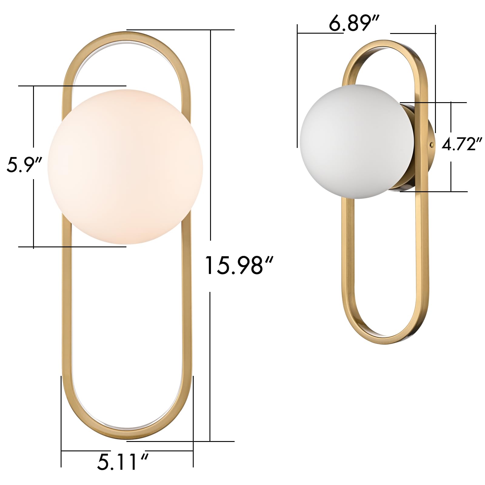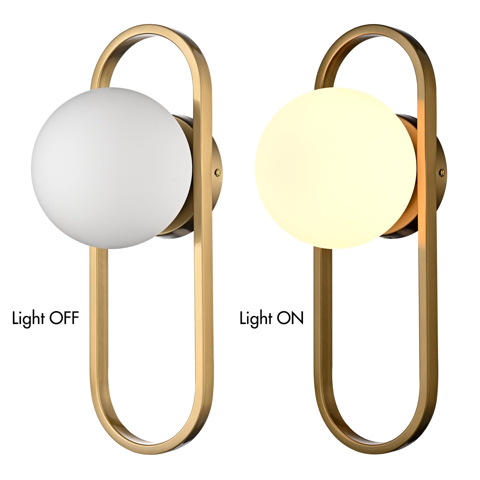 The gold wall sconces add glitzy sparkle to your interior with a rustproof gold finish. Constructed of impurity-free opaque and dreamy white glass, their glass globe shades give your interior a dash of modern sophistication. Their gleaming gold finish contrasts with the white glass shades and adds alluring visual interest to the space. Their metal frames flaunt a sleek curvature and show off an oval silhouette, adding a touch of geometry to your space.