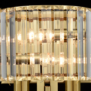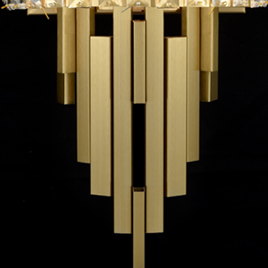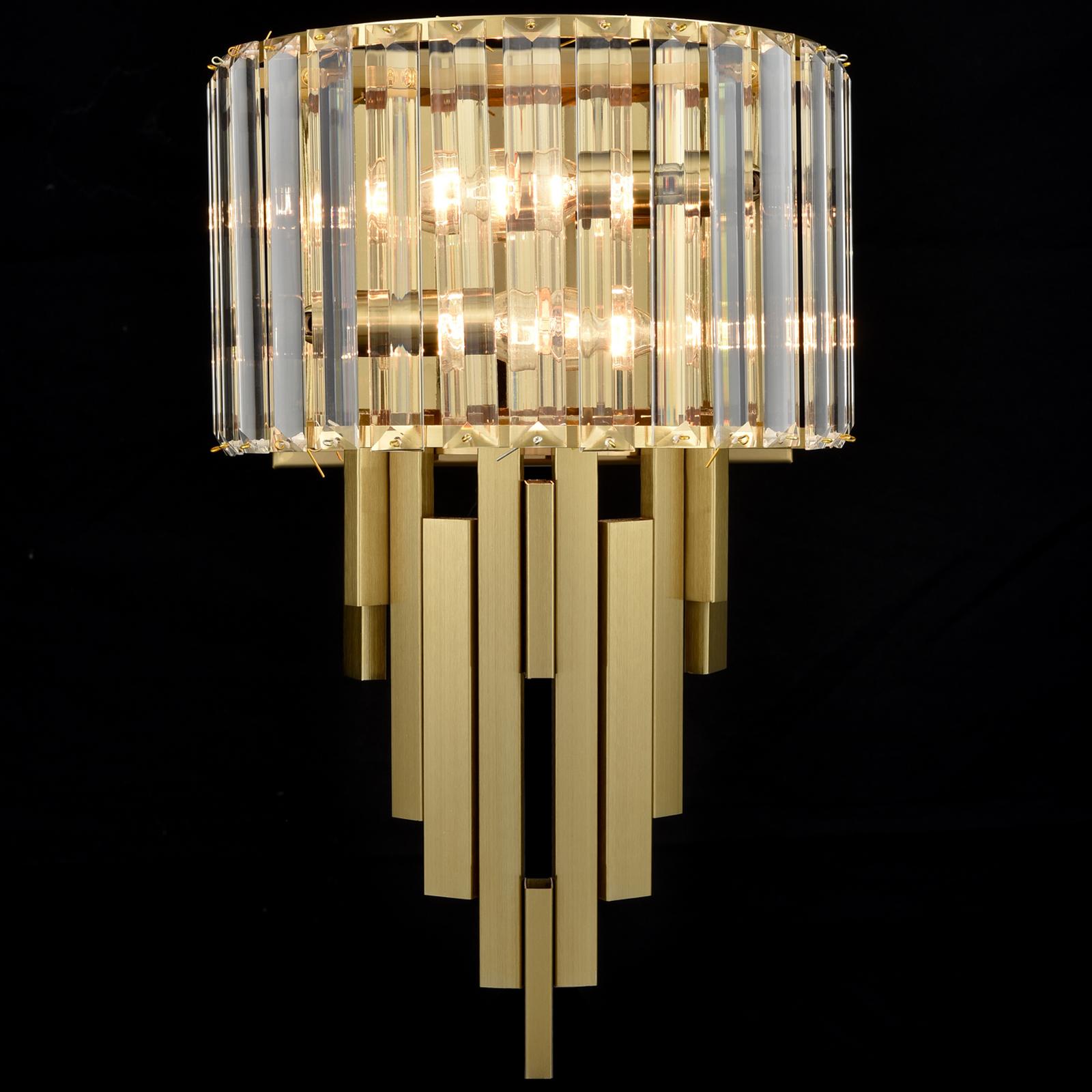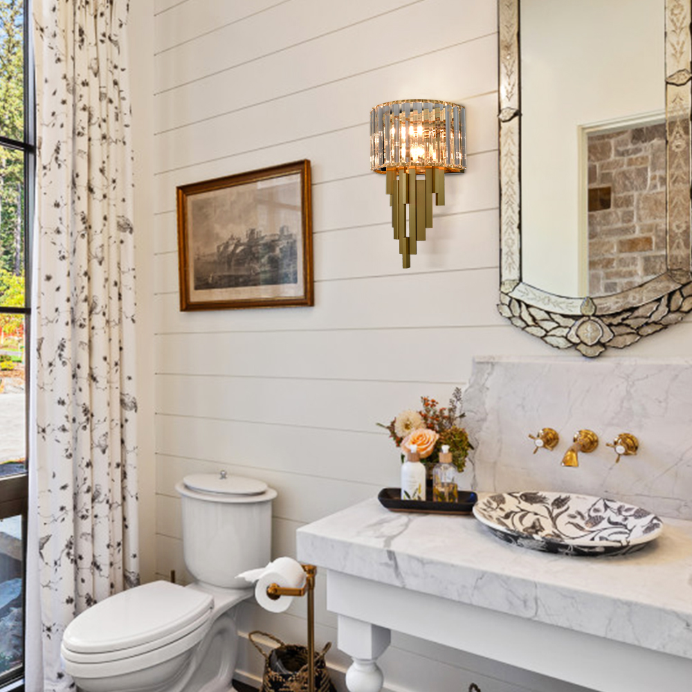 The 2-light gold metal wall light sports a stainless titanium gold finish, bringing a dash of metallic glitz to your living space. Being crafted of stainless steel, it is rustproof and durable. Dazzling beveled crystal prisms on the wall sconce are arranged in a semicircular pattern, which conceals the bulbs and draws the eye upward to a beautiful display of crystal and metal. It provides extra sparkle and a touch of luxury to your interior with the big, shimmery crystal pendant dangling in the middle of the W-shaped metal frame. The crystal accent contrasts and competes with the brass metal frame, enhancing the piece's visual depth and beauty even further.