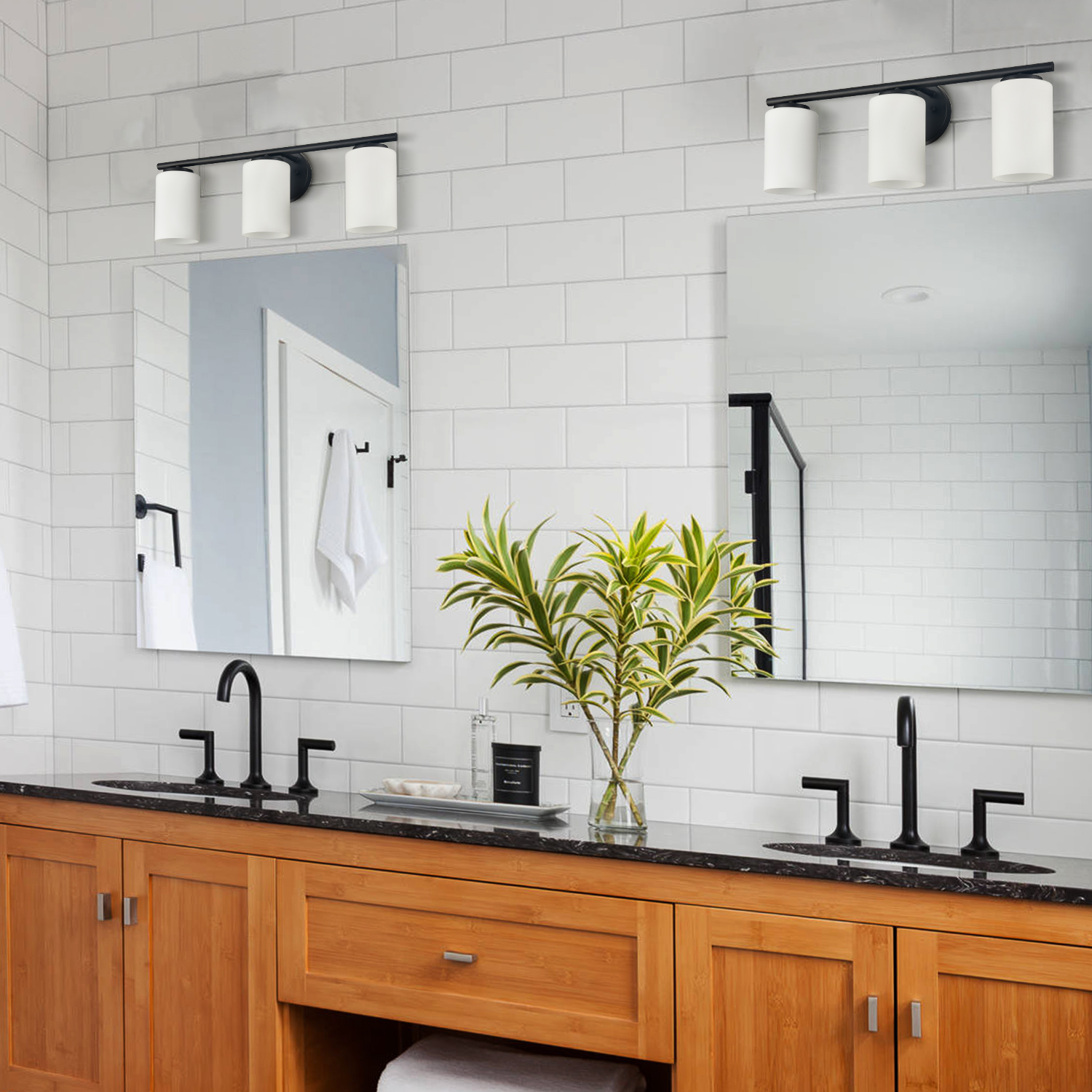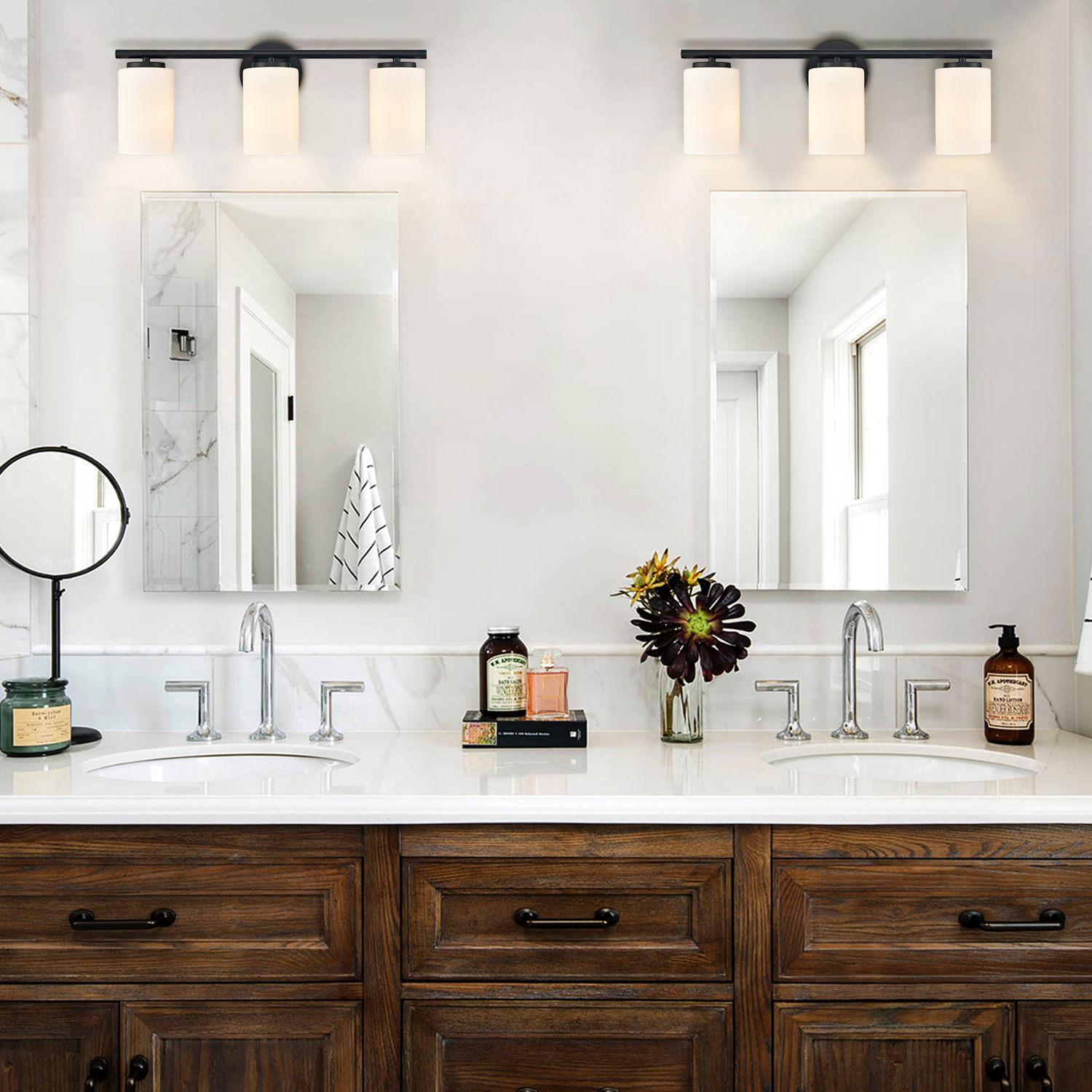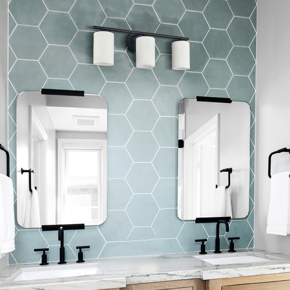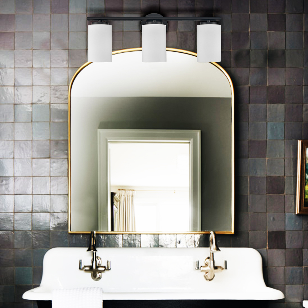 The 3-light black bathroom vanity light’s canopy, arm, and lamp holders give your living space a touch of urban sophistication with a semigloss black finish. Being crafted of impurity-free hand-blown white glass, three cylinder glass shades are held aloft by a rounded metal arm. Its white glass shades contrast the black finish and show off a classic black-and-white color combo. It offers the perfect blend of mid-century classic and contemporary elements and showcases the beauty of geometry. It can be mounted as an uplight or downlight to suit your different lighting needs.