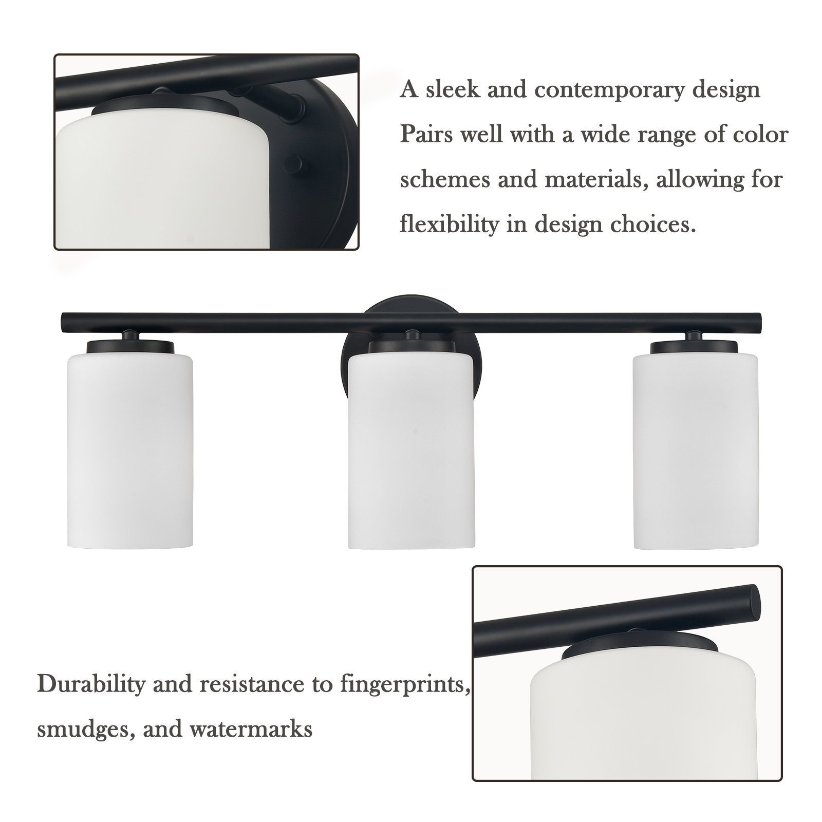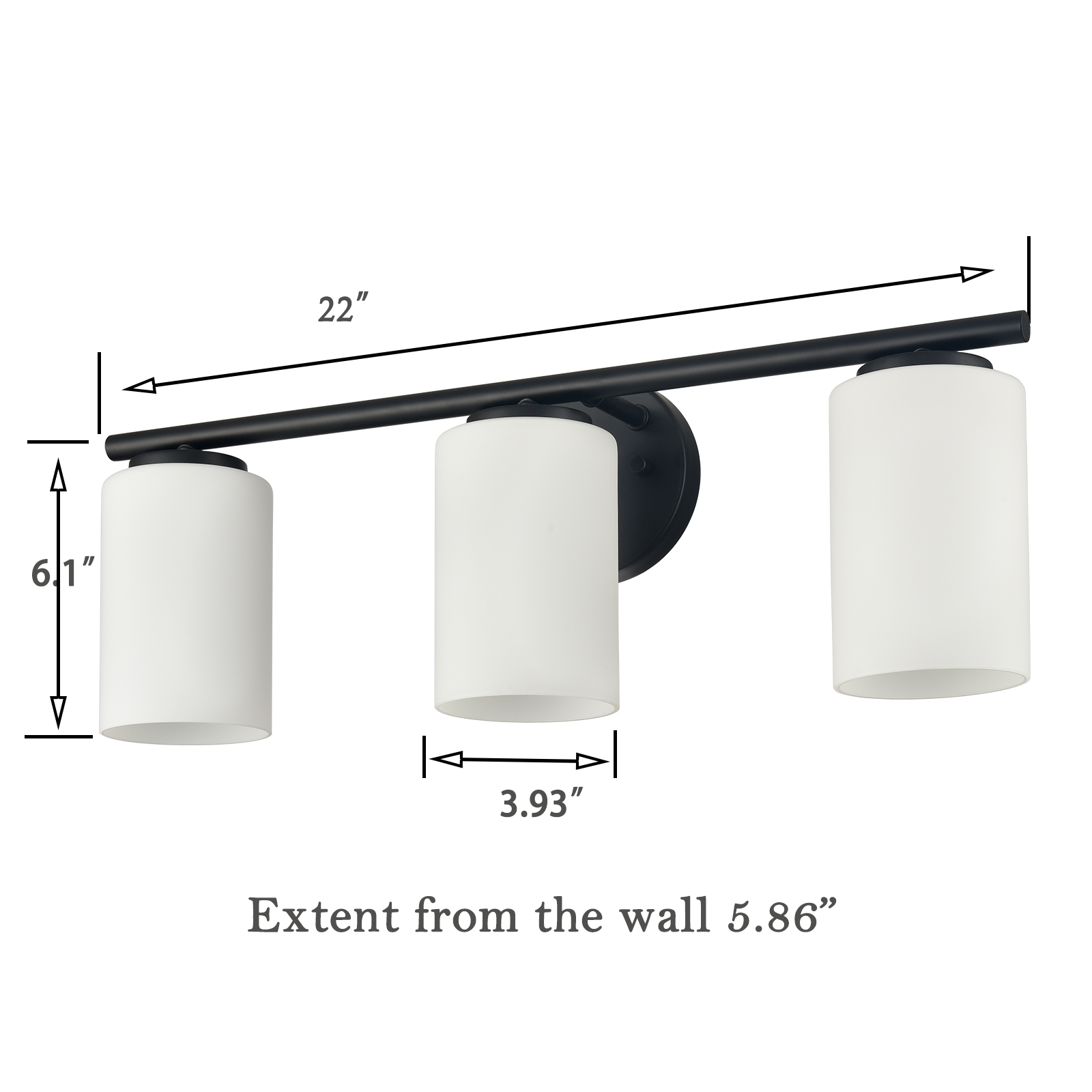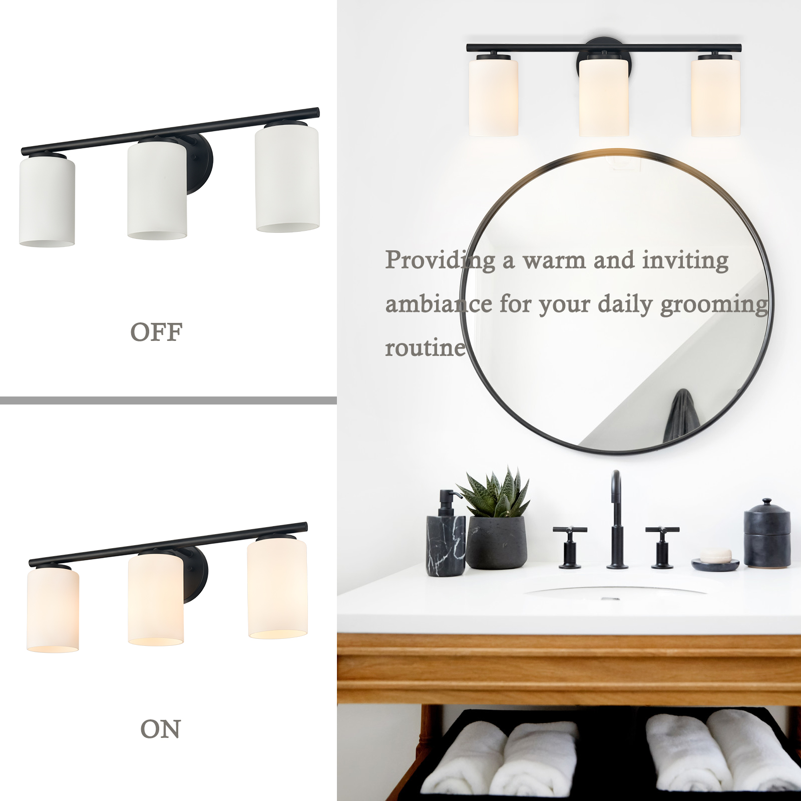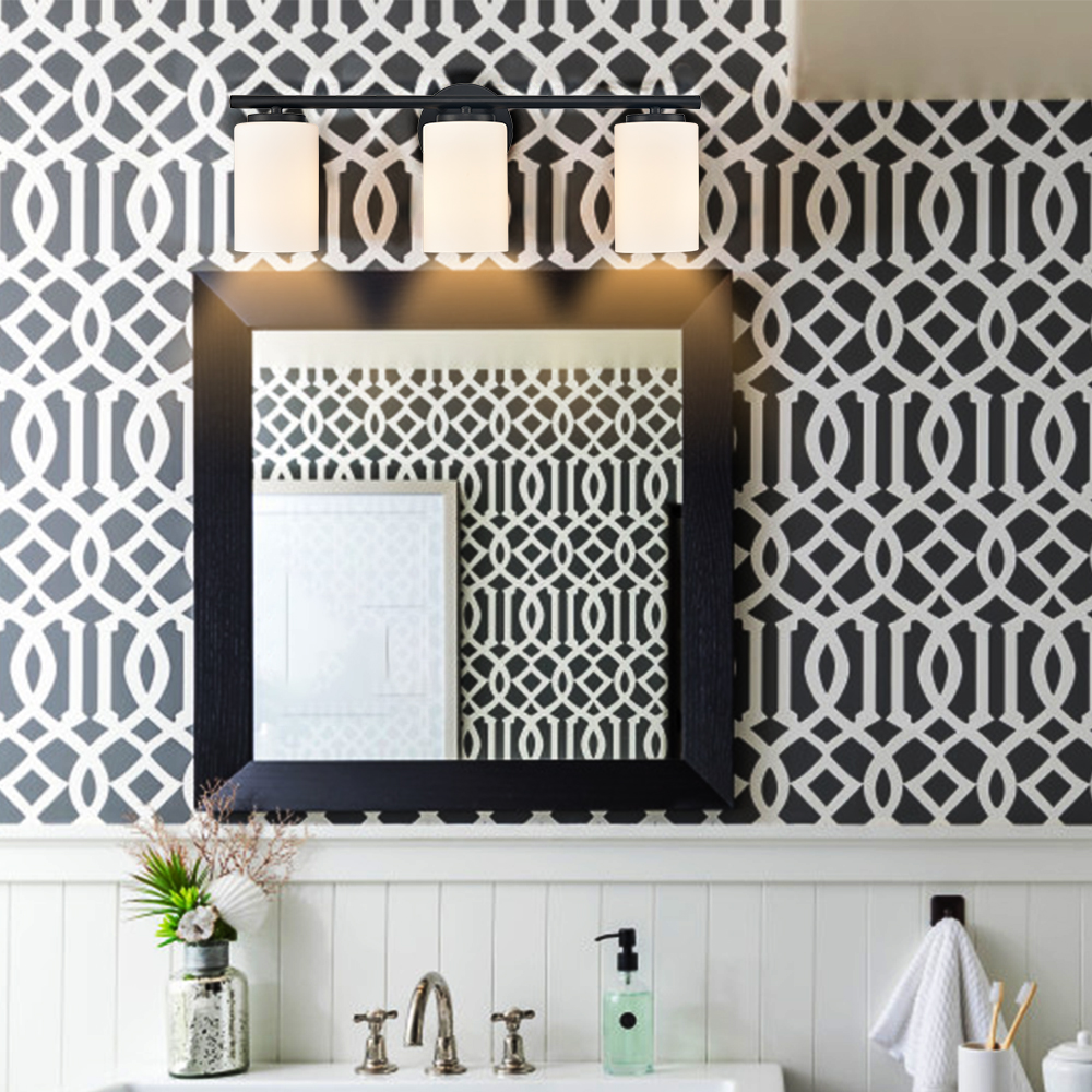The 3-light black bathroom vanity light’s canopy, arm, and lamp holders give your living space a touch of urban sophistication with a semigloss black finish. Being crafted of impurity-free hand-blown white glass, three cylinder glass shades are held aloft by a rounded metal arm. Its white glass shades contrast the black finish and show off a classic black-and-white color combo. It offers the perfect blend of mid-century classic and contemporary elements and showcases the beauty of geometry. It can be mounted as an uplight or downlight to suit your different lighting needs.