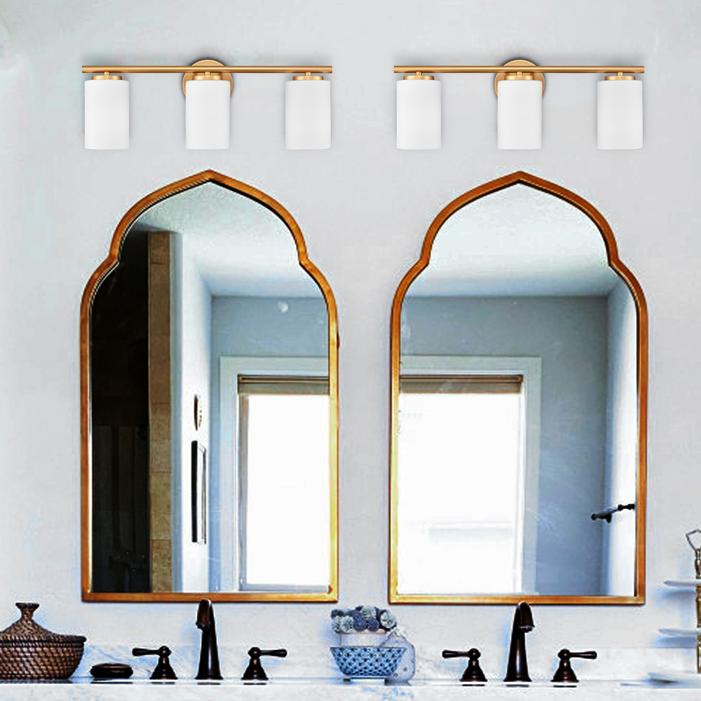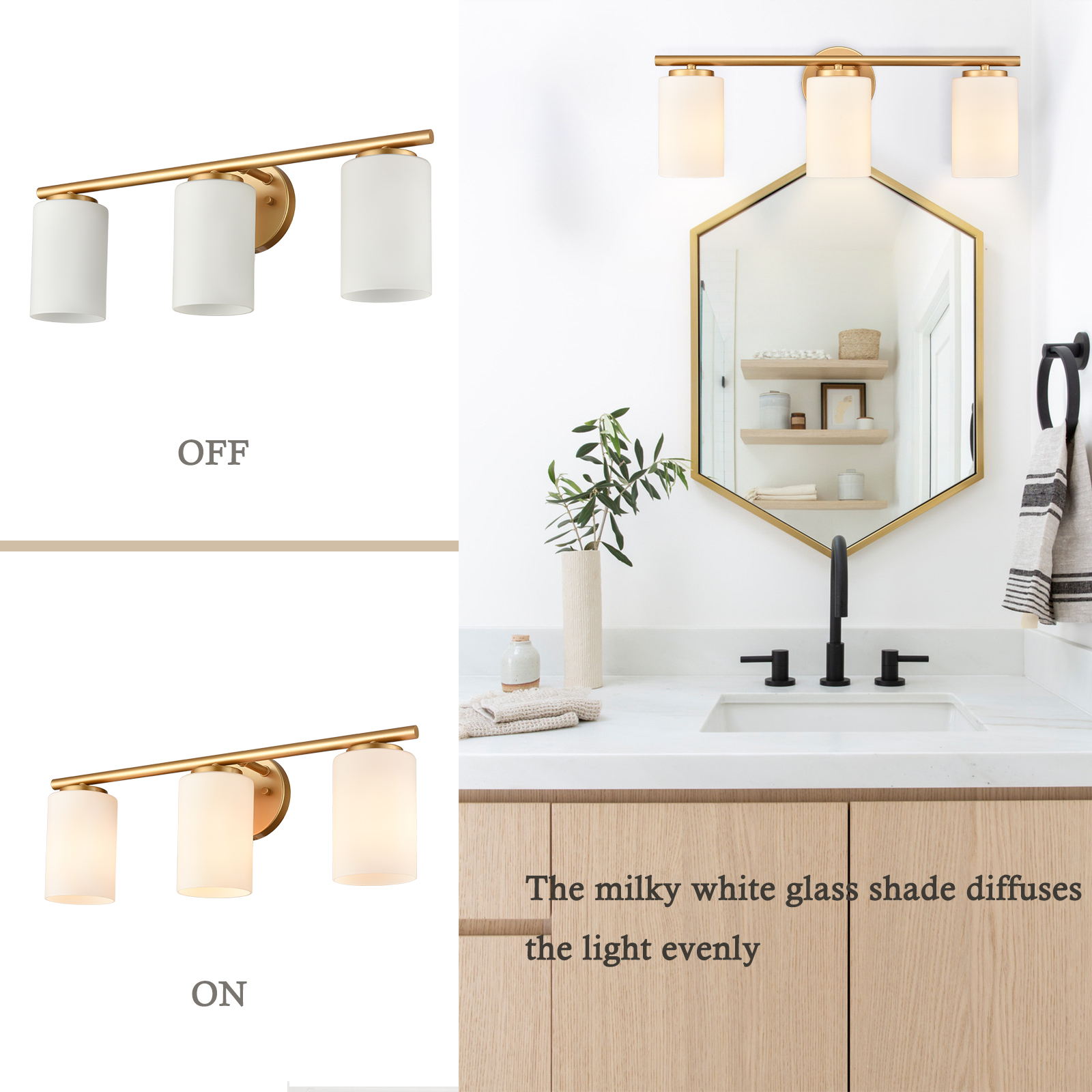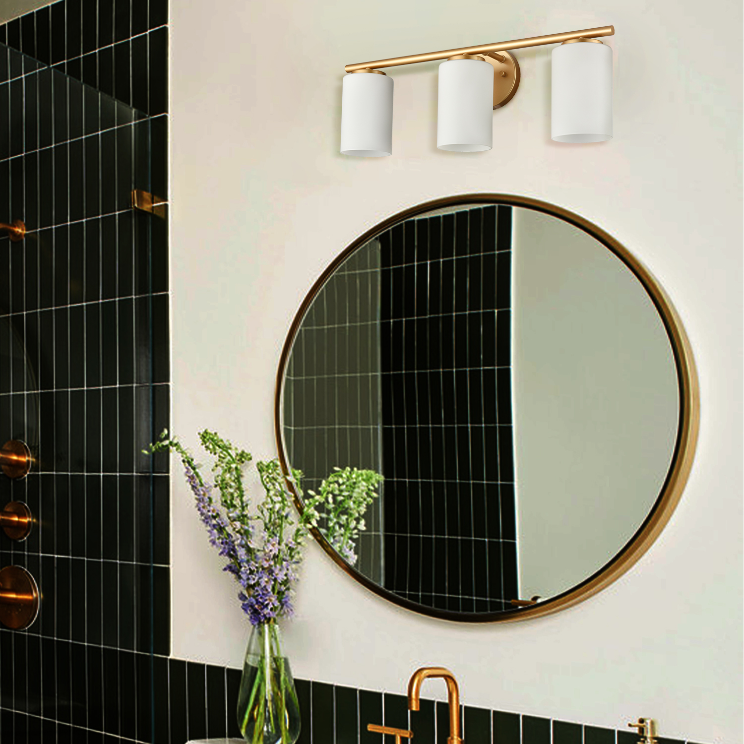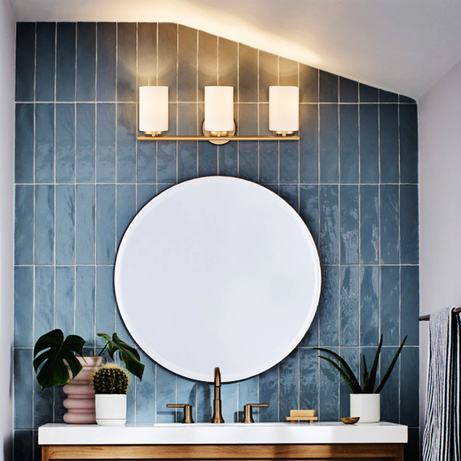 The 3-light gold bathroom vanity light’s canopy, arm, and lamp holders provide a stunning decorative detail and a boost of sparkle to your living space with a glossy gold finish. Being crafted of impurity-free hand-blown white glass, three cylinder glass shades are held aloft by a rounded metal arm. Its white glass shades contrast the shiny finish and introduce a large dose of texture to the space. It offers the perfect blend of mid-century classic and contemporary elements and showcases the beauty of geometry. It can be mounted as an uplight or downlight to suit your different lighting needs.