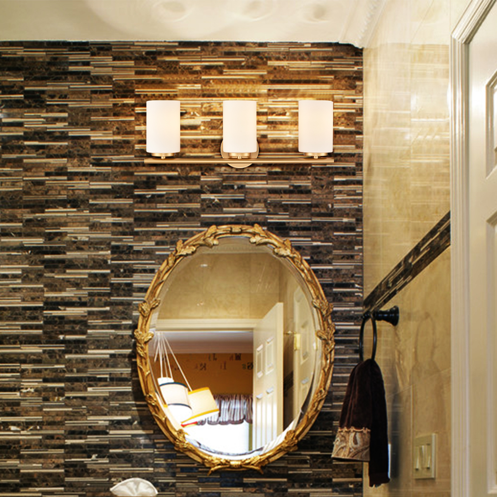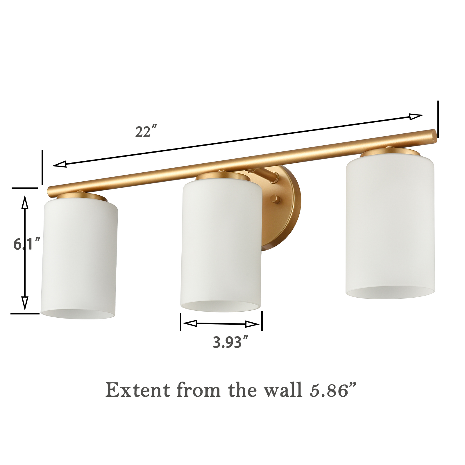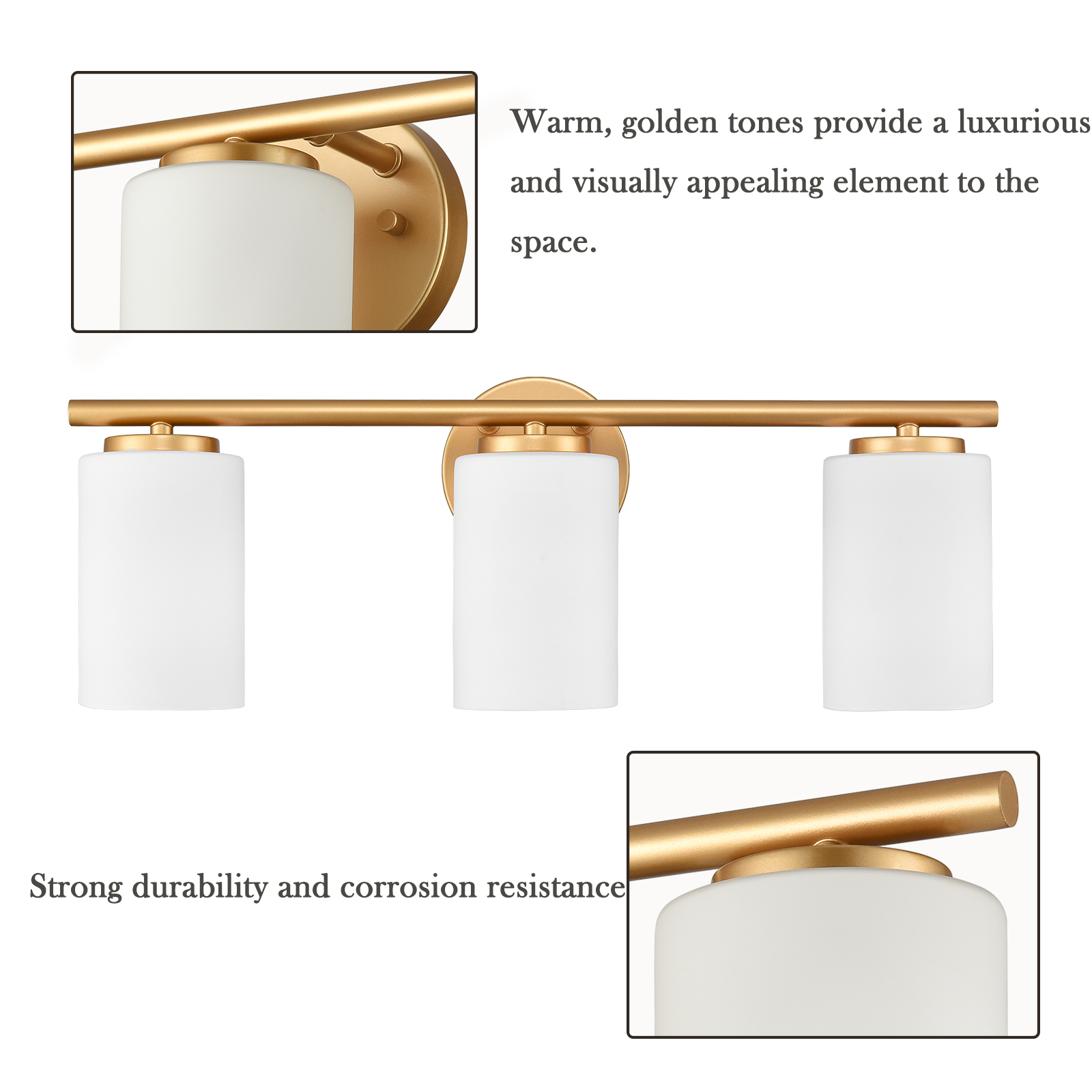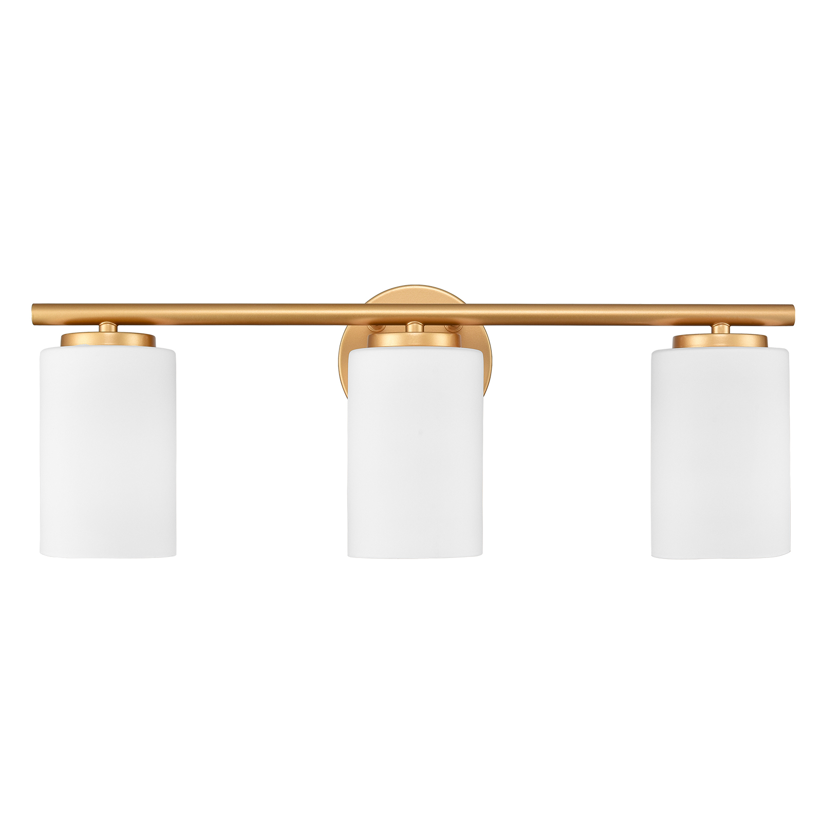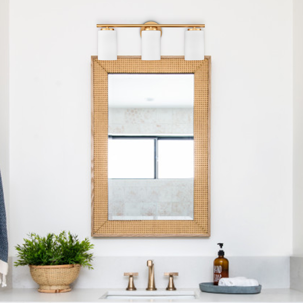 The 3-light gold bathroom vanity light’s canopy, arm, and lamp holders provide a stunning decorative detail and a boost of sparkle to your living space with a glossy gold finish. Being crafted of impurity-free hand-blown white glass, three cylinder glass shades are held aloft by a rounded metal arm. Its white glass shades contrast the shiny finish and introduce a large dose of texture to the space. It offers the perfect blend of mid-century classic and contemporary elements and showcases the beauty of geometry. It can be mounted as an uplight or downlight to suit your different lighting needs.
