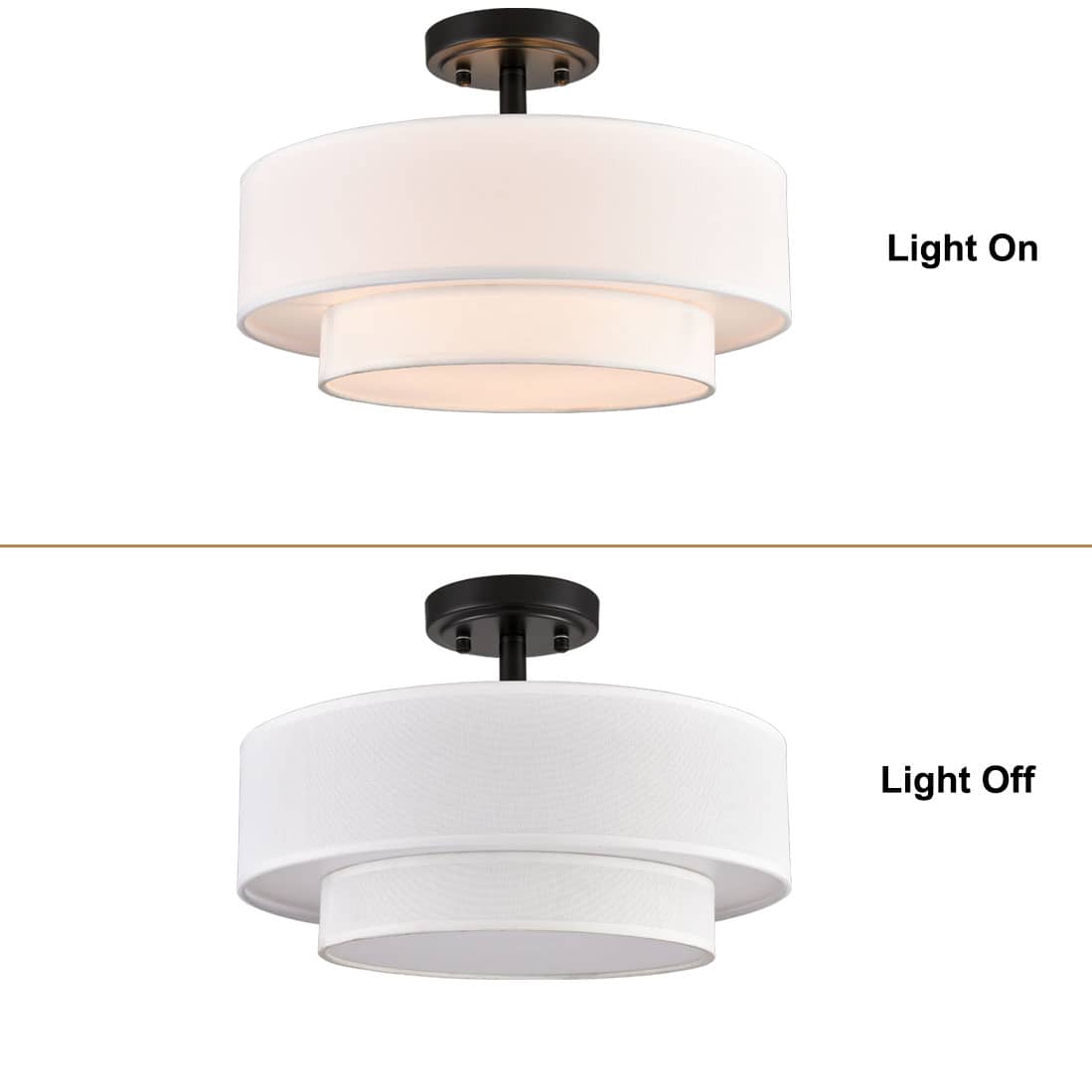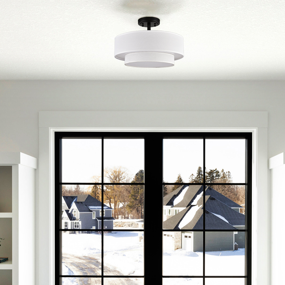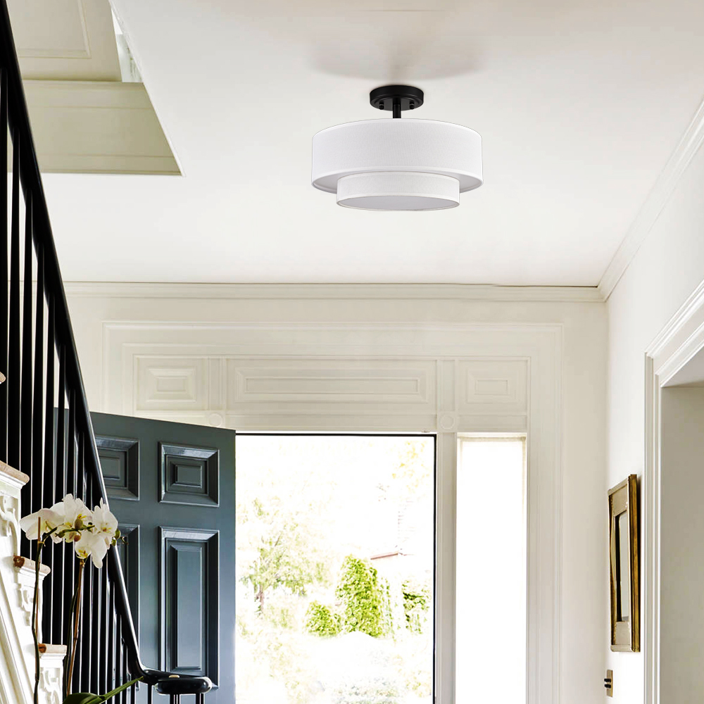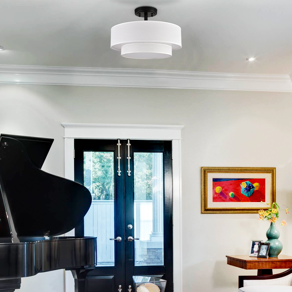 The 3-light semi flush ceiling light flaunts a rustproof semigloss black finish, giving your living space a touch of modern sophistication. It doubles up on the white linen drum shades, creating layers of nuanced light. The 2-tiered drum shade adds a ton of eye appeal and delivers sleek, clean, and minimalistic elegance to the interior. The light pouring through the linen drum shade is gently muted and fills the room without any glare. Its rounded drum shade gives your home a touch of geometry. Its black finish contrasts the white linen drum shade and brings rich visual interest to your interior with a black-and-white classic color combo.