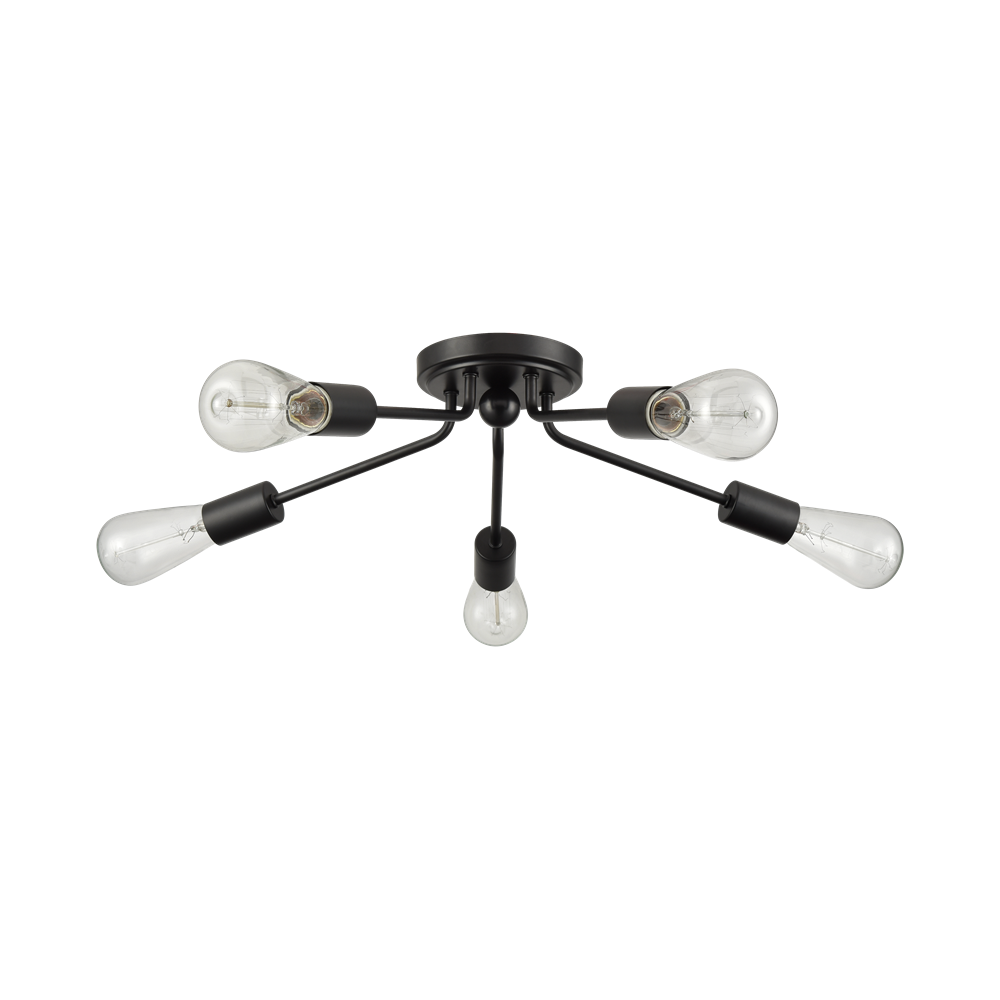 The sputnik flush mount ceiling light sports a rustproof black finish, livening up your home with a dash of drama. Its five curved arms spread light in all directions and each arm carries an exposed bulb at the end. Its futuristic design effortlessly casts a decorative pattern and brings a touch of modern sophistication to your interior. This fashionable fixture flaunts a stunning starburst silhouette, providing depth, dimension, and a touch of whimsy to your space. It adds a ton of eye appeal and enhances the piece's visual depth and beauty even further.