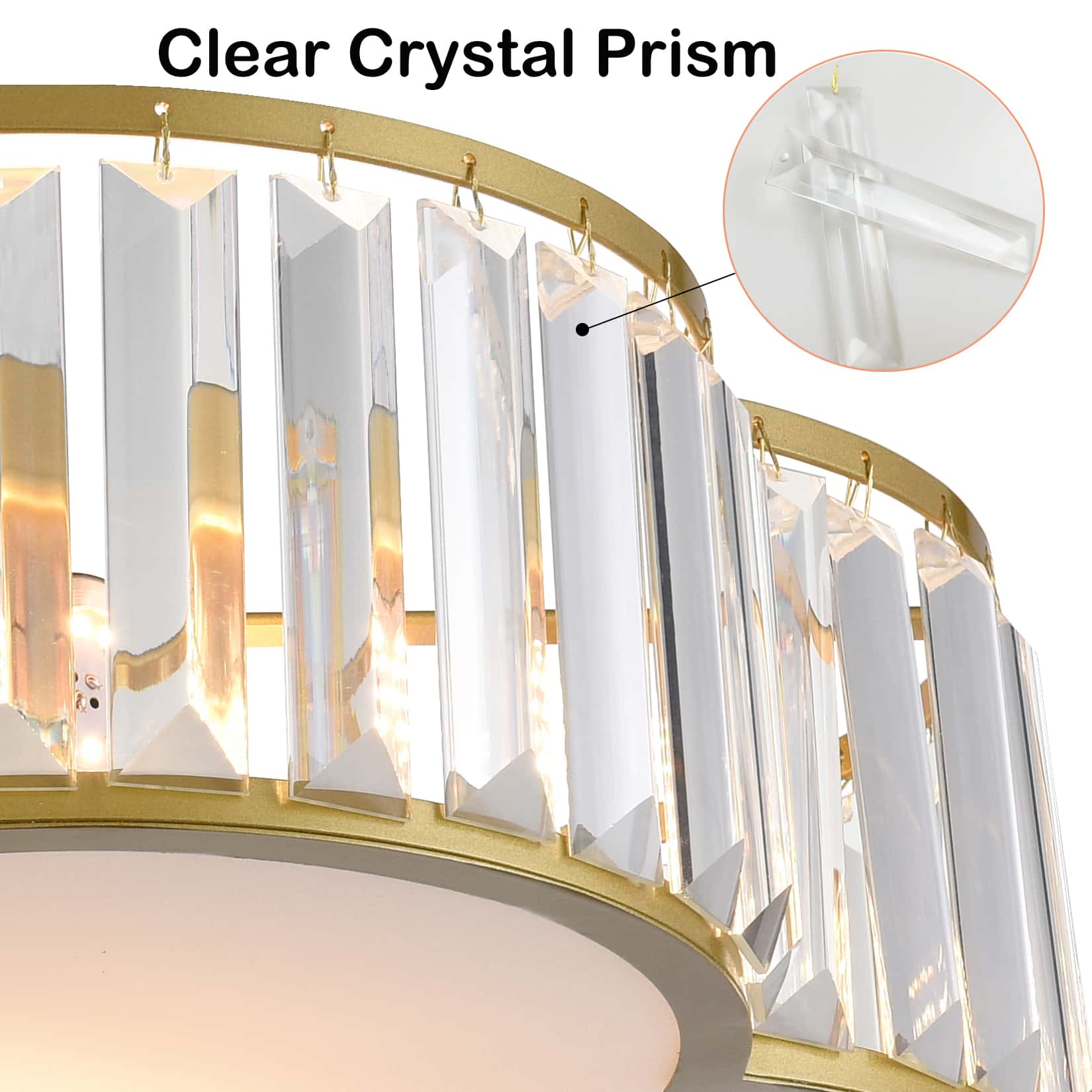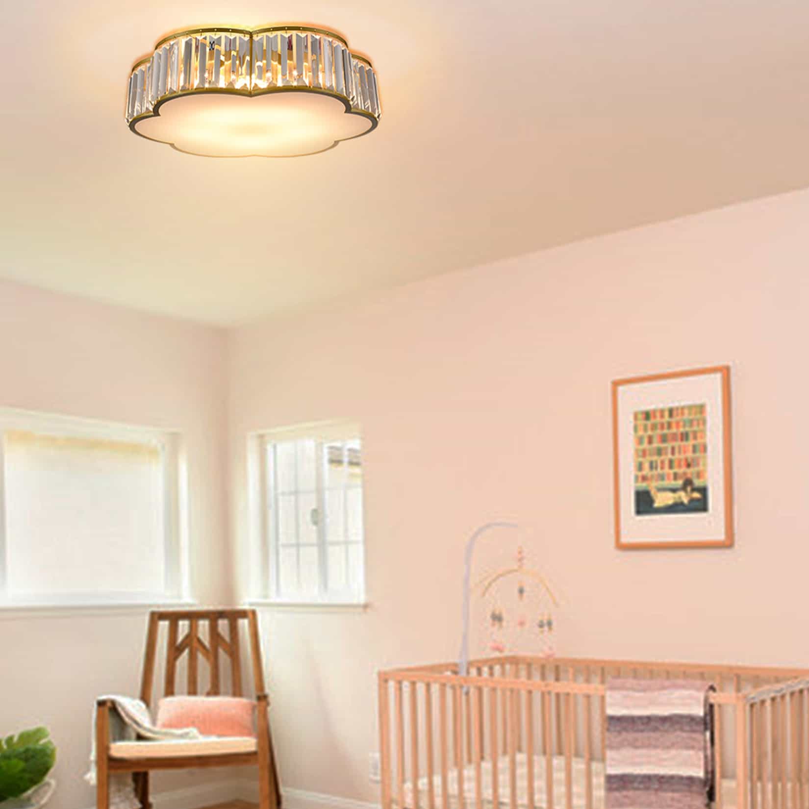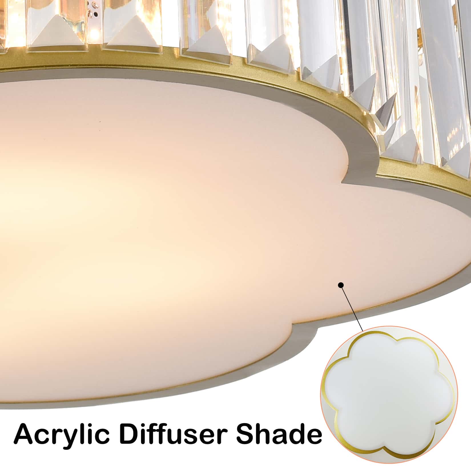 The modern crystal ceiling light is sure to draw the eye upward and adds glitzy sparkle to the space with its breath-taking gold finish. It sports a scalloped drum shade decorated with angular K9 crystal prisms. Offering a surprising twist, it delivers a huge dose of contemporary sparkle and a luxurious touch to your interior. It casts gorgeous light rays throughout your space while the light bounces and reflects off the crystal prisms to create bright, intriguing light effects and shades. Its gleaming finish contrasts the airy crystal drum shade and serves as eye candy. It is a show-stopping addition to your home with its crystal accent.