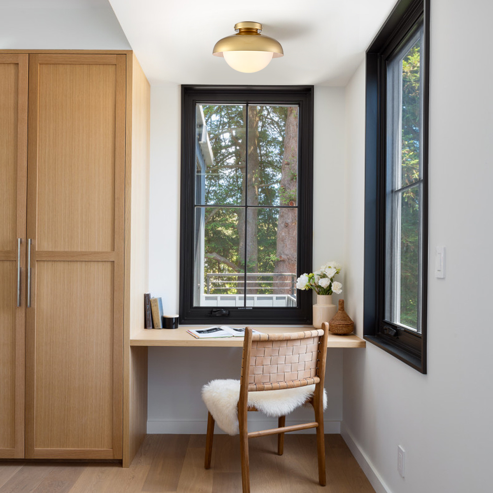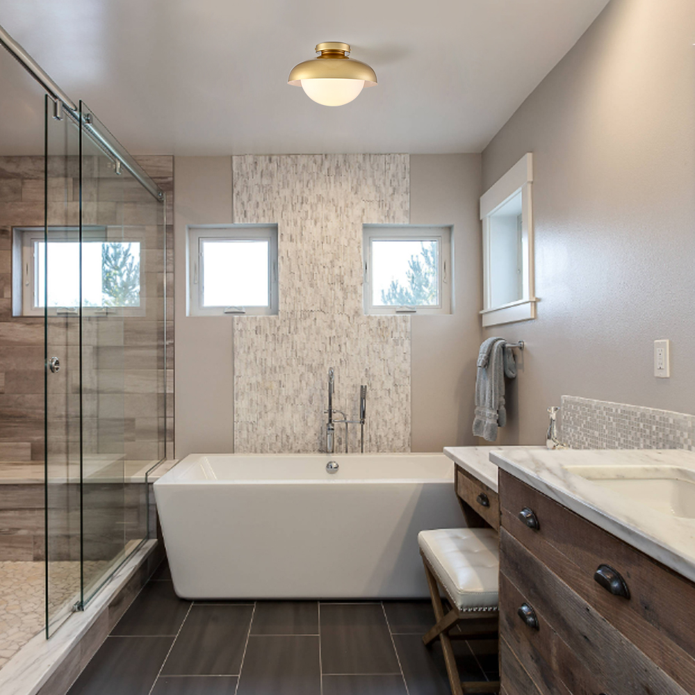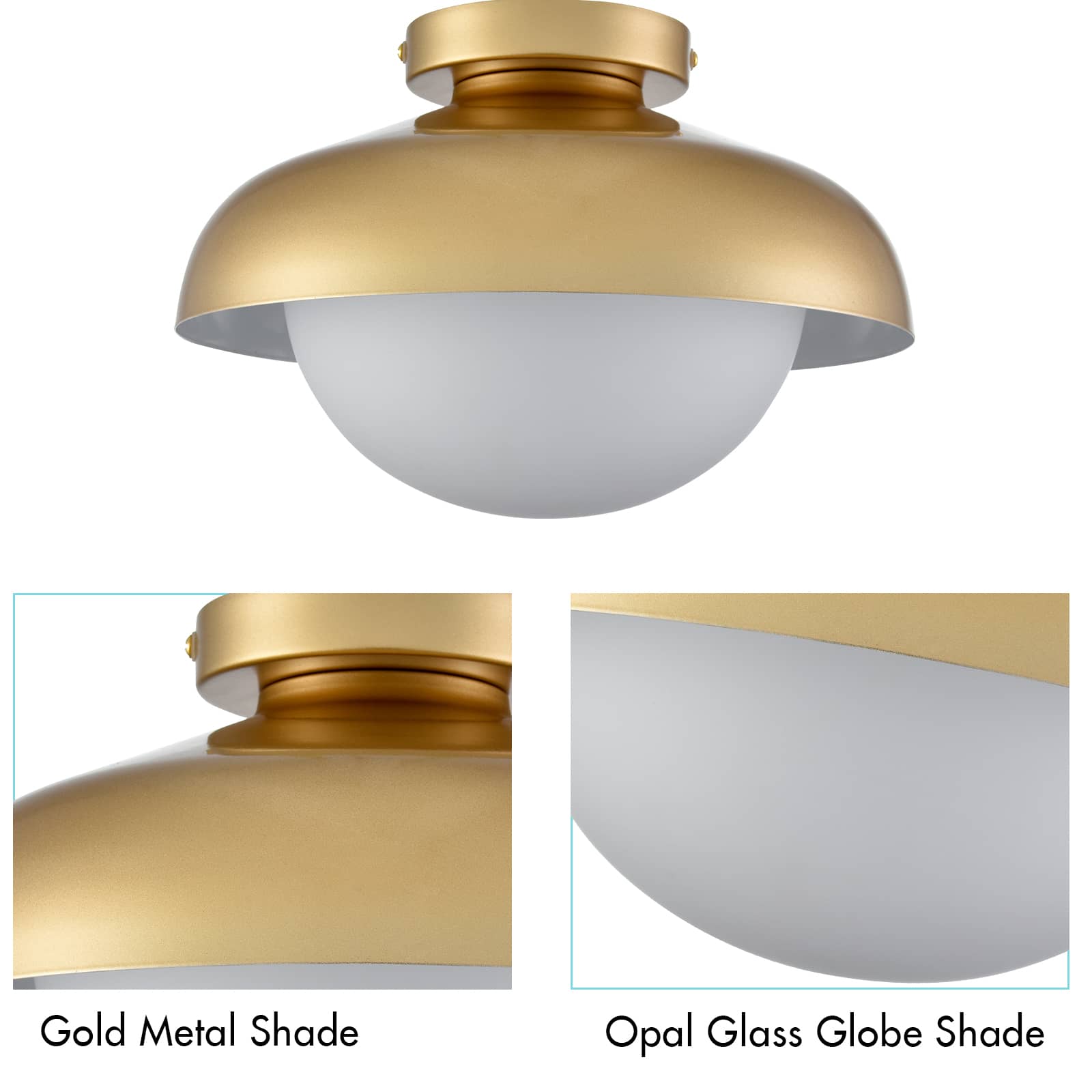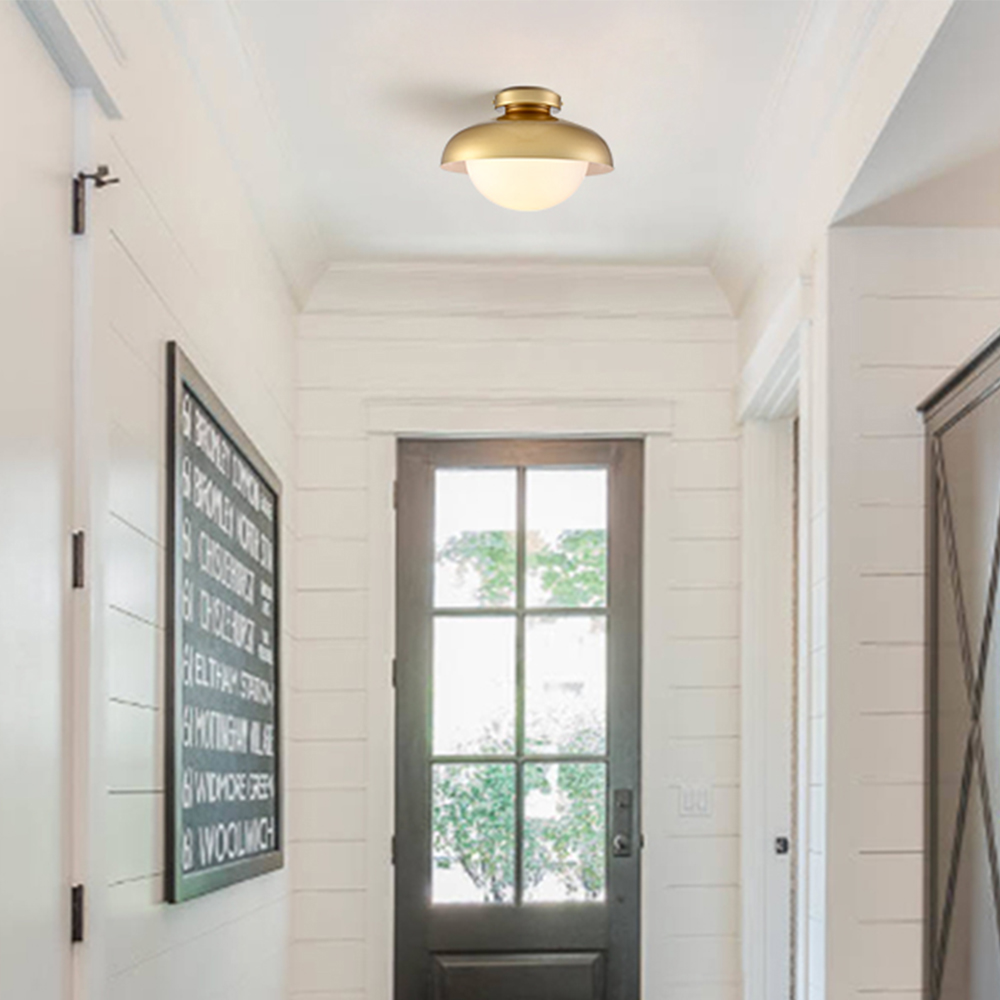 The barn ceiling light’s canopy and metal barn shade protecting the milk glass shade give your living space a nice pop of sparkle with a gold finish. Its mix of finishes encompasses both a dash of drama and a touch of modernity, yet maintains an industrial edge. The barn shade boasts a white interior to maximize reflectivity. Crafted from impurity-free hand-blown glass, its milk glass shade distributes light evenly to avoid shadows. The globe shade rounds out the design and elevates your interior with a touch of geometry. Its gold finish offers a stark contrast to the milk glass shade and adds alluring eye appeal to the space.