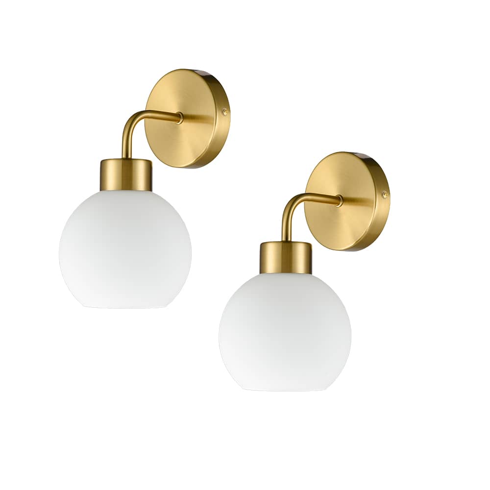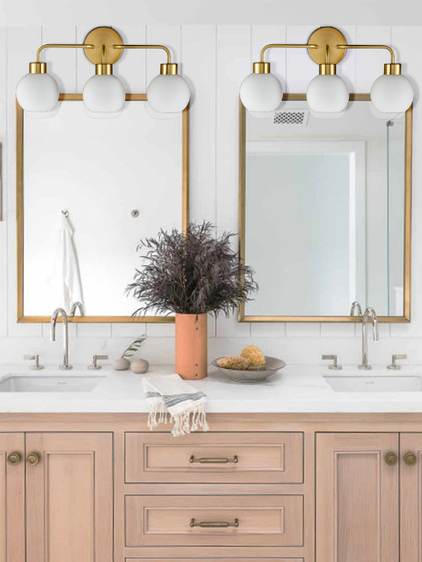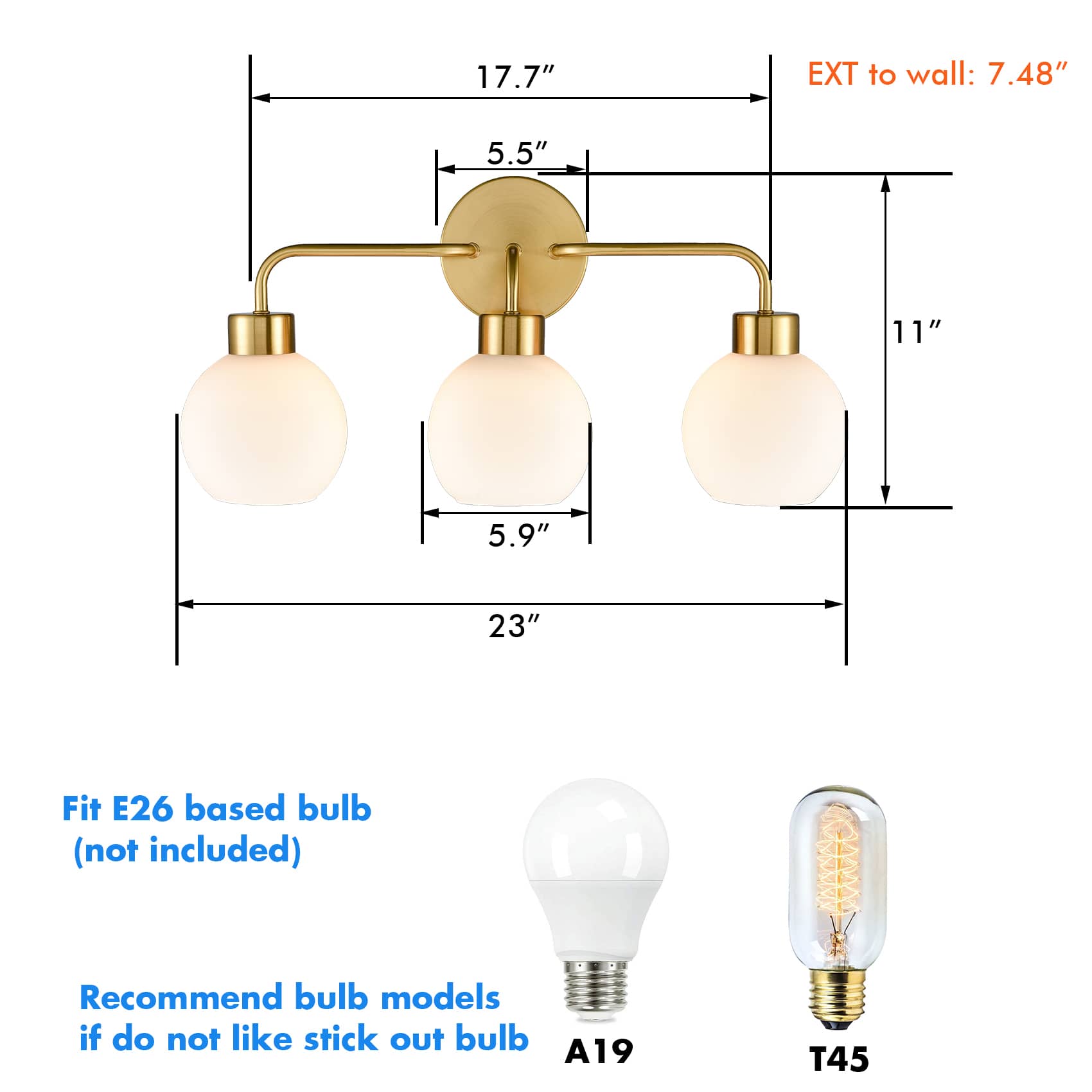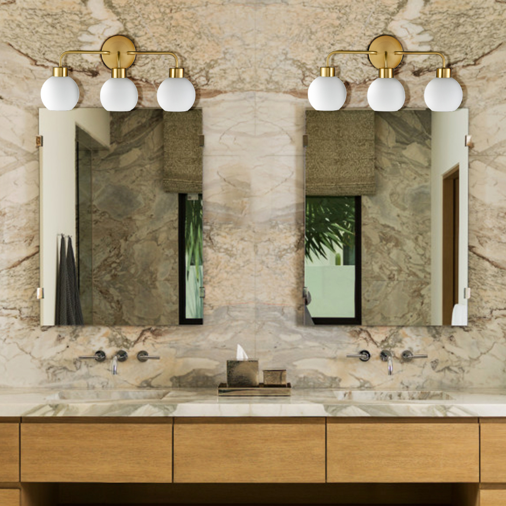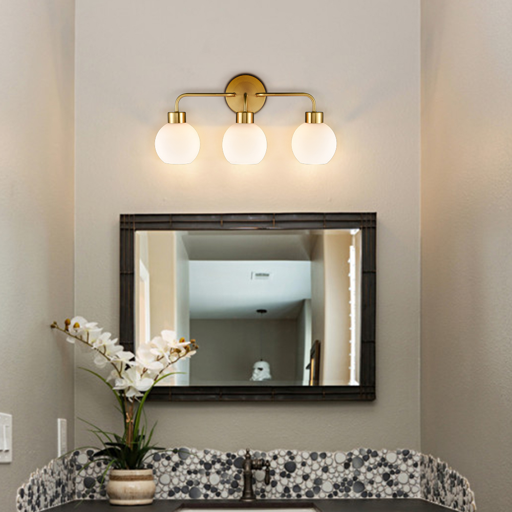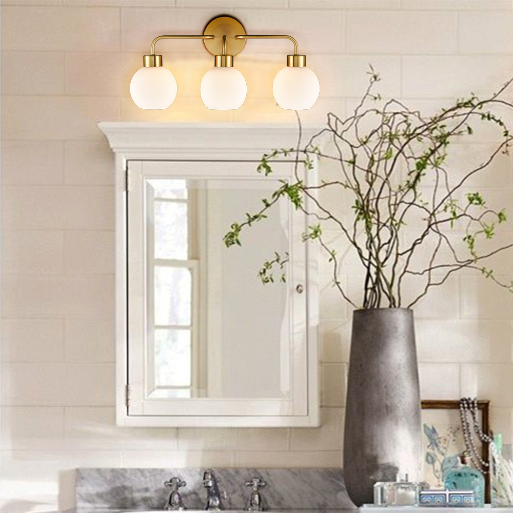 The 3-Light modern bath vanity light's canopy, arms, and lampholders boast a rustproof electrophoretic brass finish, enlivening your interior with a glint of glamour. Crafted from impurity-free opaque opal glass, it provides the perfect blend of mid-century classic and modern elements. Its gleaming brass finish contrasts the opal glass shades and adds alluring visual interest to the space. It is a glamorous addition to your home with its shimmery accent. It is the perfect fixture to transform your bar, bathroom, and bedroom.