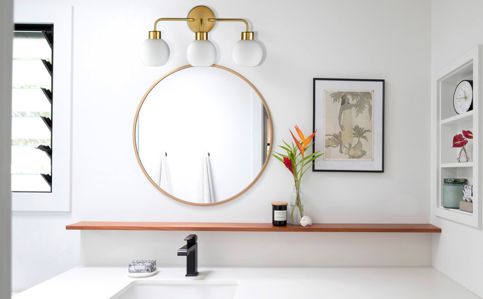 The 3-Light modern bath vanity light's canopy, arms, and lampholders boast a rustproof electrophoretic brass finish, enlivening your interior with a glint of glamour. Crafted from impurity-free opaque opal glass, it provides the perfect blend of mid-century classic and modern elements. Its gleaming brass finish contrasts the opal glass shades and adds alluring visual interest to the space. It is a glamorous addition to your home with its shimmery accent. It is the perfect fixture to transform your bar, bathroom, and bedroom.