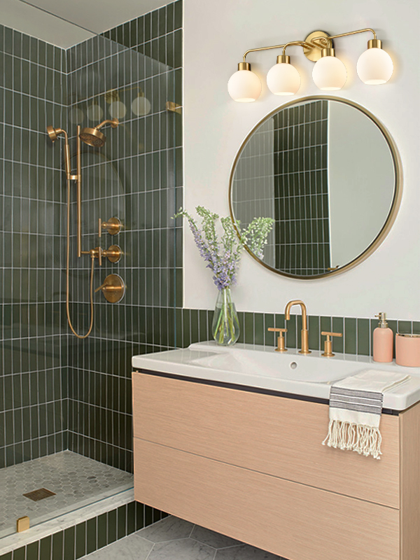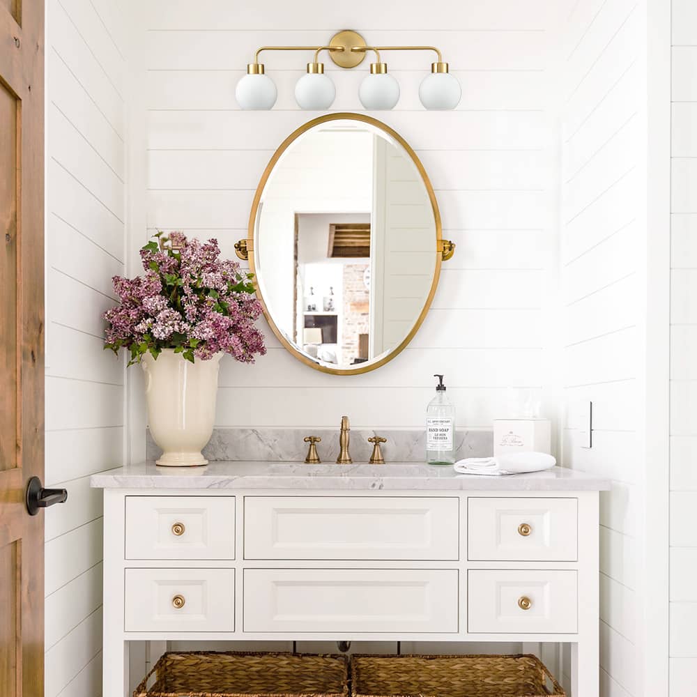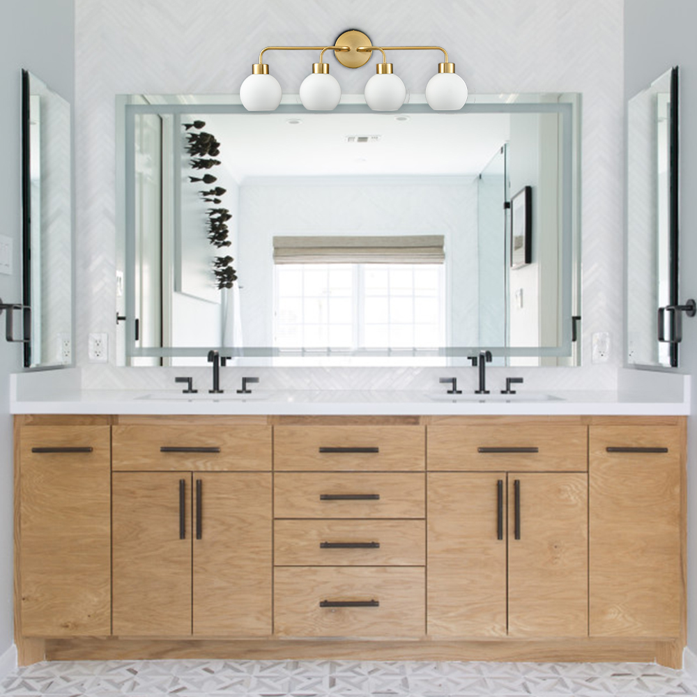 The 4-Light modern bath vanity light's canopy, arms, and lampholders boast a rustproof electrophoretic brass finish, enlivening your interior with a glint of glamour. Crafted from impurity-free opaque opal glass, it provides the perfect blend of mid-century classic and modern elements. Its gleaming brass finish contrasts the opal glass shades and adds alluring visual interest to the space. It is a glamorous addition to your home with its shimmery accent. It is the perfect fixture to transform your bar, bathroom, and bedroom.