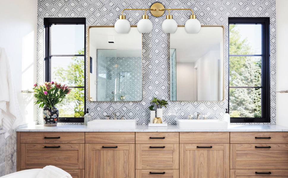 The 4-Light modern bath vanity light's canopy, arms, and lampholders boast a rustproof electrophoretic brass finish, enlivening your interior with a glint of glamour. Crafted from impurity-free opaque opal glass, it provides the perfect blend of mid-century classic and modern elements. Its gleaming brass finish contrasts the opal glass shades and adds alluring visual interest to the space. It is a glamorous addition to your home with its shimmery accent. It is the perfect fixture to transform your bar, bathroom, and bedroom.