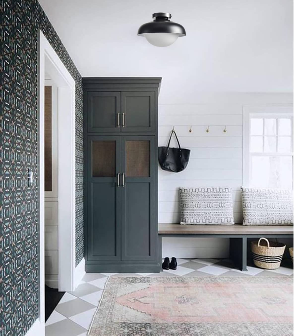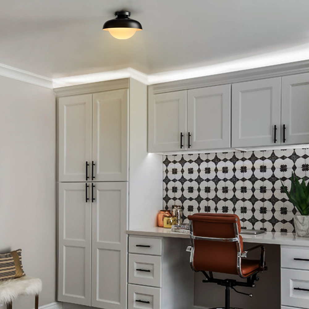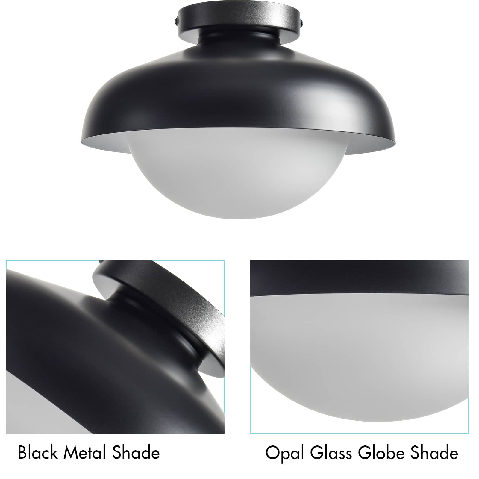 The black barn ceiling light’s canopy sports a dark gray finish, lending an understated elegance. Its metal barn shade protecting the opal glass globe boasts a rustproof black finish. Its mix of finishes encompasses both a dash of drama and a touch of modernity, yet maintains an industrial edge. Crafted from impurity-free hand-blown glass, its opal glass shade distributes light evenly to avoid shadows. The globe shade rounds out the design and elevates your interior with a touch of geometry. Its dark gray finish and the black barn shade offer a stark contrast to the opal glass shade and add alluring eye appeal to the space.
